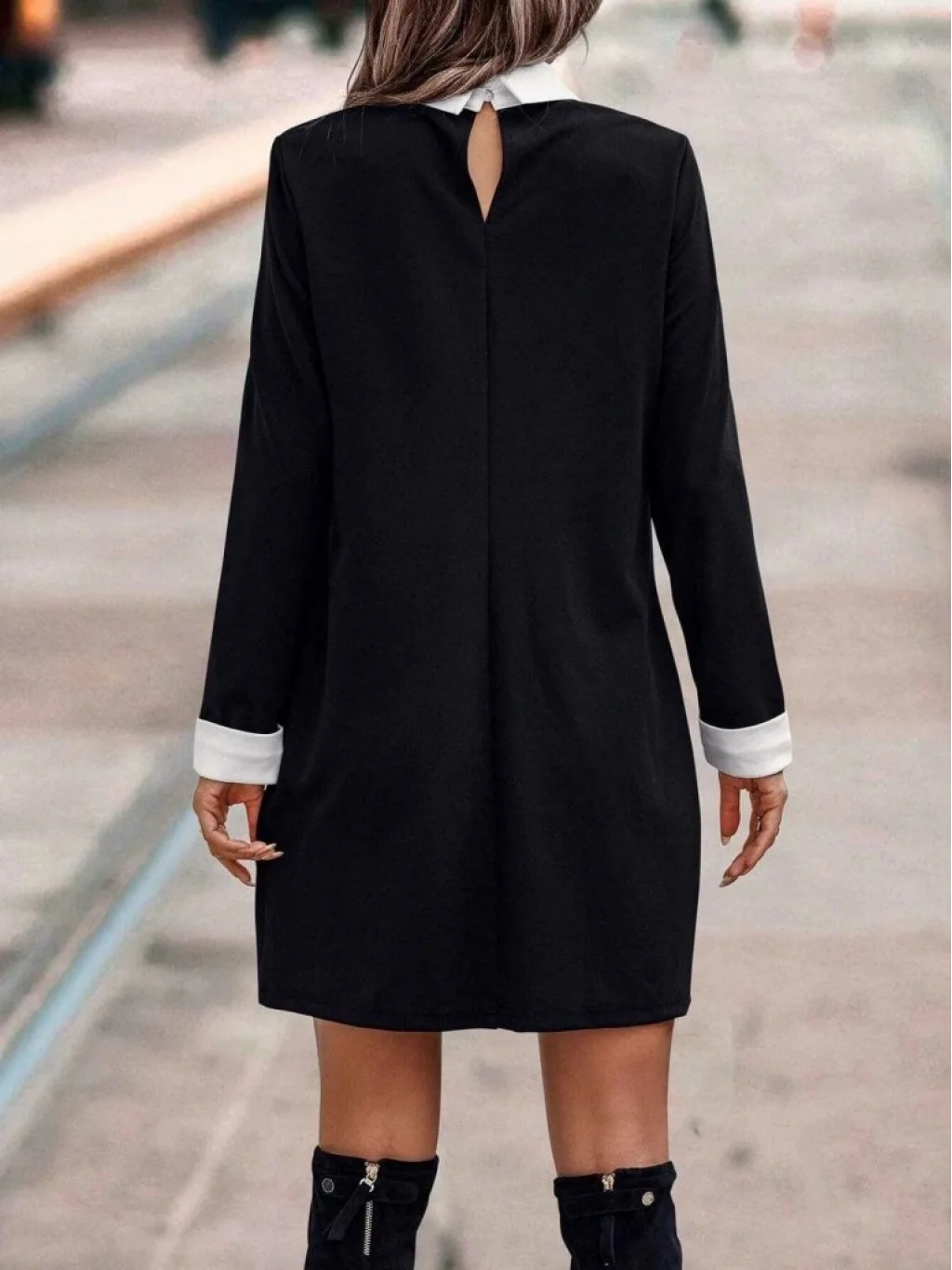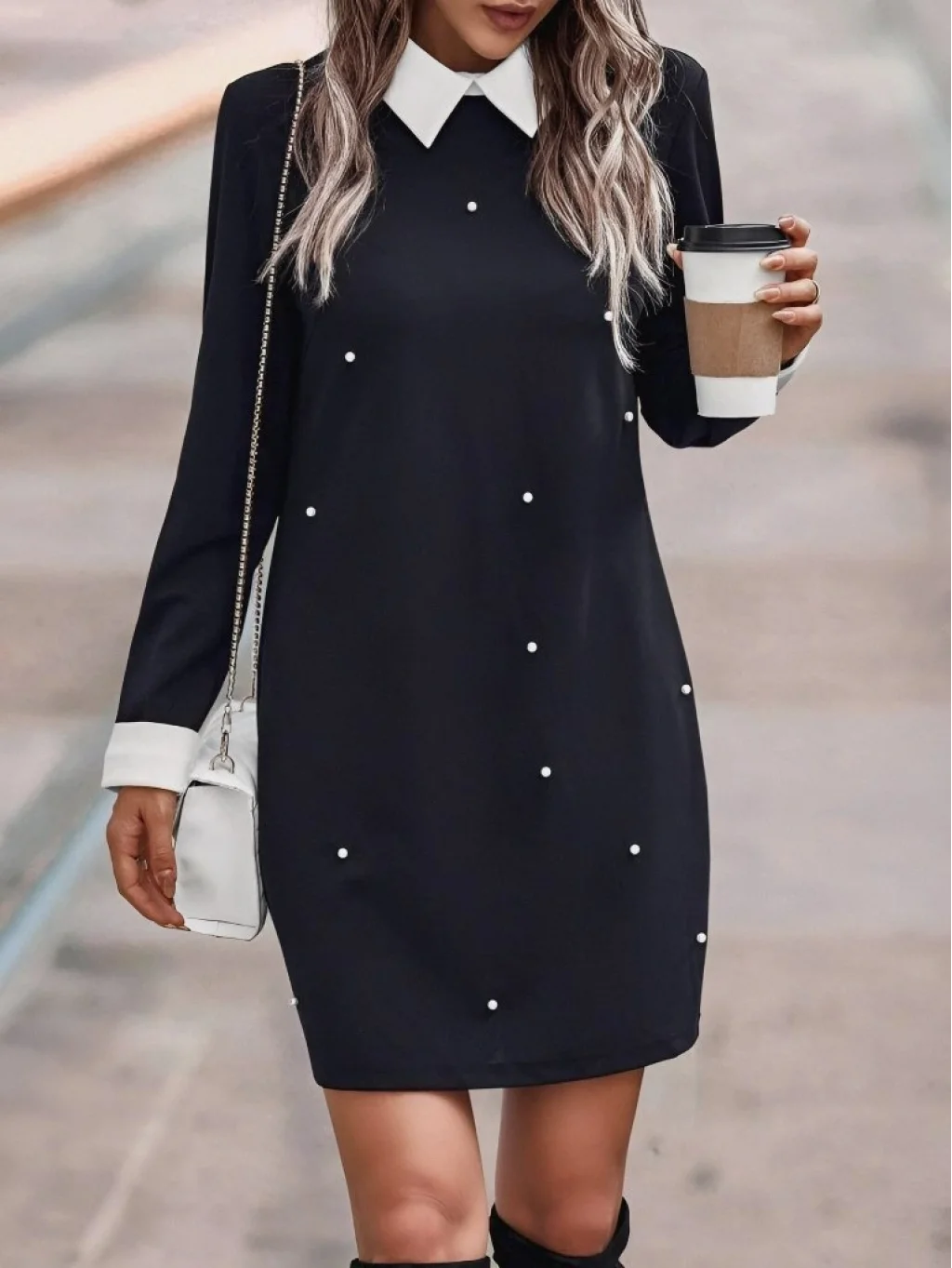 Kadın Uzun Kollu Polo Yaka Inci Detay Krep Elbise