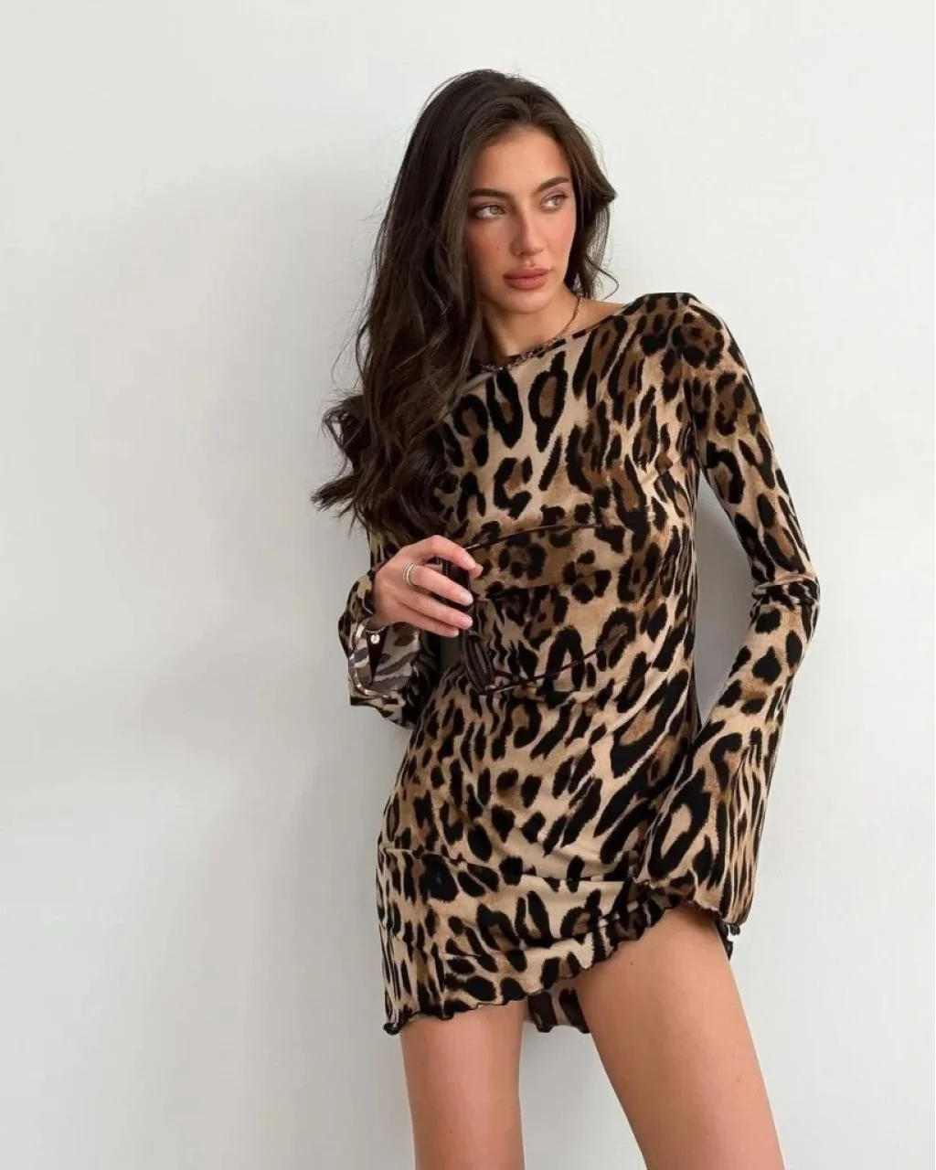 Kadın Uzun Kollu Sırtı Açık Bağlamalı Leopar Desenli Kısa Dalgıç Elbise