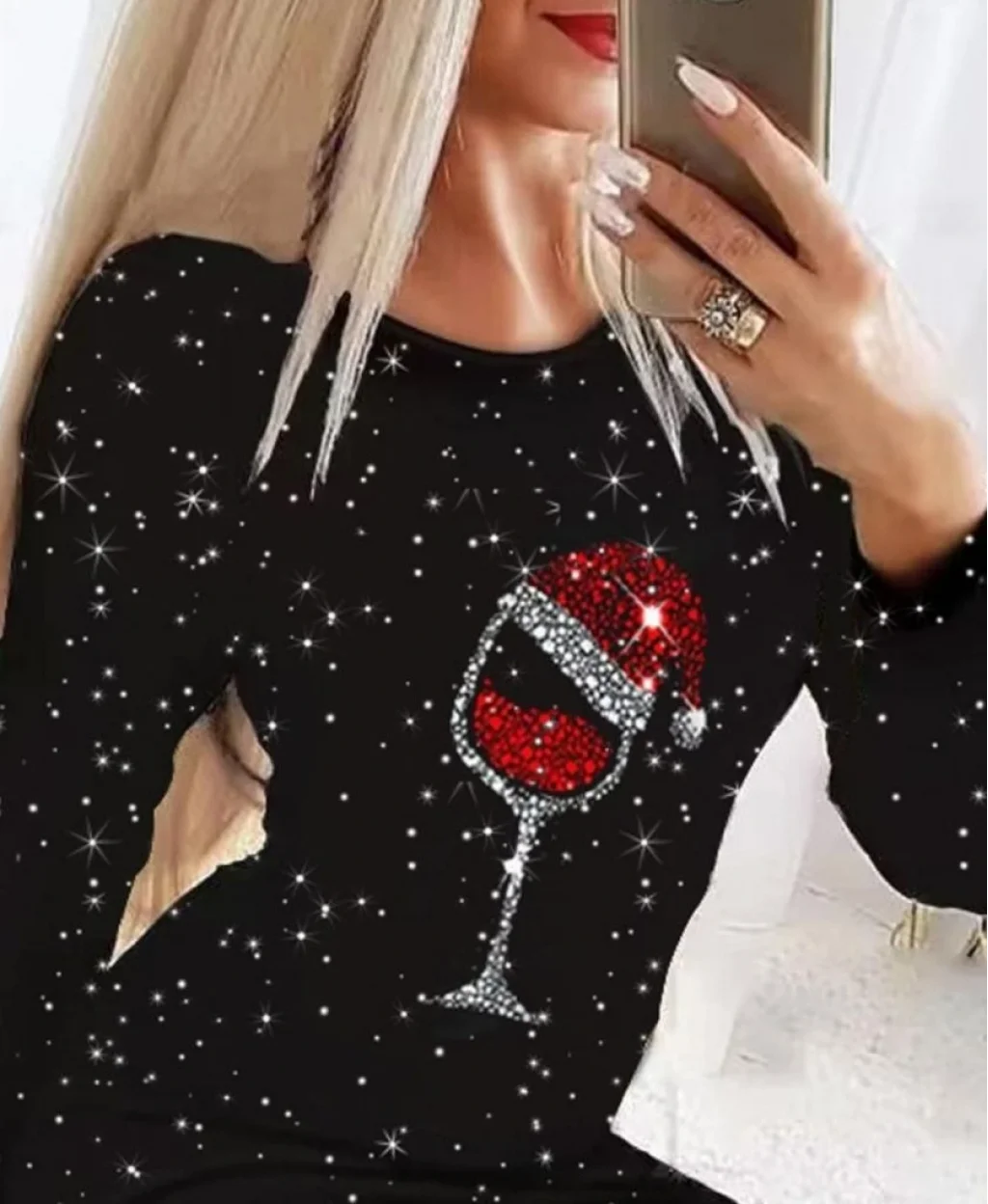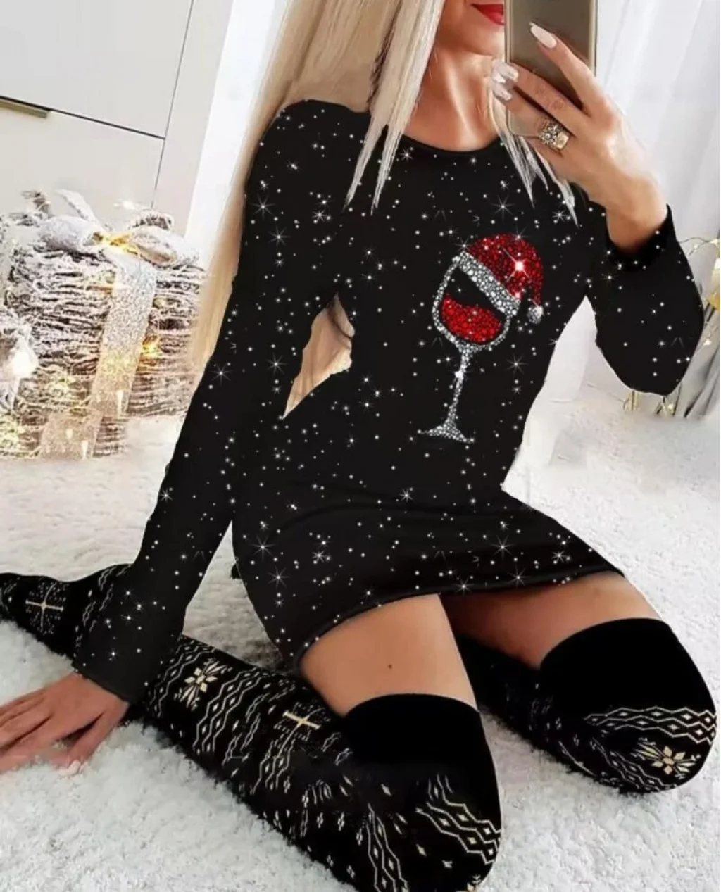 Kadın Uzun Kollu Taş Kadeh Baskı Mikro Kumaş Mini Boy Elbise (çorapsız)
