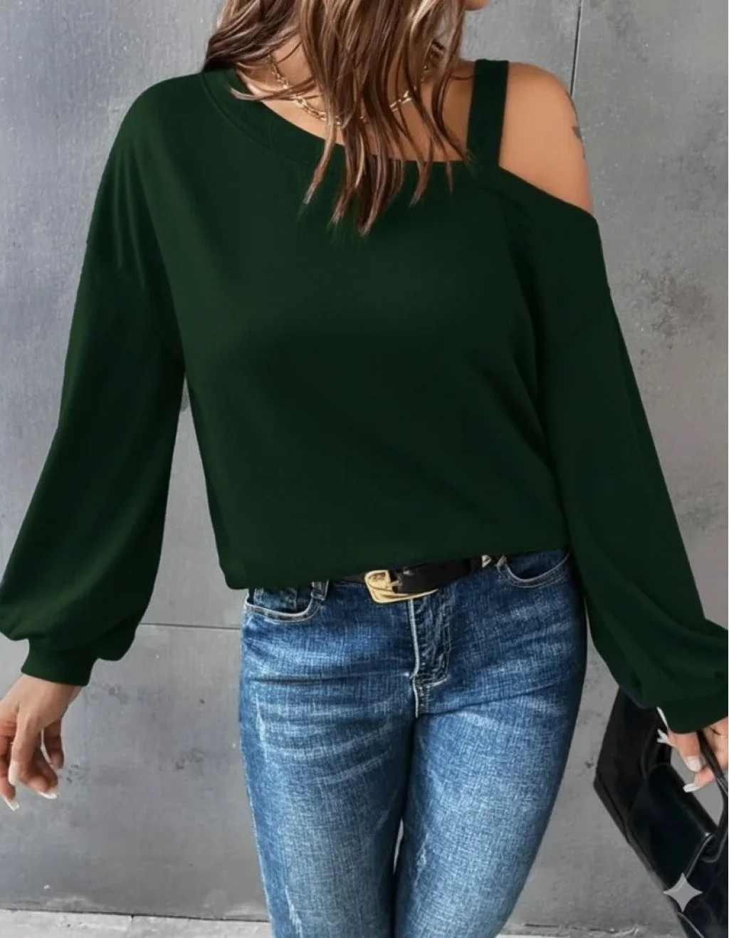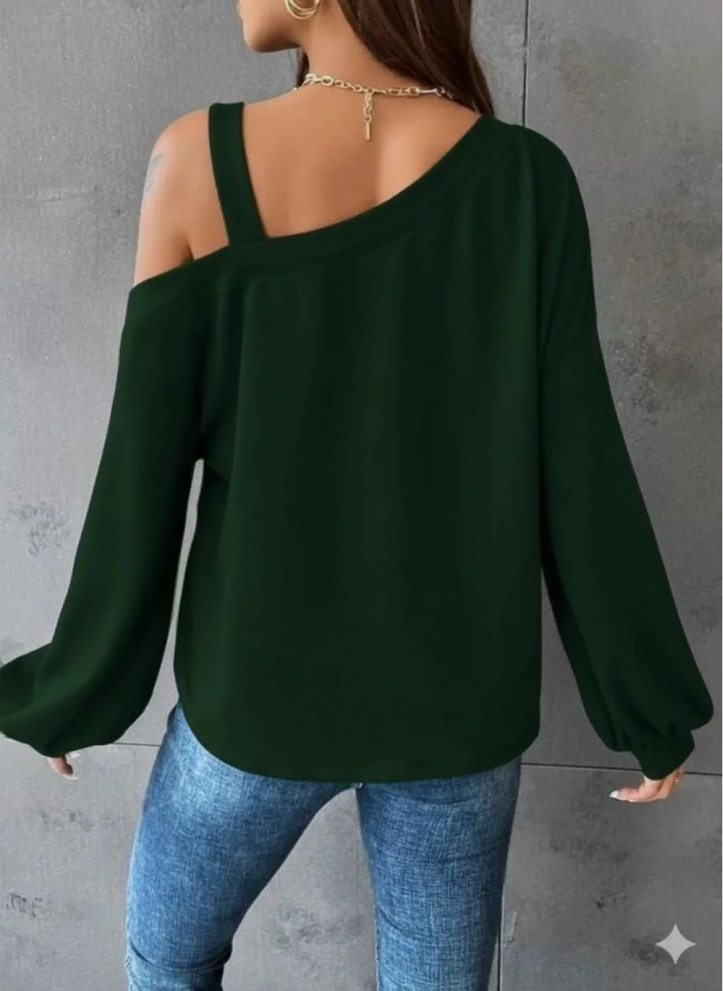 Kadın Uzun Kollu Tek Omuz Askı Detay Salaş Viskon Iki Iplik Bluz