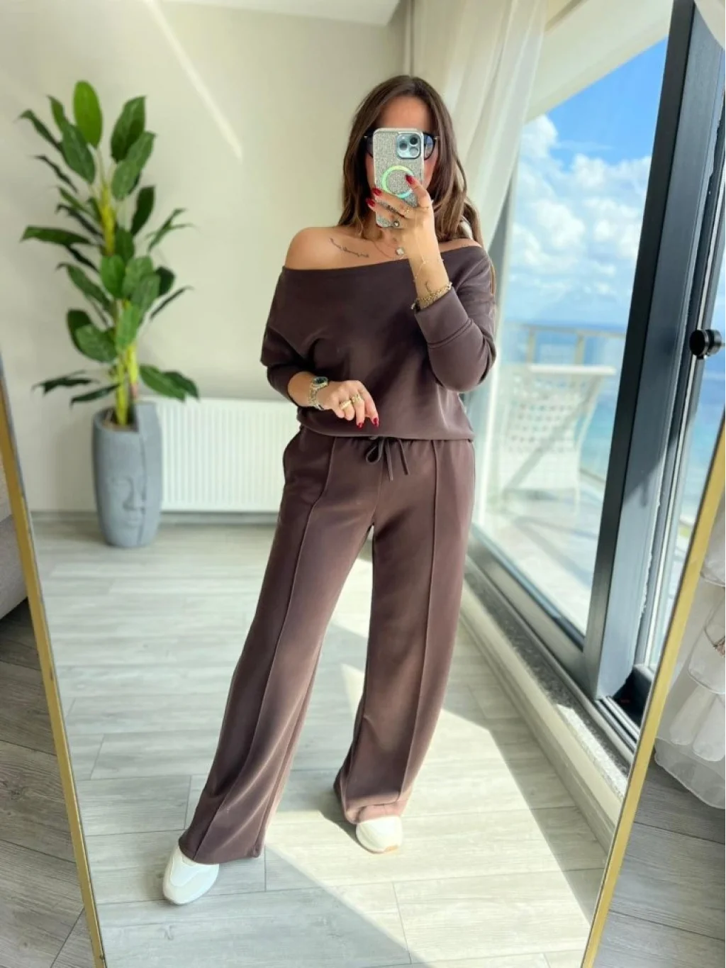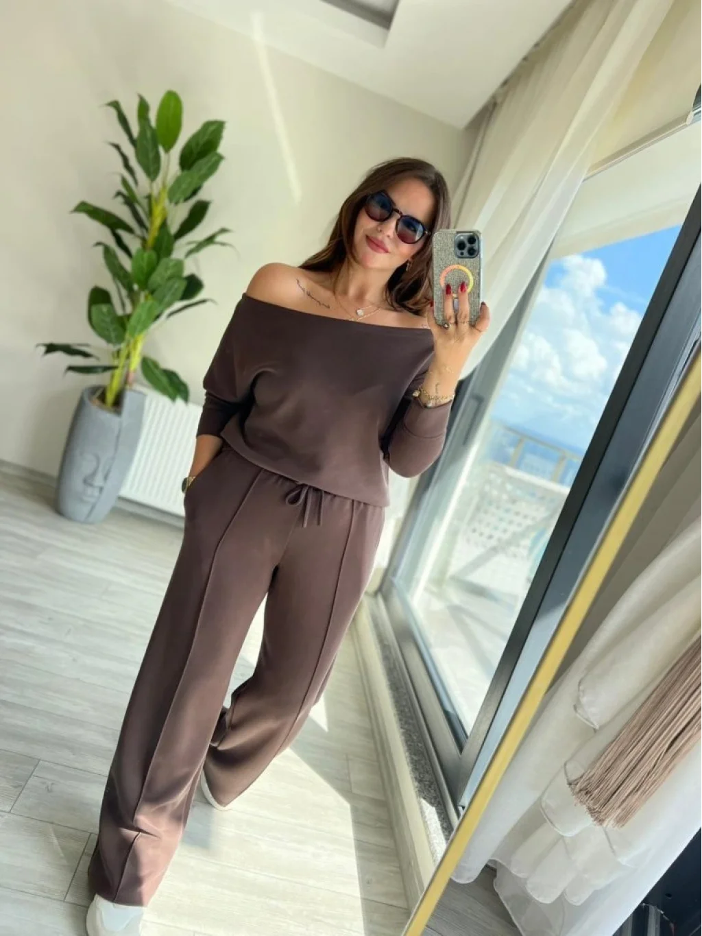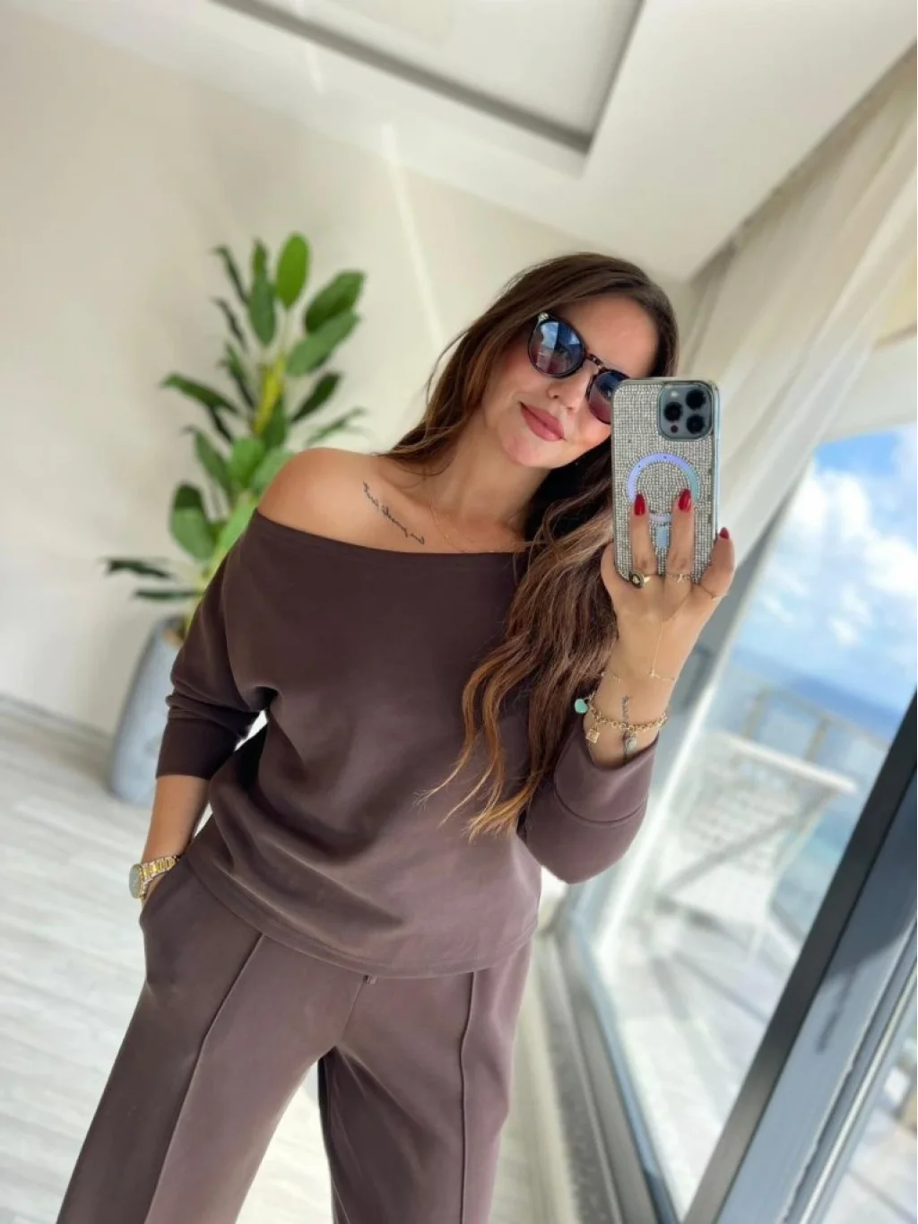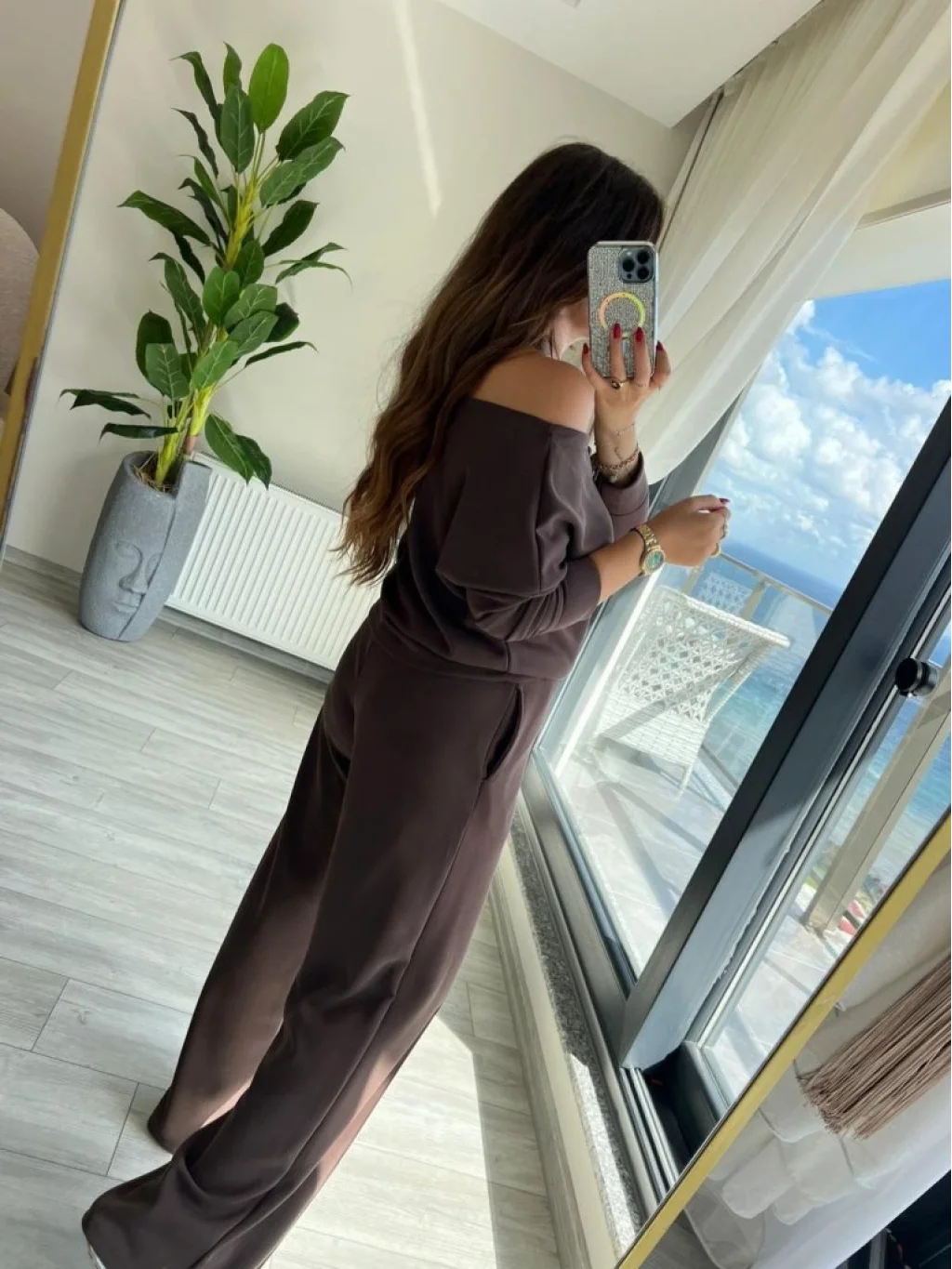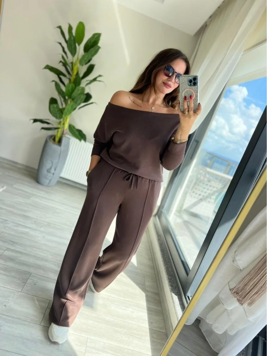 Kadın Uzun Kollu Tek Omuzdan Açık Modal Bluz Ve Pantolon Ikili Takım