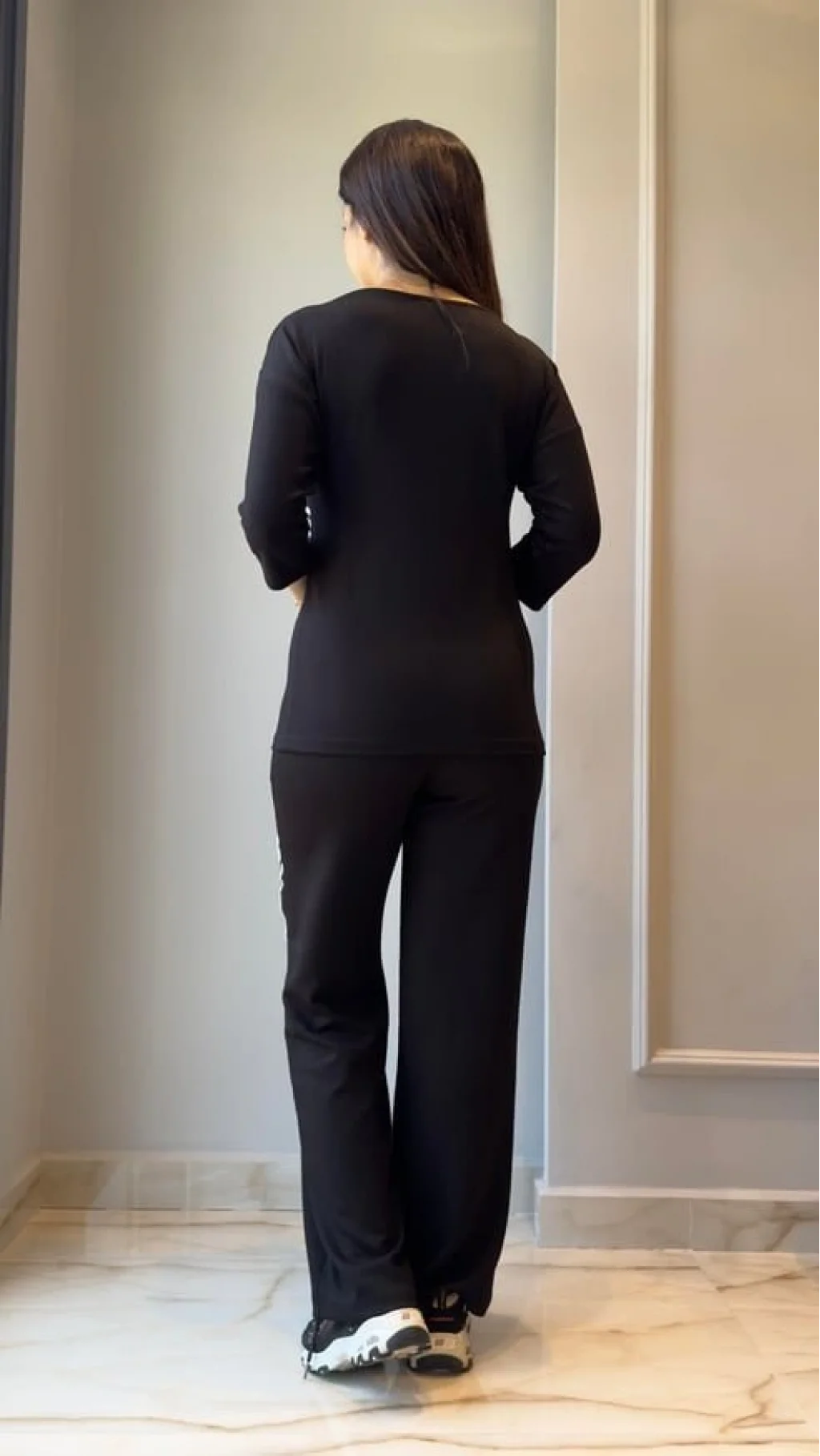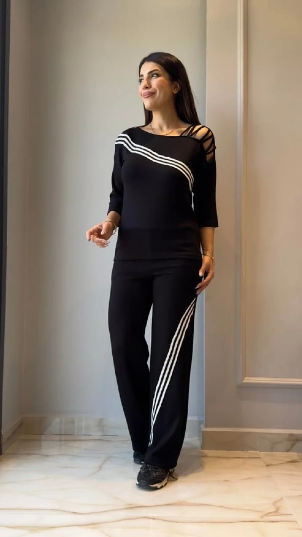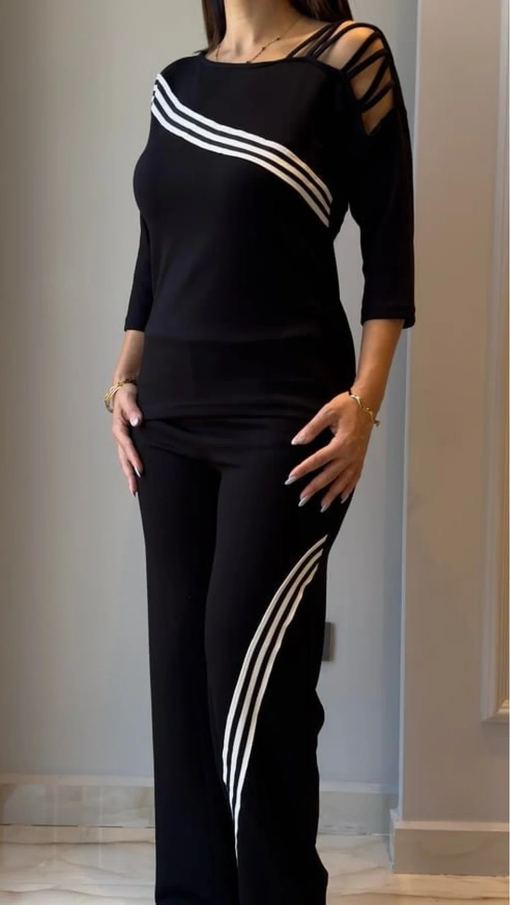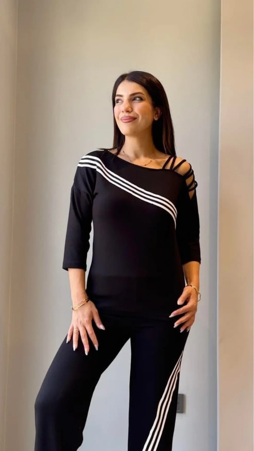 Kadın Uzun Kollu Truvakar Kol Tek Omuz çapraz şerit Detaylı Ribanalı Viskon Iki Iplik Bluz Ve Pantolon Ikili Takım
