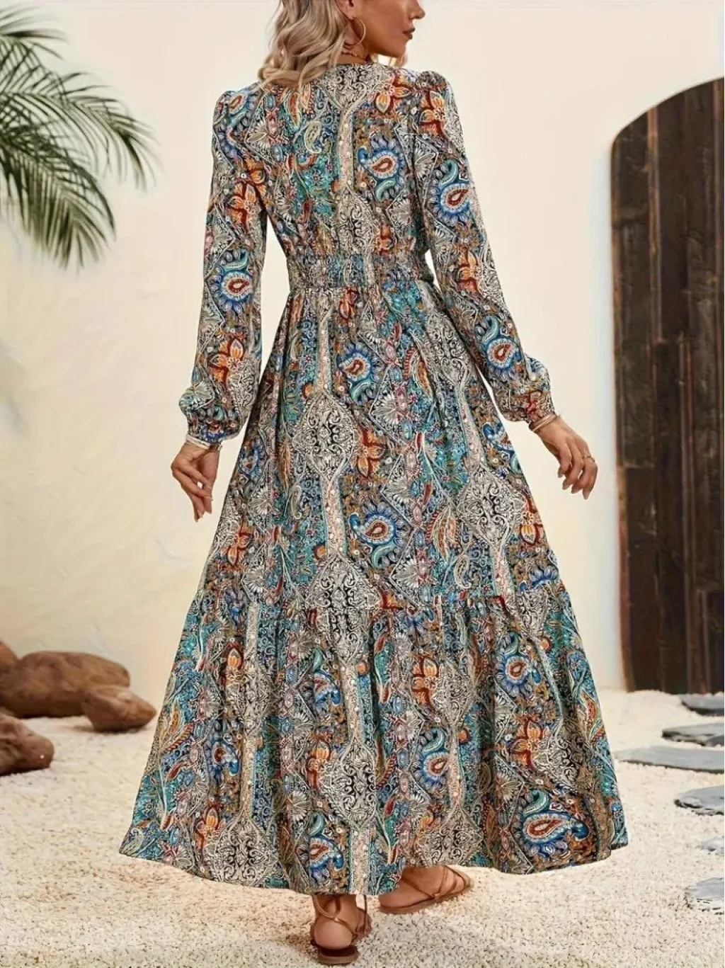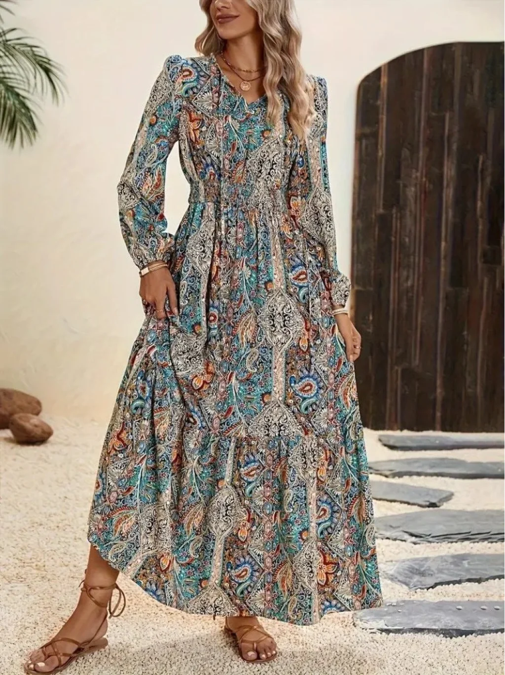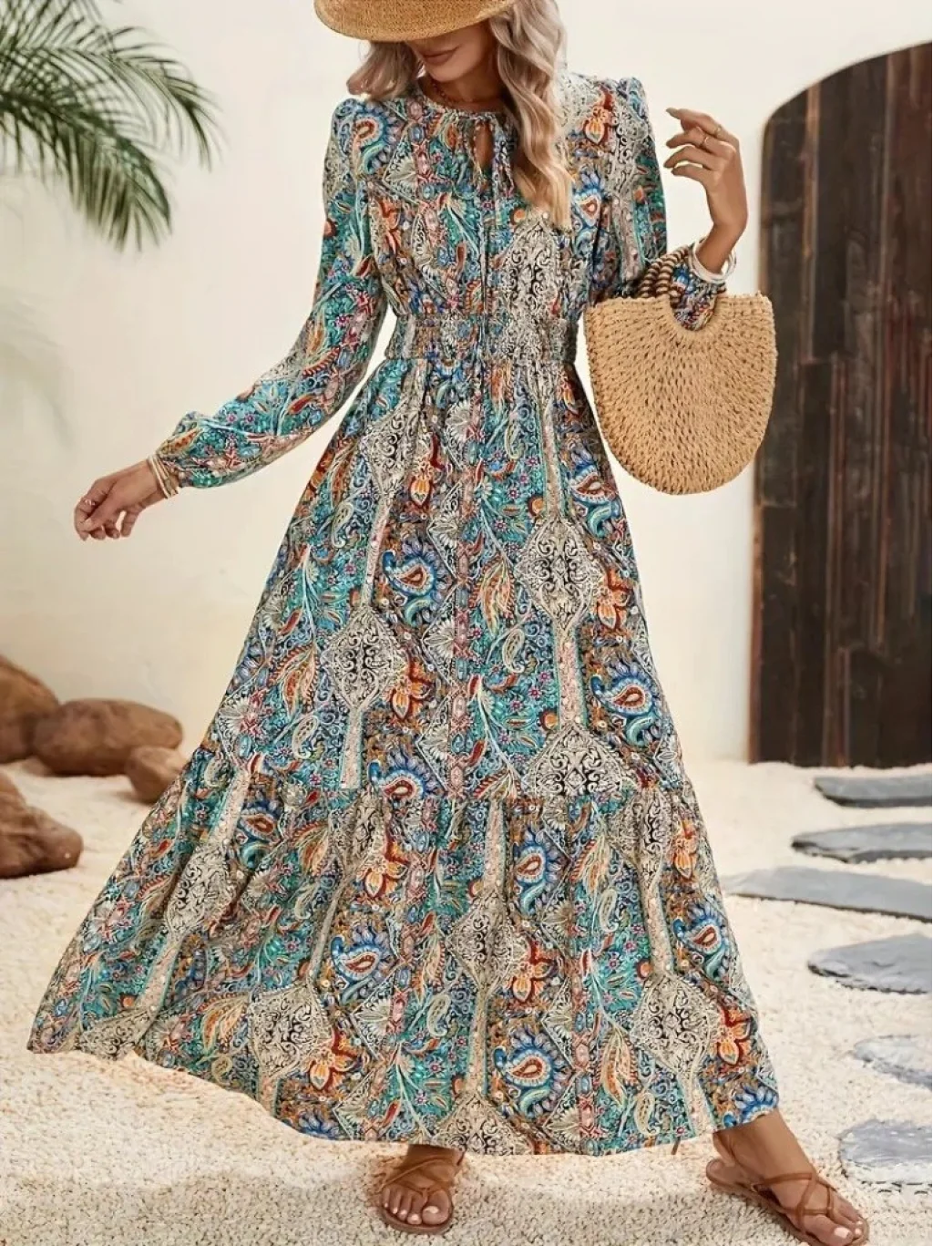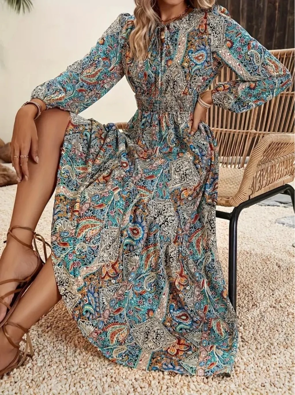 Kadın Uzun Kollu Uakadabağcıklı Beli Lastikli Desenli Uzun Süprem Elbise