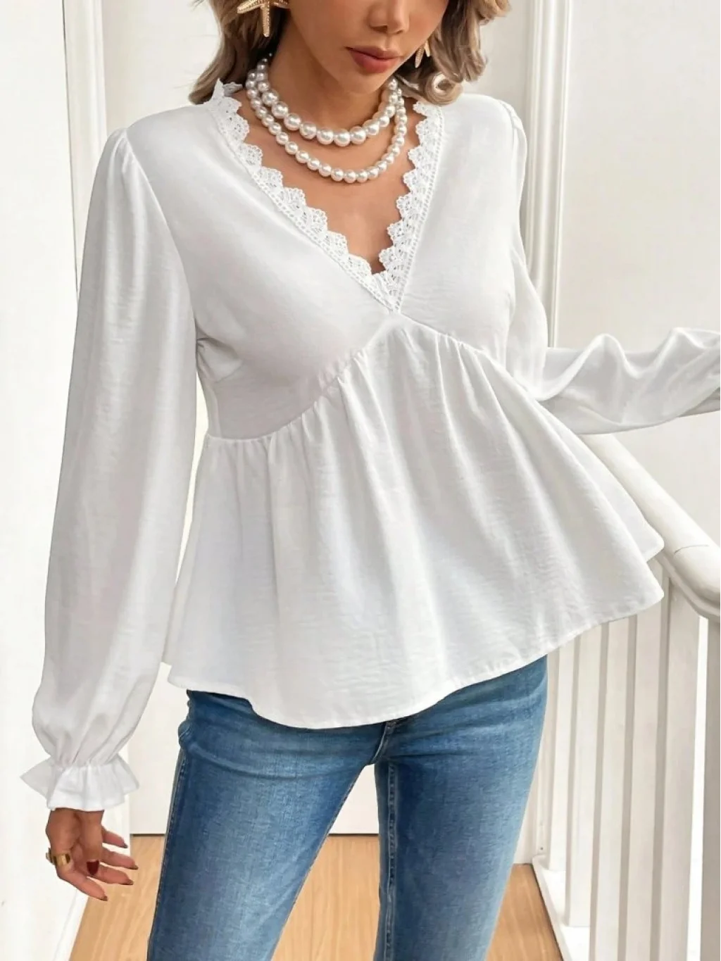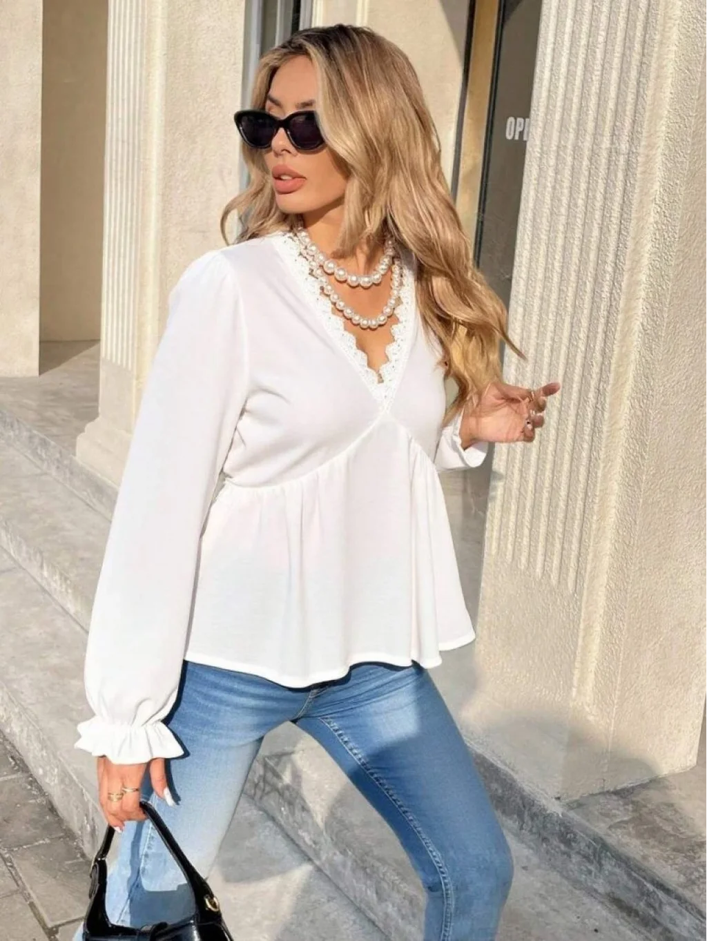 Kadın Uzun Kollu V Dantel Yaka Aerobin Bluz
