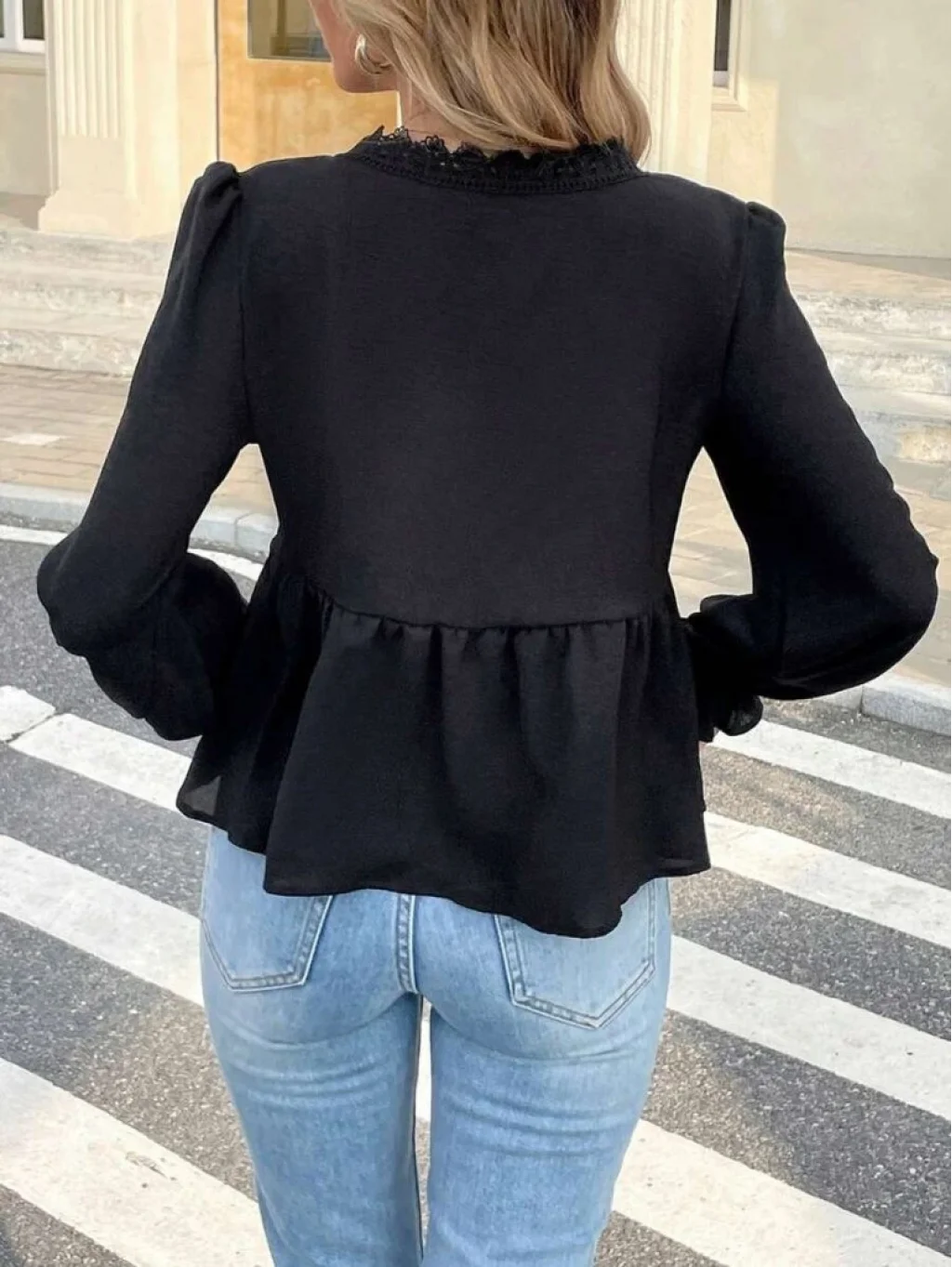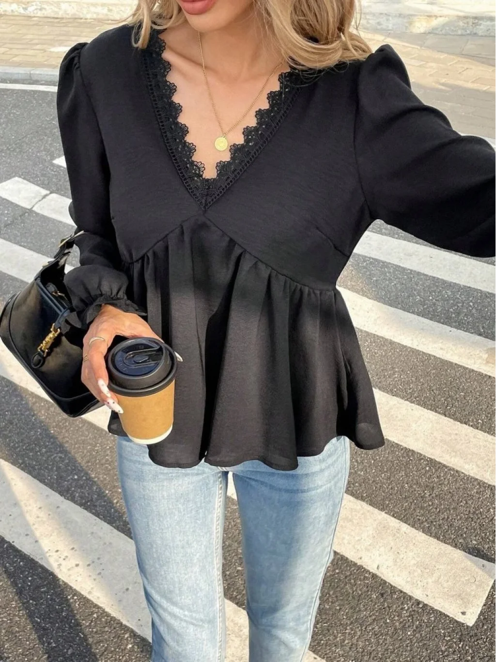Kadın Uzun Kollu V Dantel Yaka Aerobin Bluz
