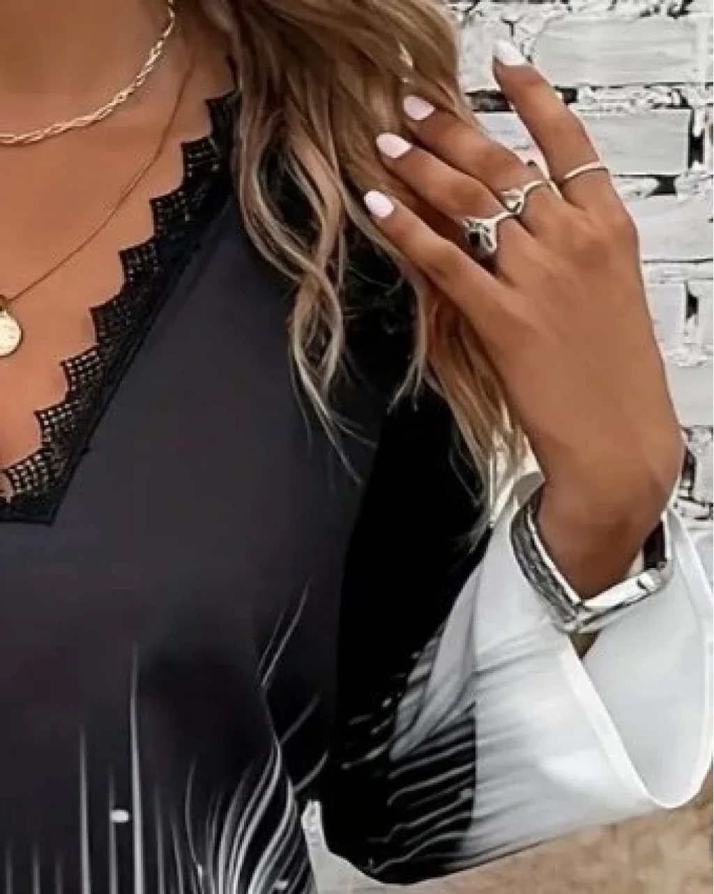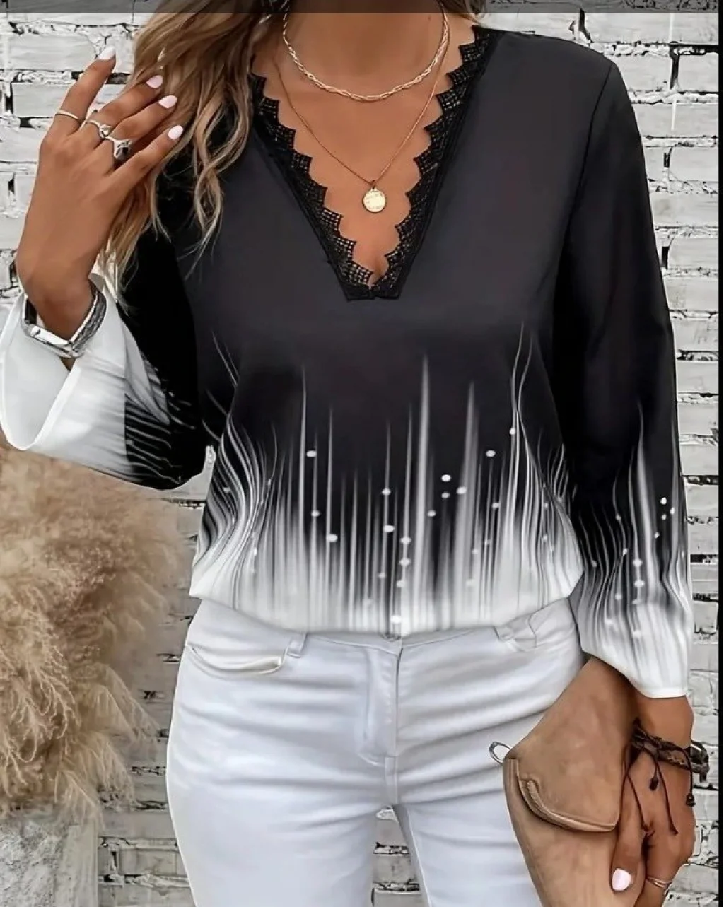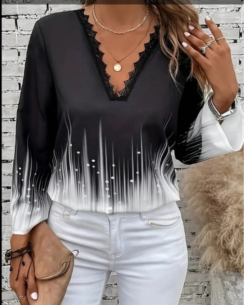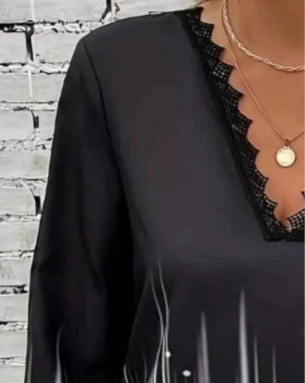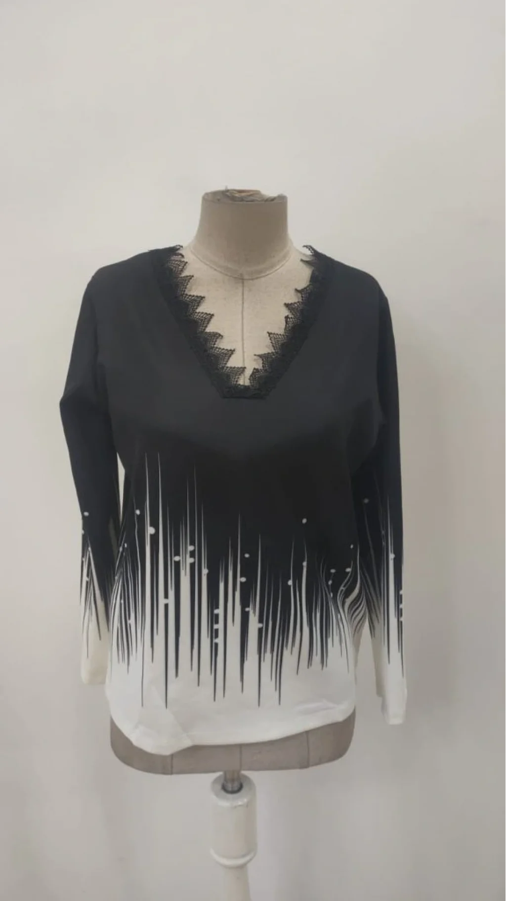 Kadın Uzun Kollu V Dantel Yaka Desenli Modal Bluz