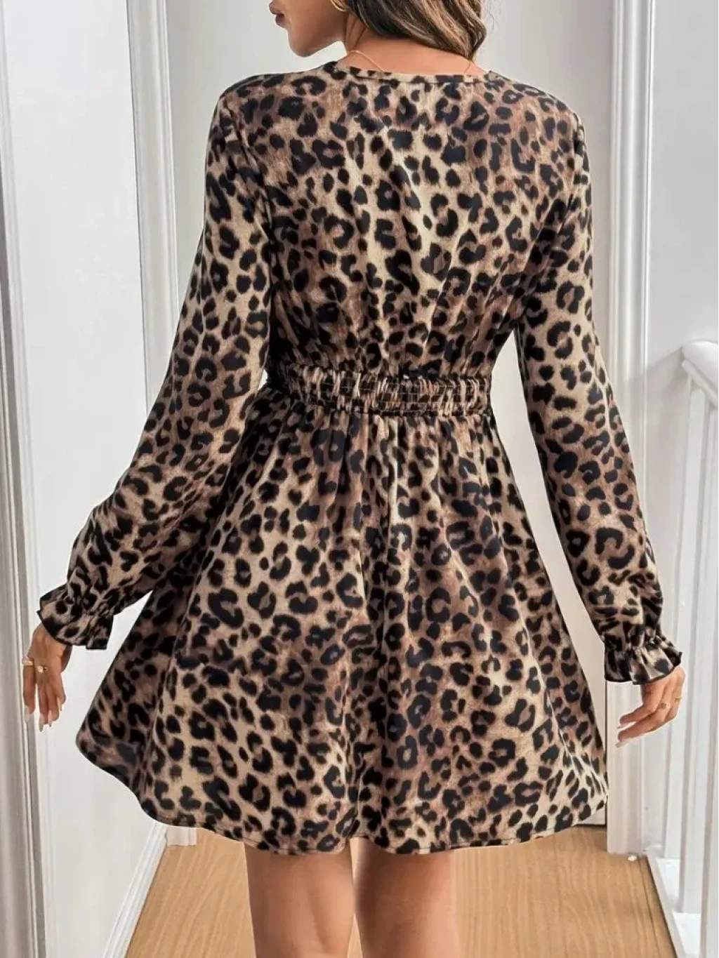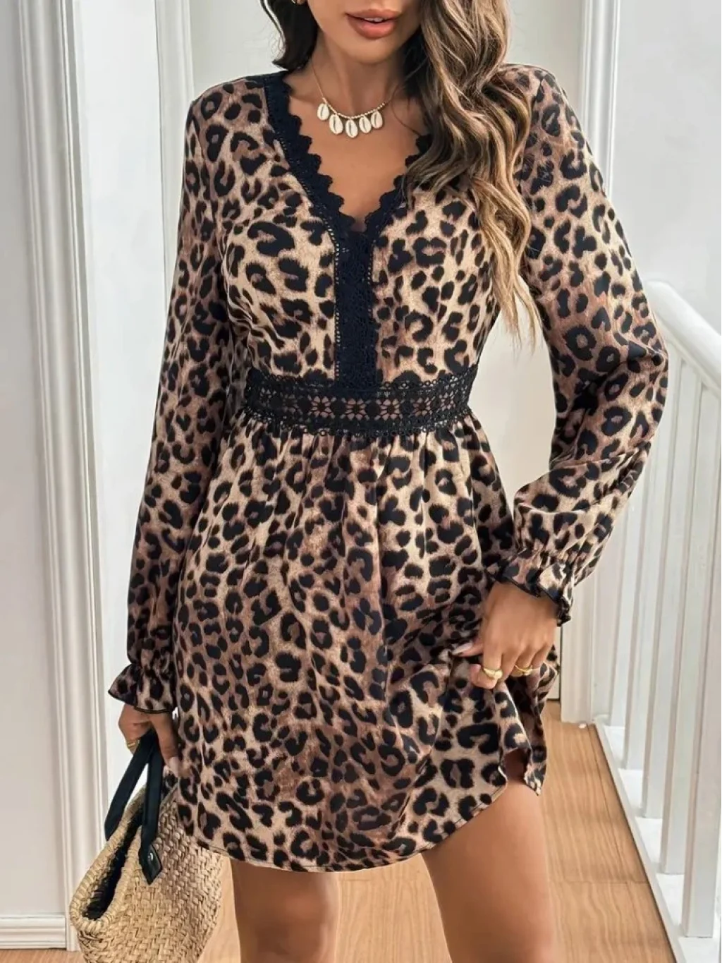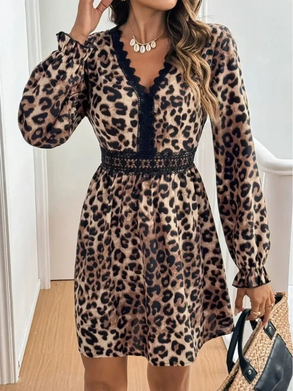Kadın Uzun Kollu V Dantel Yakalı Leopar Desenli Modal Mini Elbise