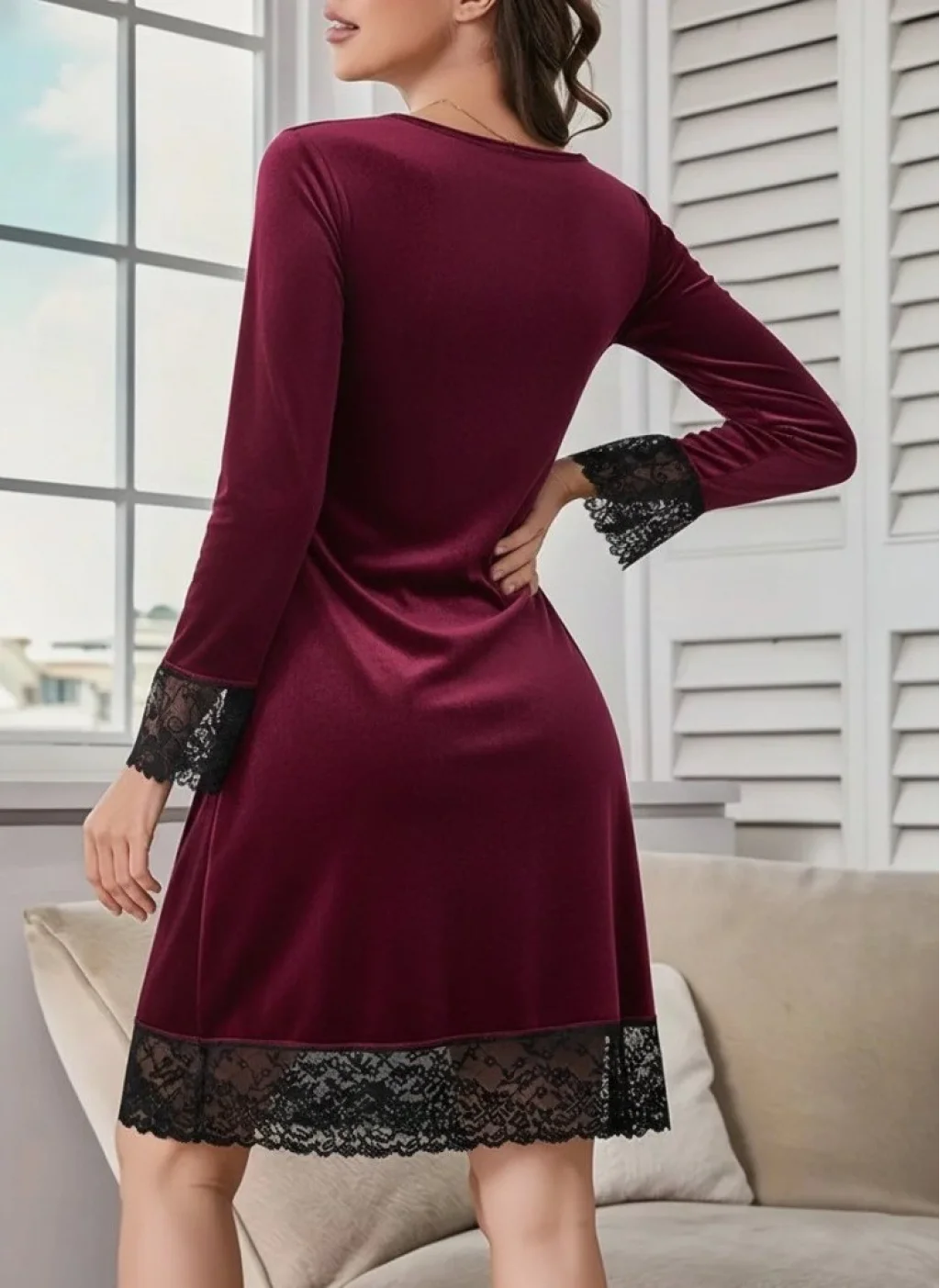 Kadın Uzun Kollu V Dantel Yakalı Mini Kadife Elbise