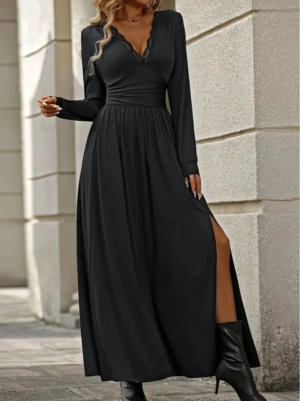 Kadın Uzun Kollu V Dantel Yakalı Yırtmaçlı Uzun Sandy Elbise
