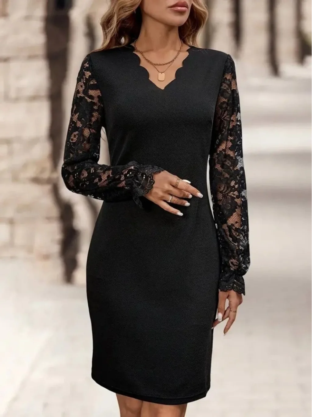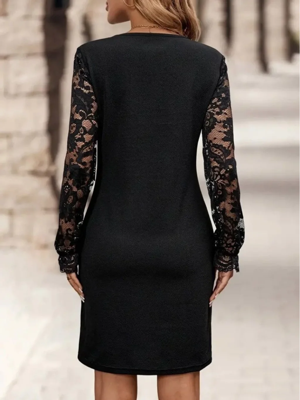 Kadın Uzun Kollu V Lazer Kesim Detaylı Kısa Ithal Krep Elbise