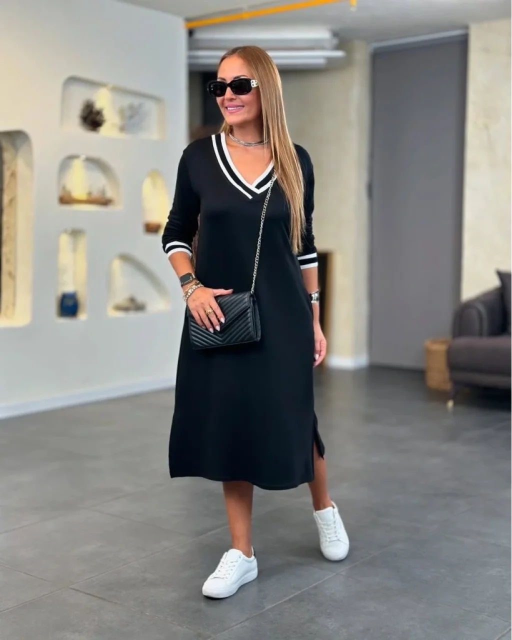 Kadın Uzun Kollu V Ribana Yakalı Yanlardan Yırtmaçlı Midi Viskon Iki Iplik Elbise