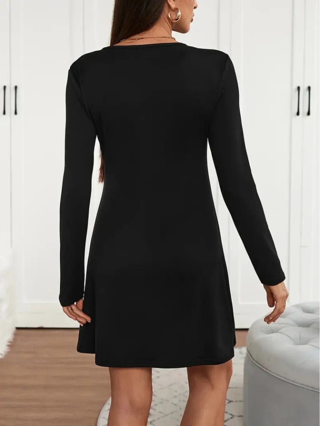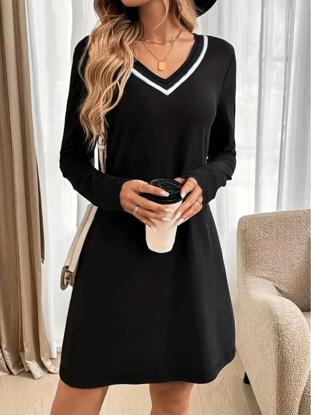 Kadın Uzun Kollu V şerit Yakalı Kısa Viskon Iki Iplik Elbise