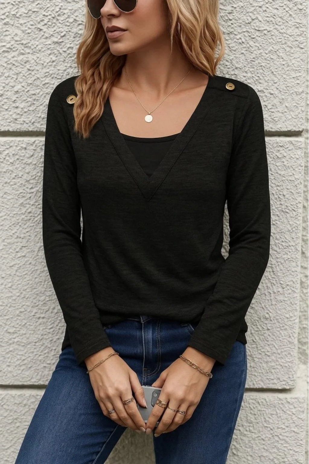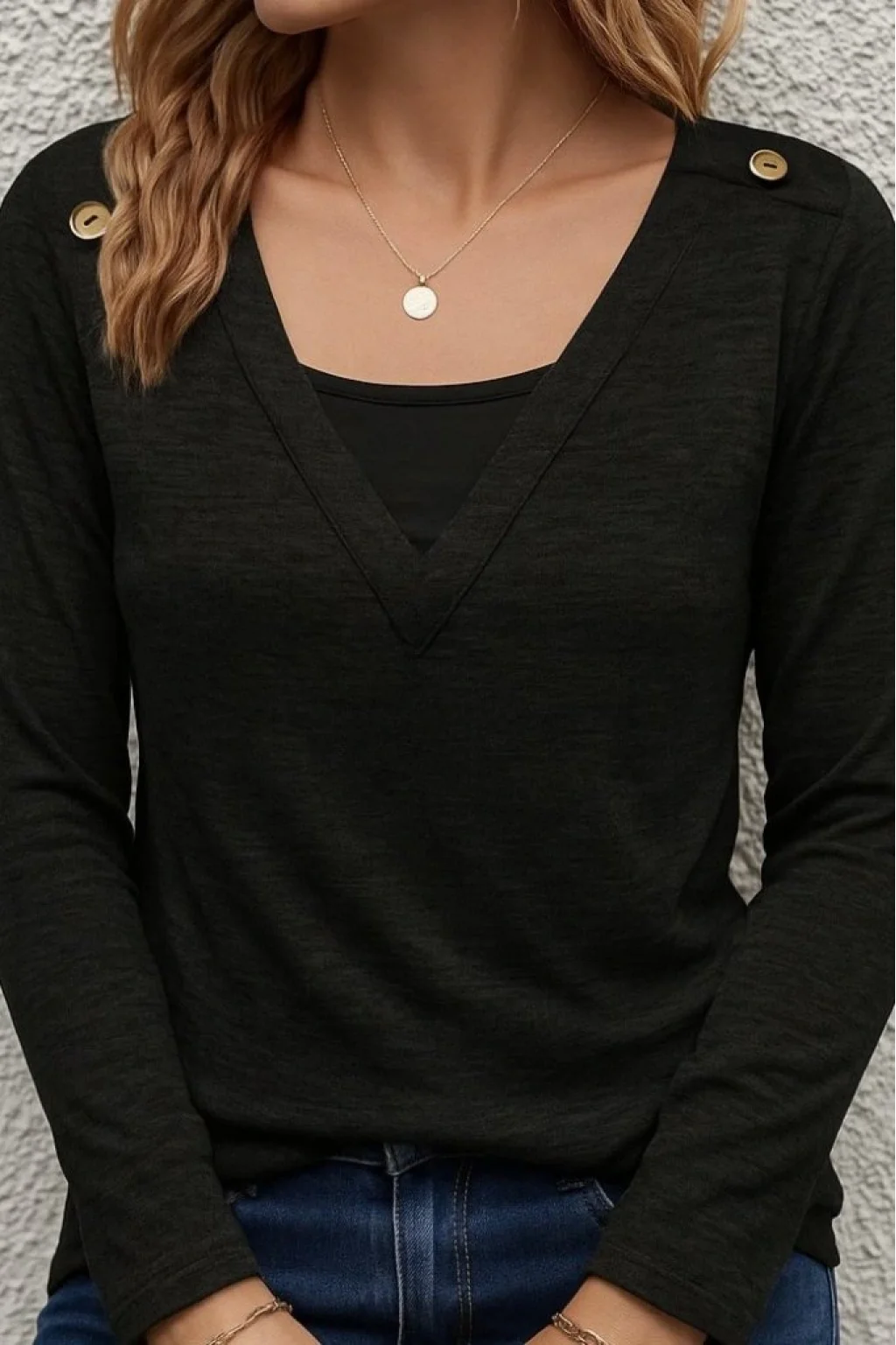 Kadın Uzun Kollu V Yaka Düğme Detaylı Yumoş Bluz
