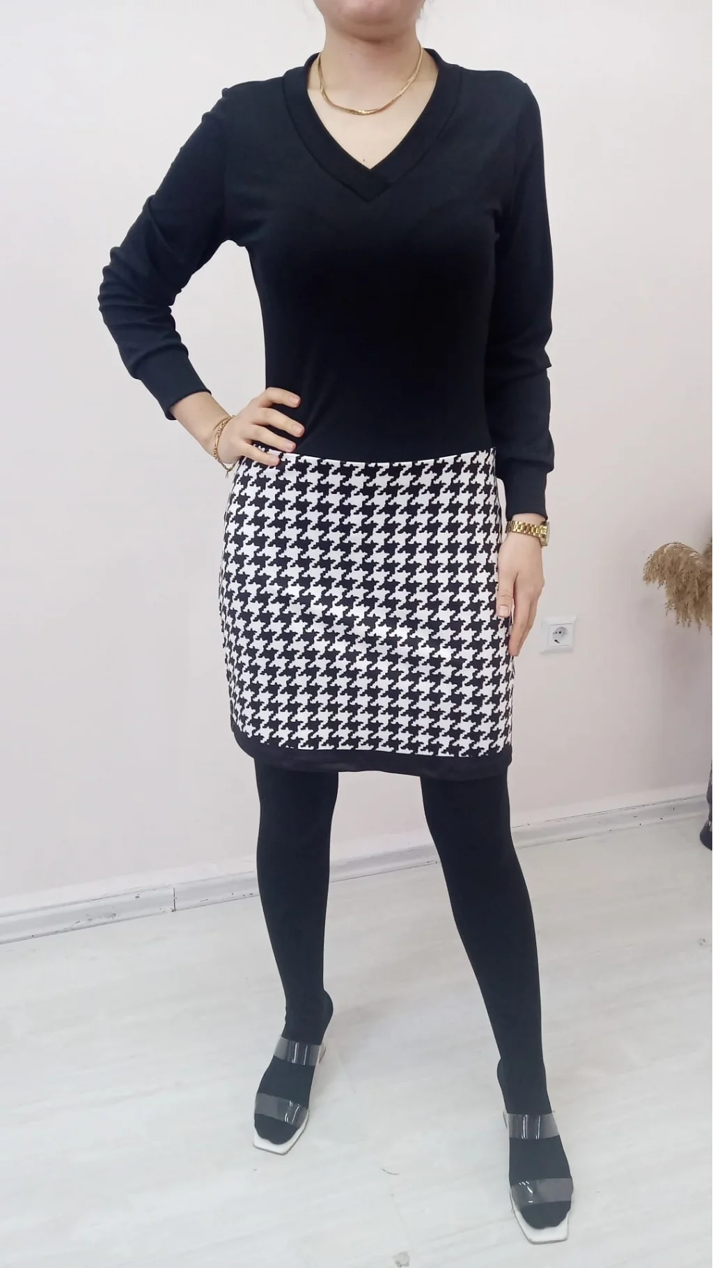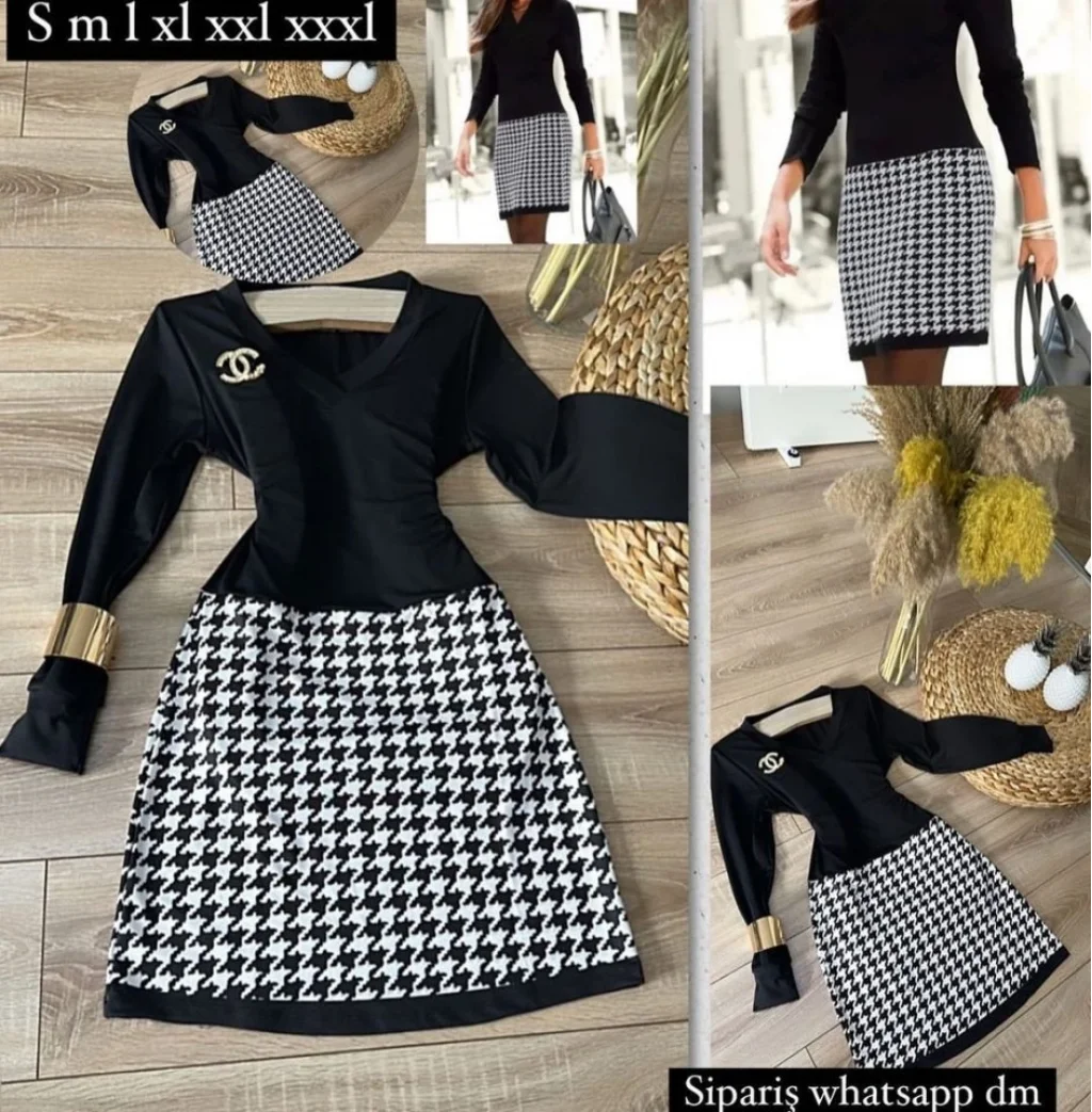 Kadın Uzun Kollu V Yaka Kazayağı Desen Dalgıç Kumaş Elbise