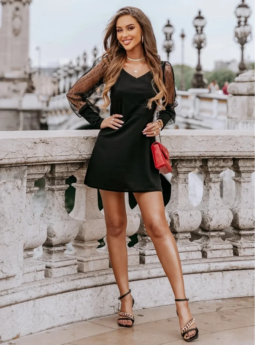 Kadın Uzun Kollu V Yaka Kollar Tül Detay Krep Elbise