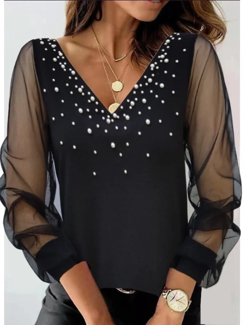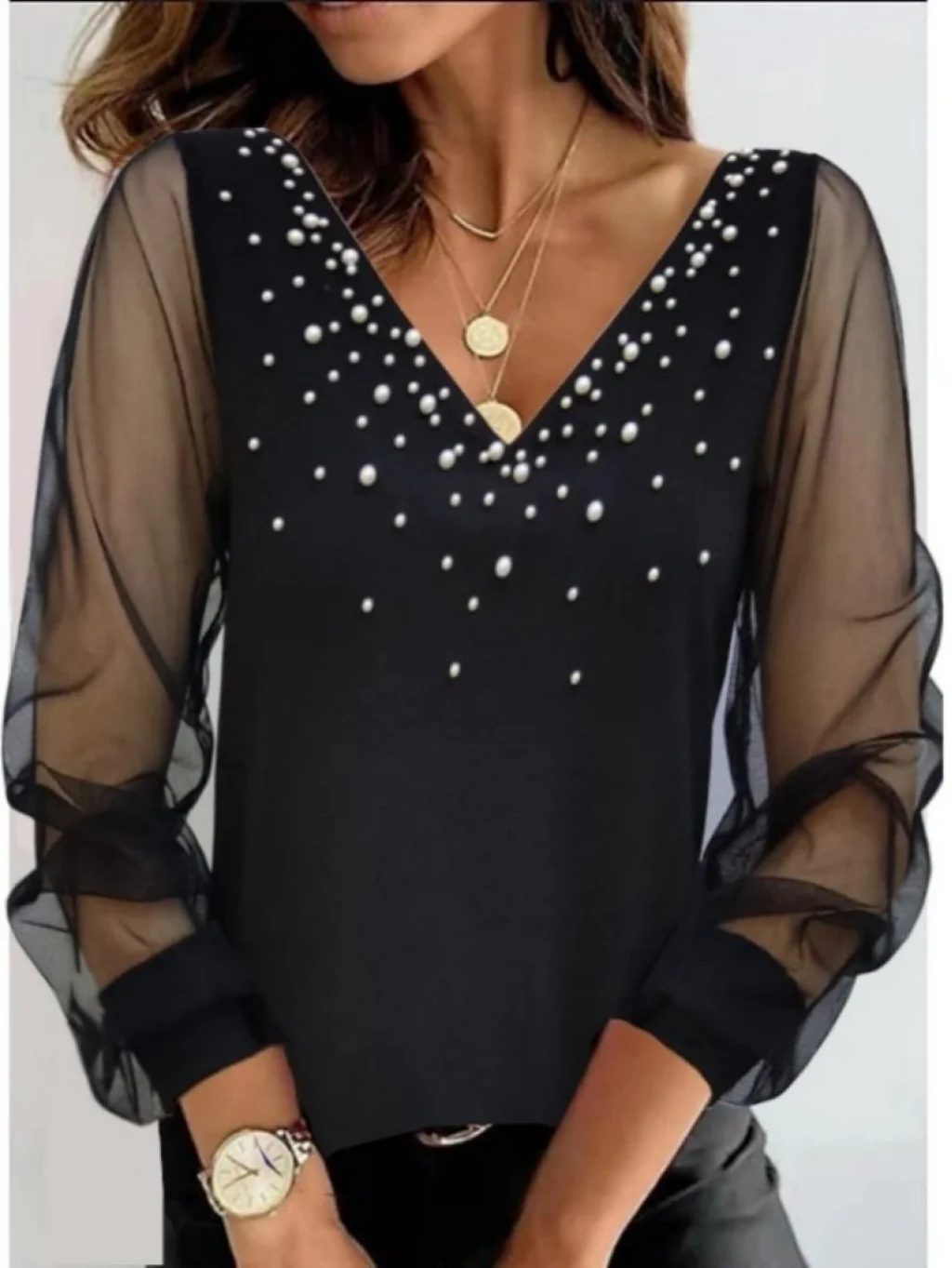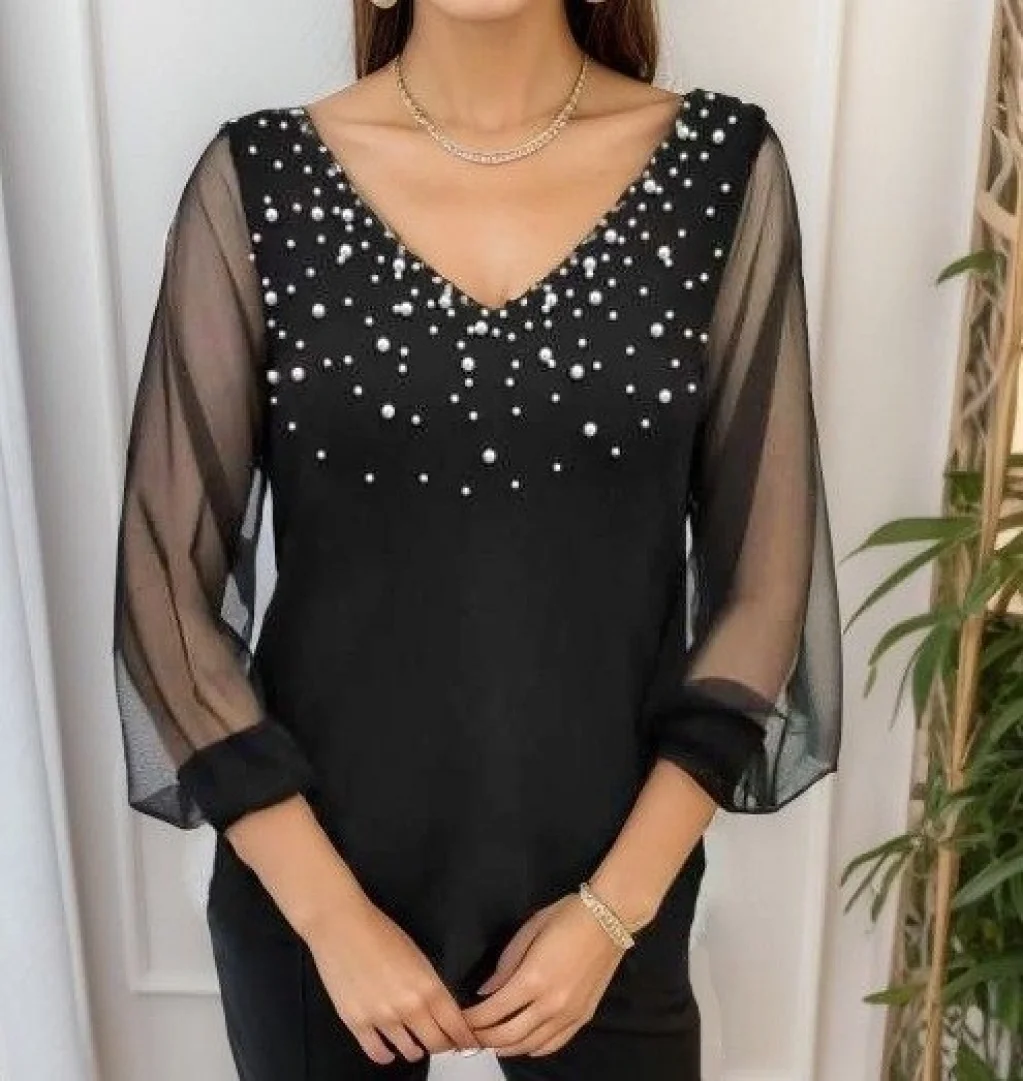 Kadın Uzun Kollu V Yaka Kolları Tül Yaka Kenarı Ve Göğüs Inci Detay Krep Bluz