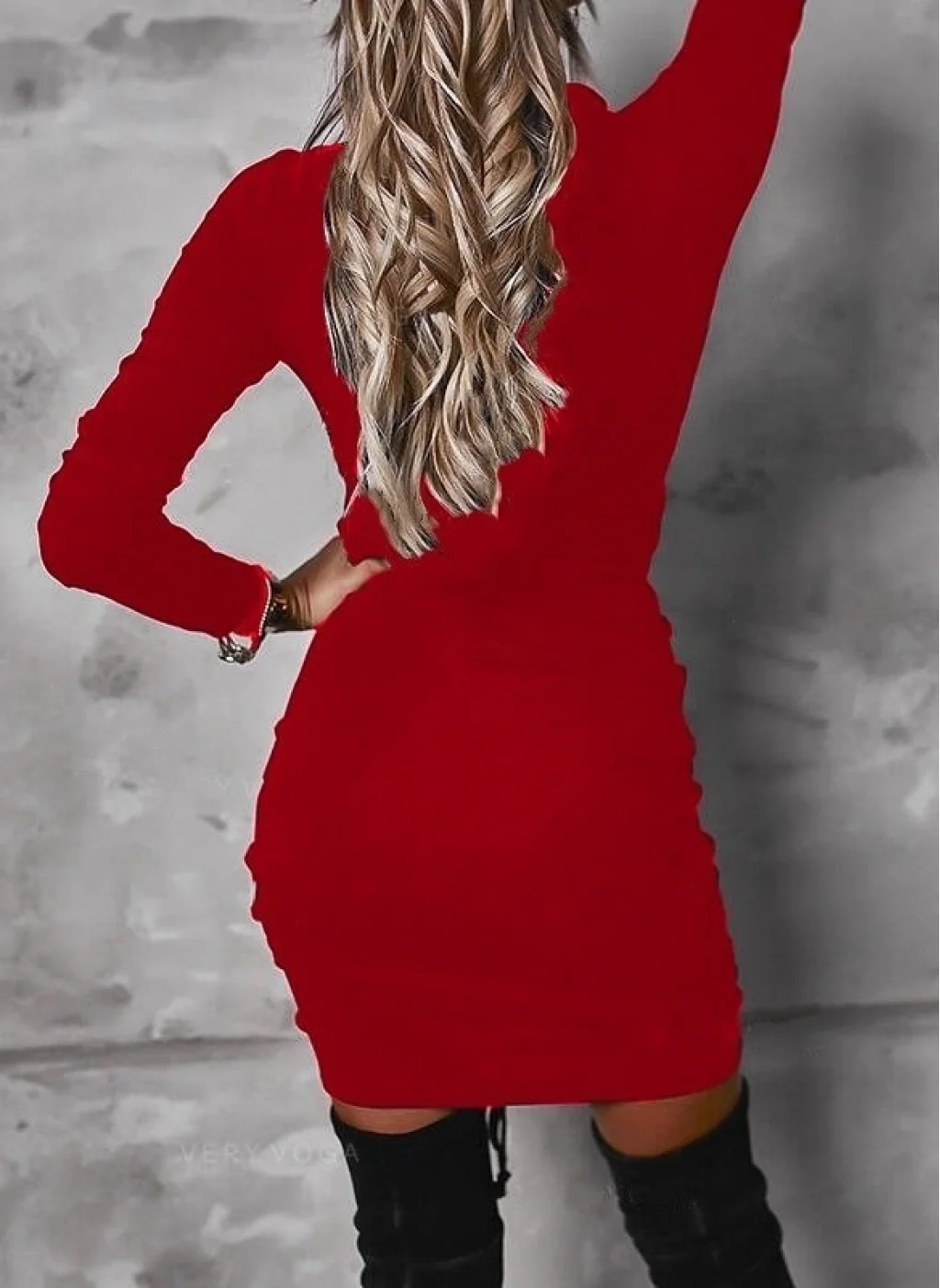 Kadın Uzun Kollu V Yaka önden Yırtmaç Büzgü Detay Kaşkorse Mini Boy Elbise