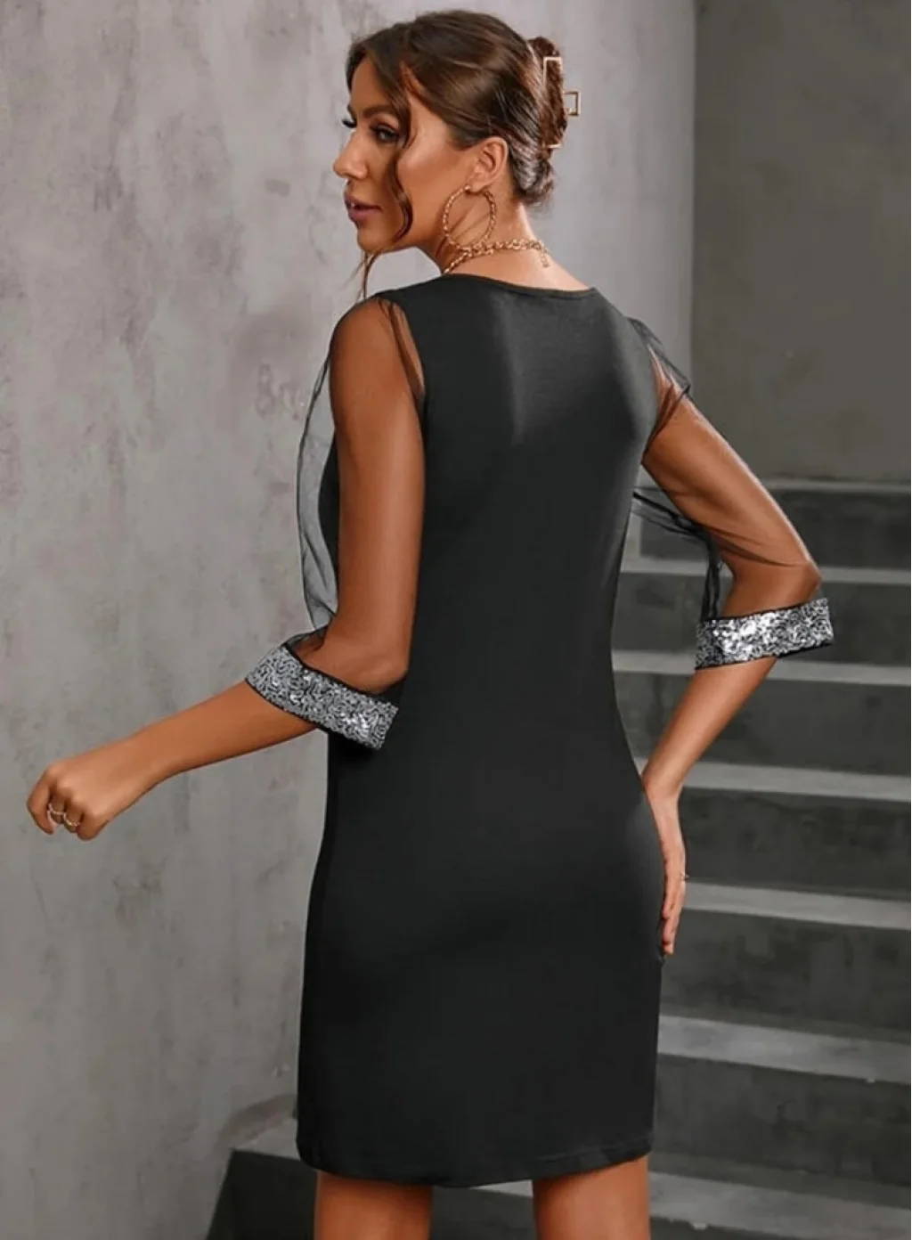 Kadın Uzun Kollu V Yaka Ve Kol Ucu Pul Payet Krep Elbise