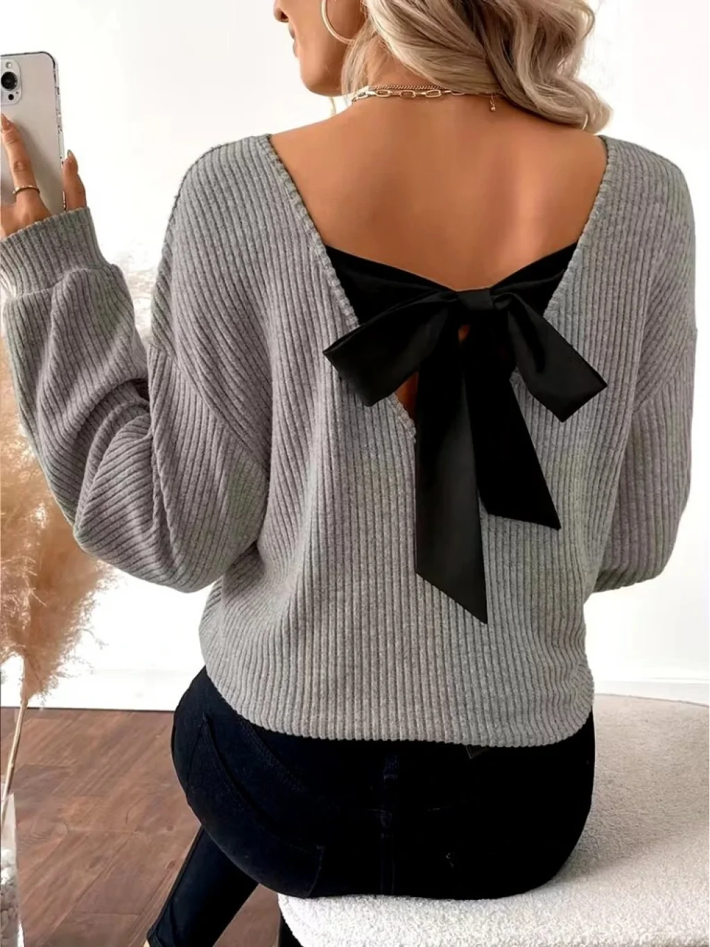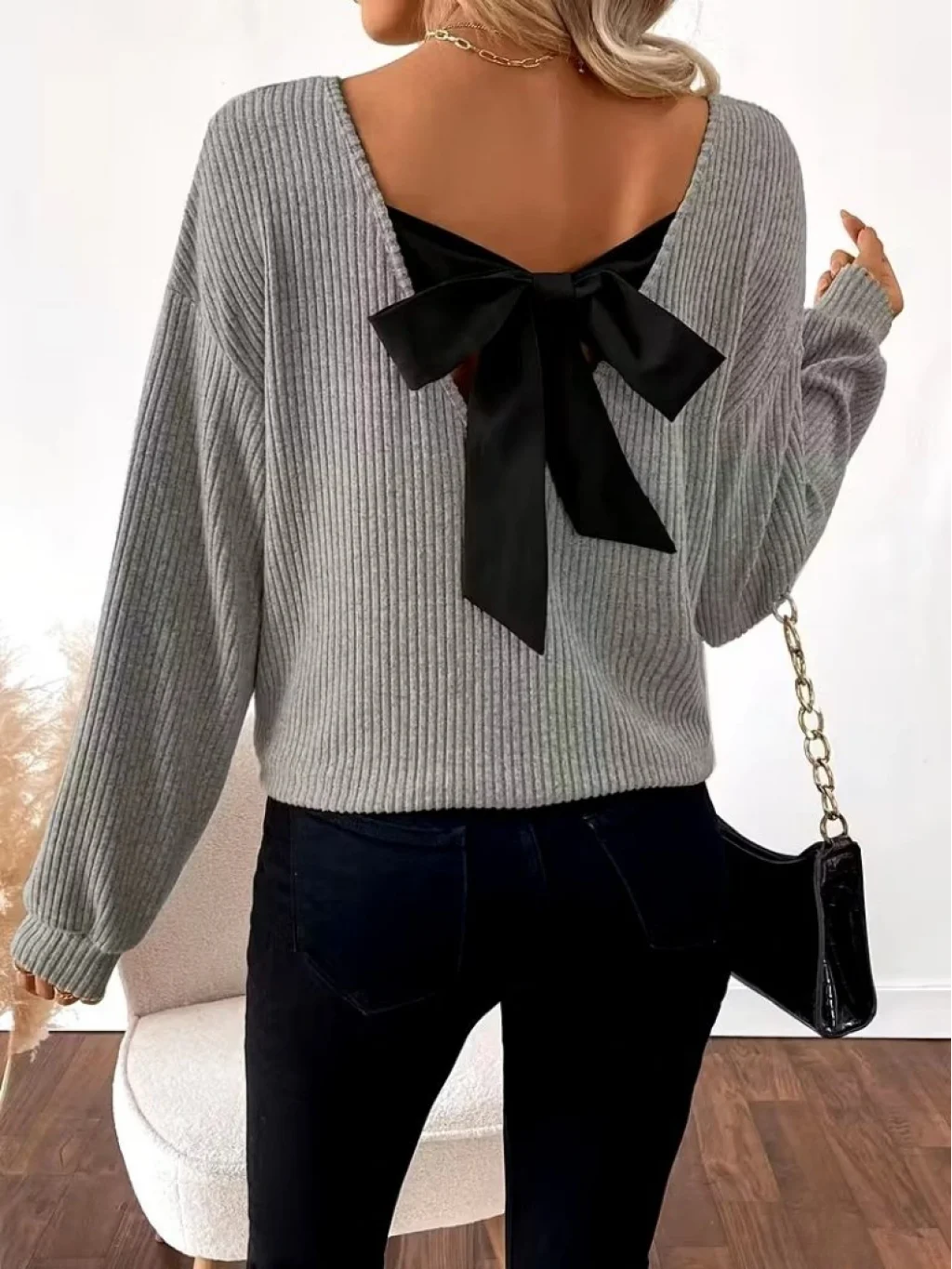 Kadın Uzun Kollu V Yakalı Arkadan Kurdela Detaylı şardonlu Kaşkorse Bluz