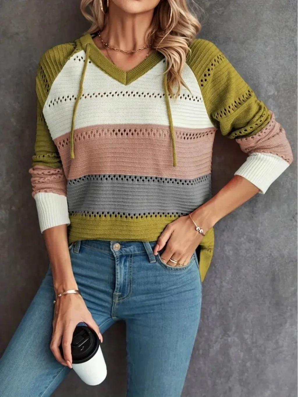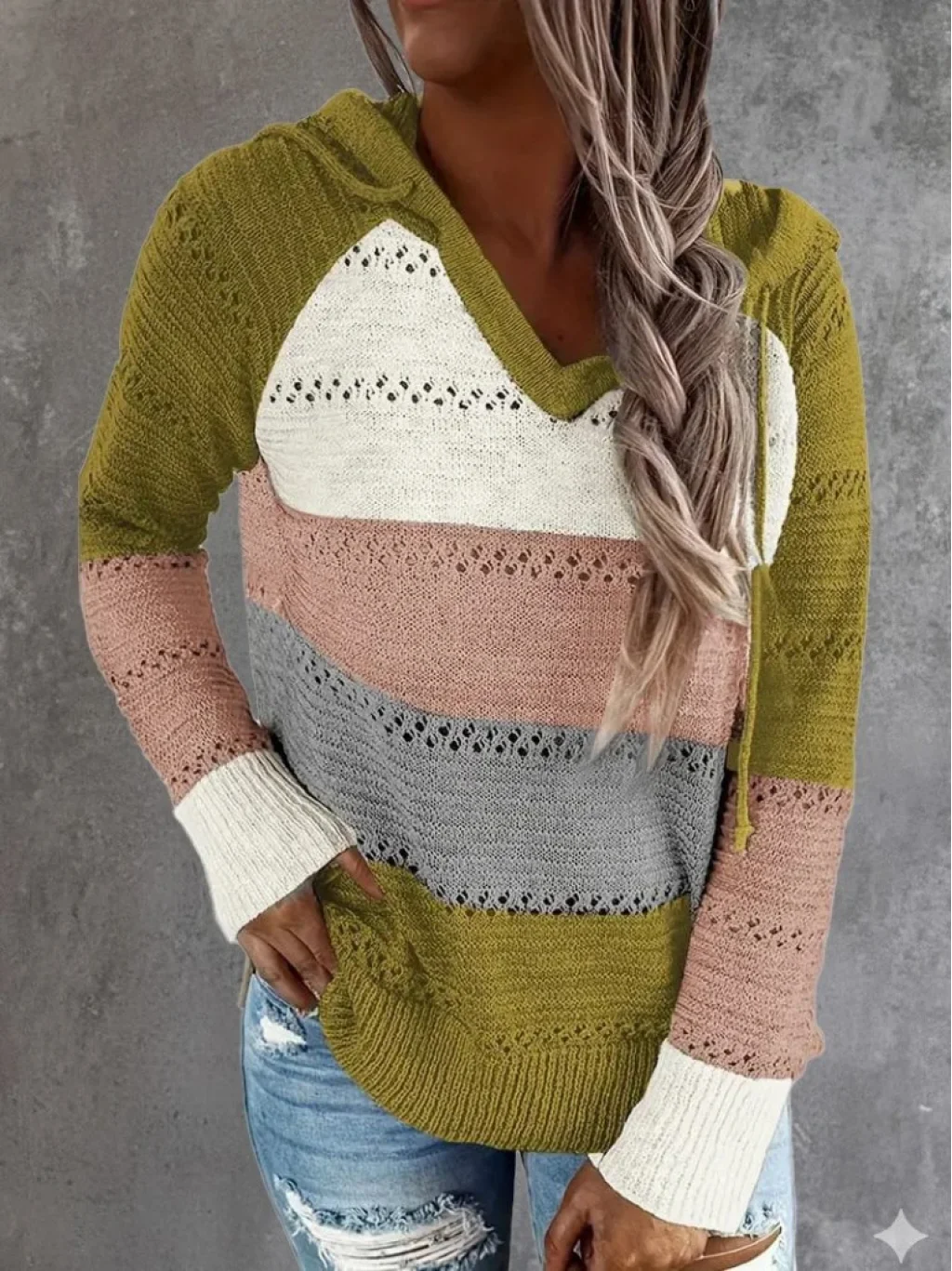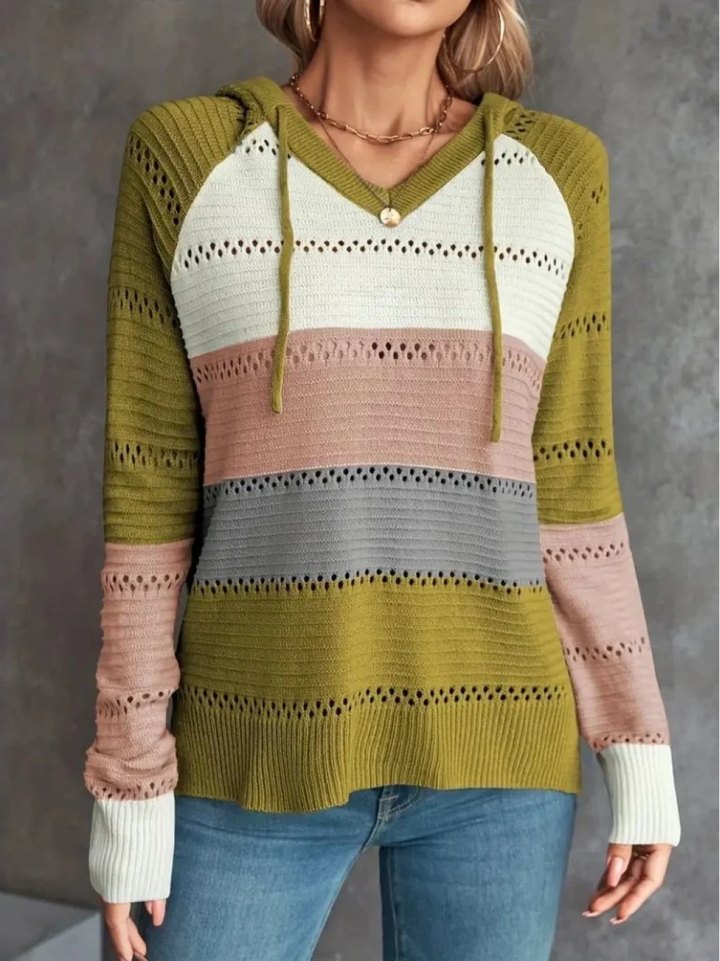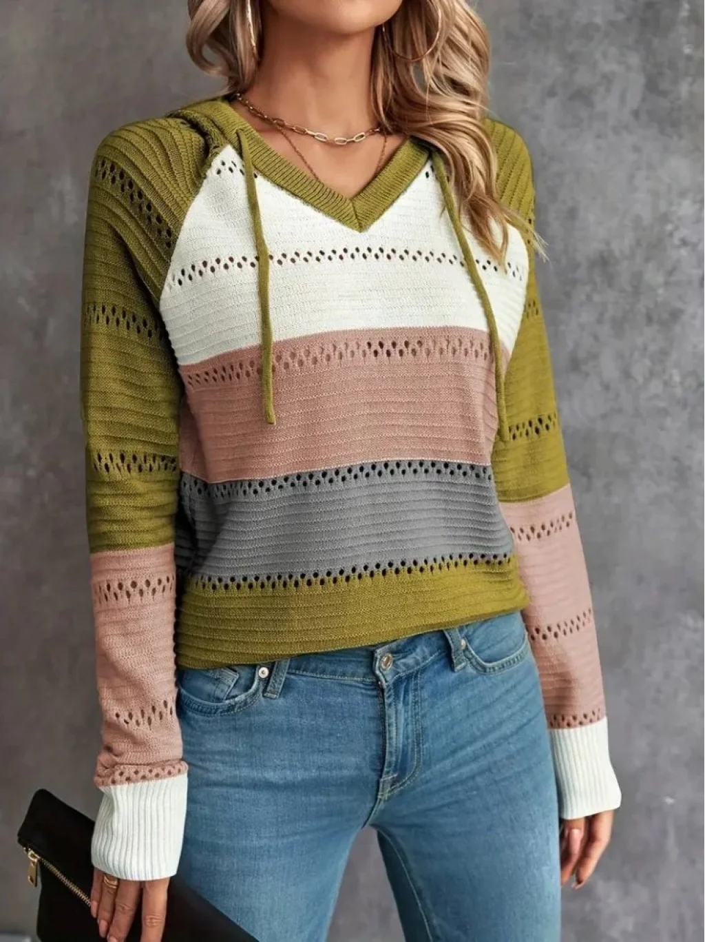Kadın Uzun Kollu V Yakalı Bağcıklı Kapşonlu Triko Bluz