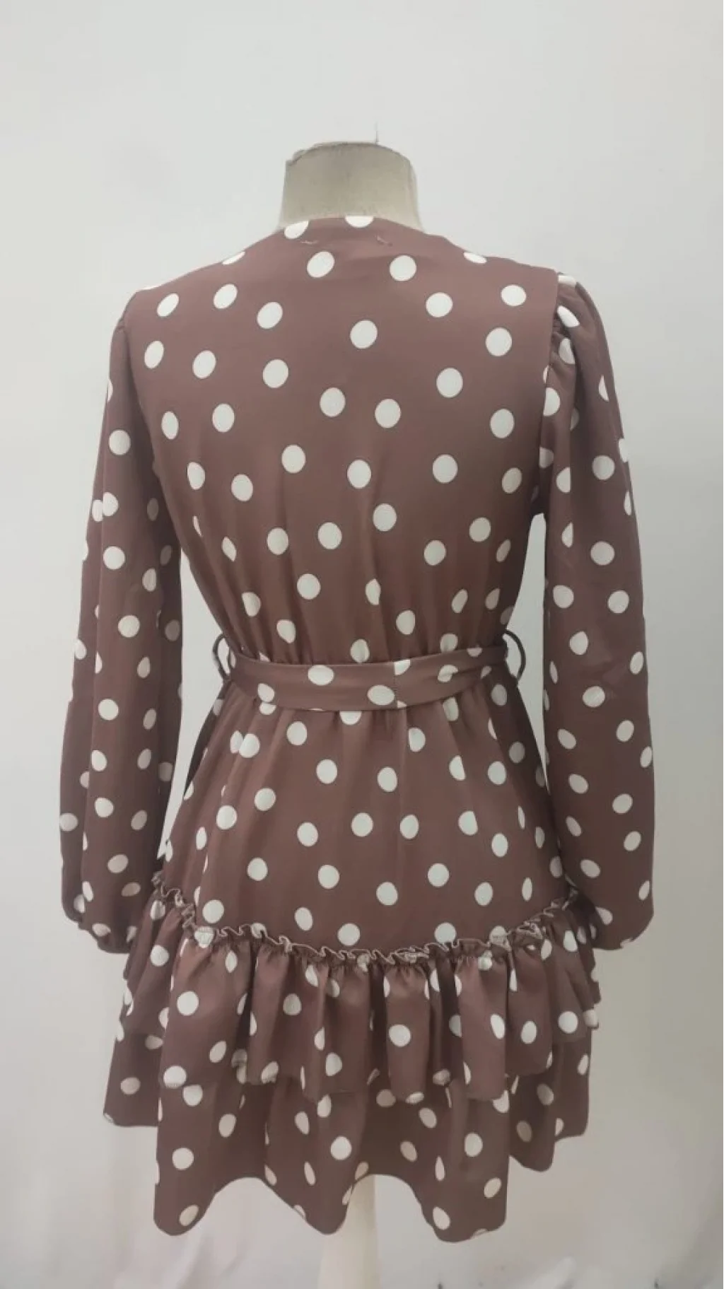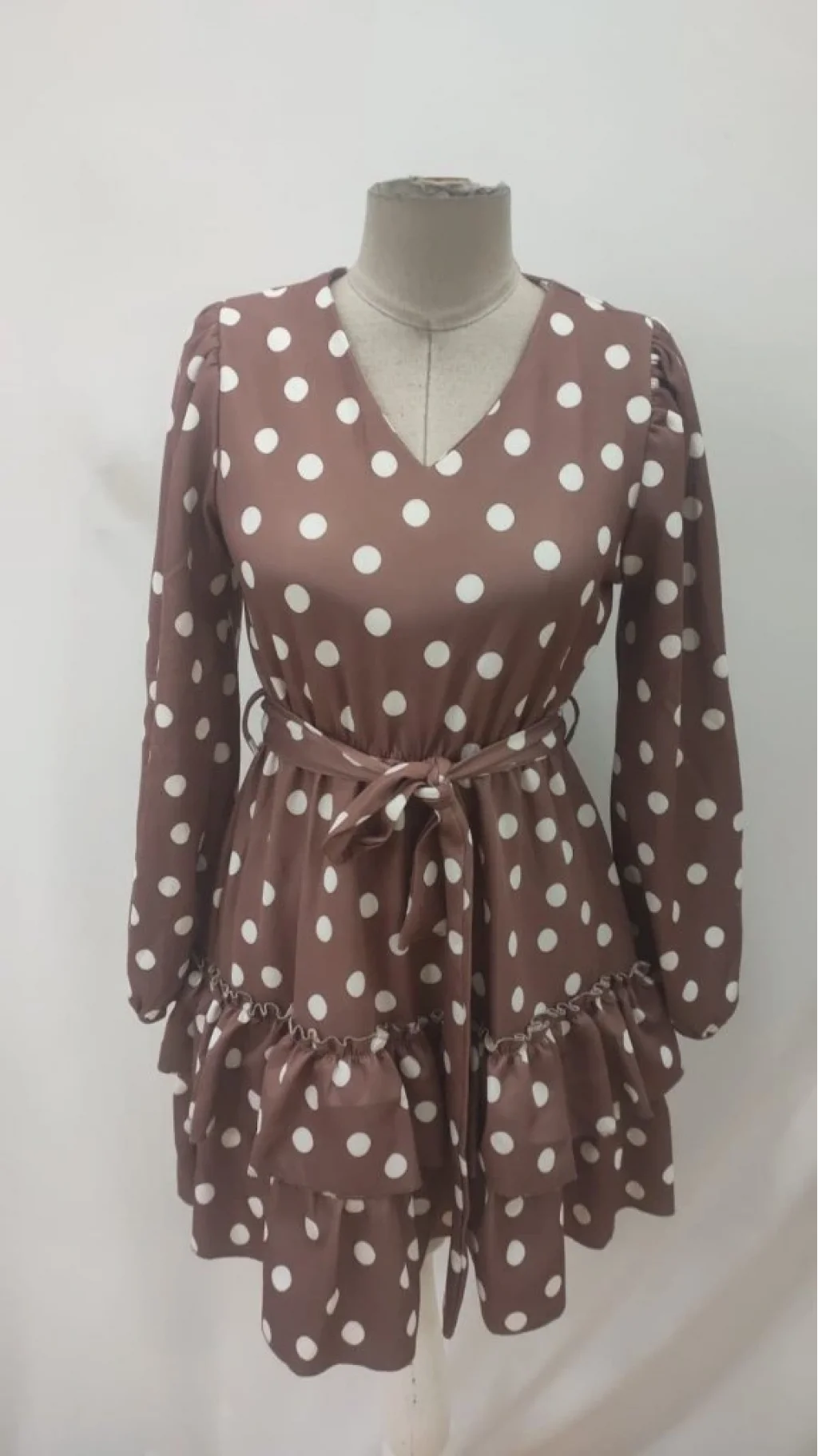 Kadın Uzun Kollu V Yakalı Belden Kuşaklı Puantiyeli Mini Modal Elbise