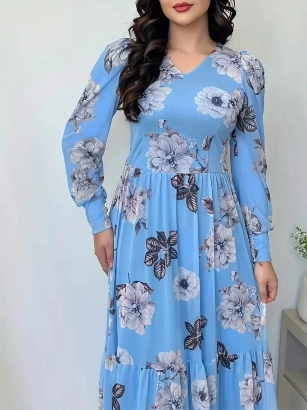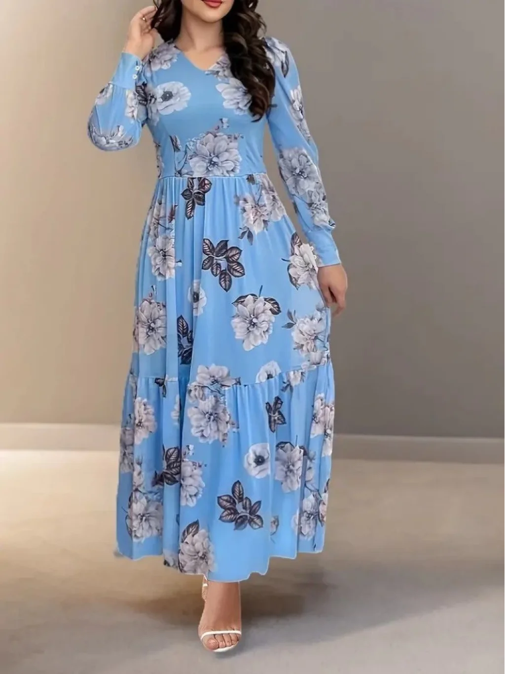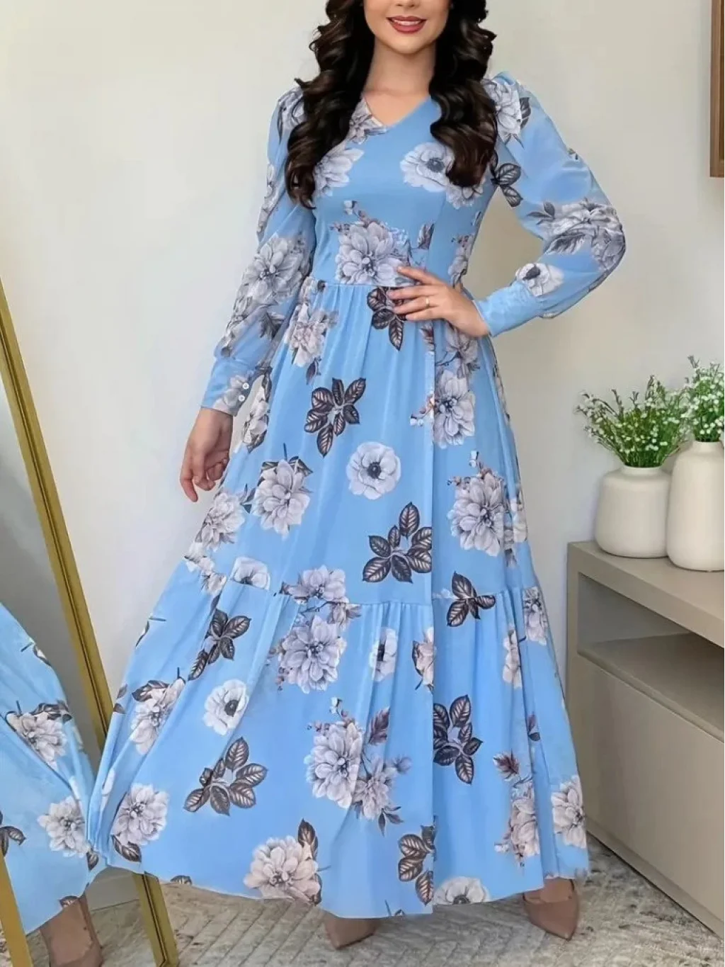 Kadın Uzun Kollu V Yakalı çiçek Desenli Maxi Süprem Elbise