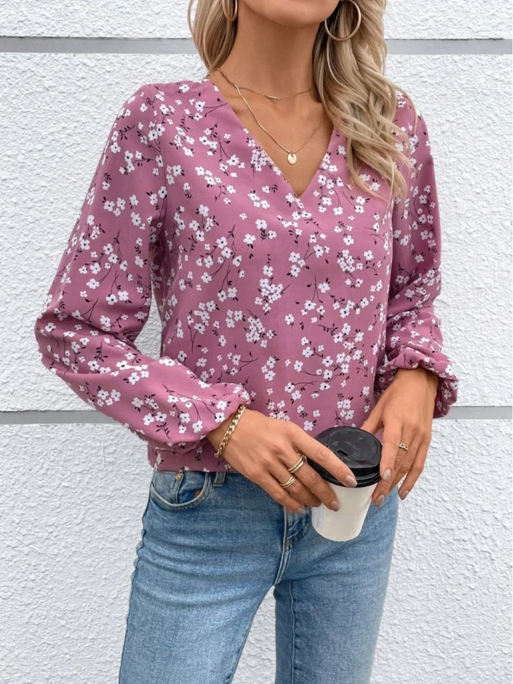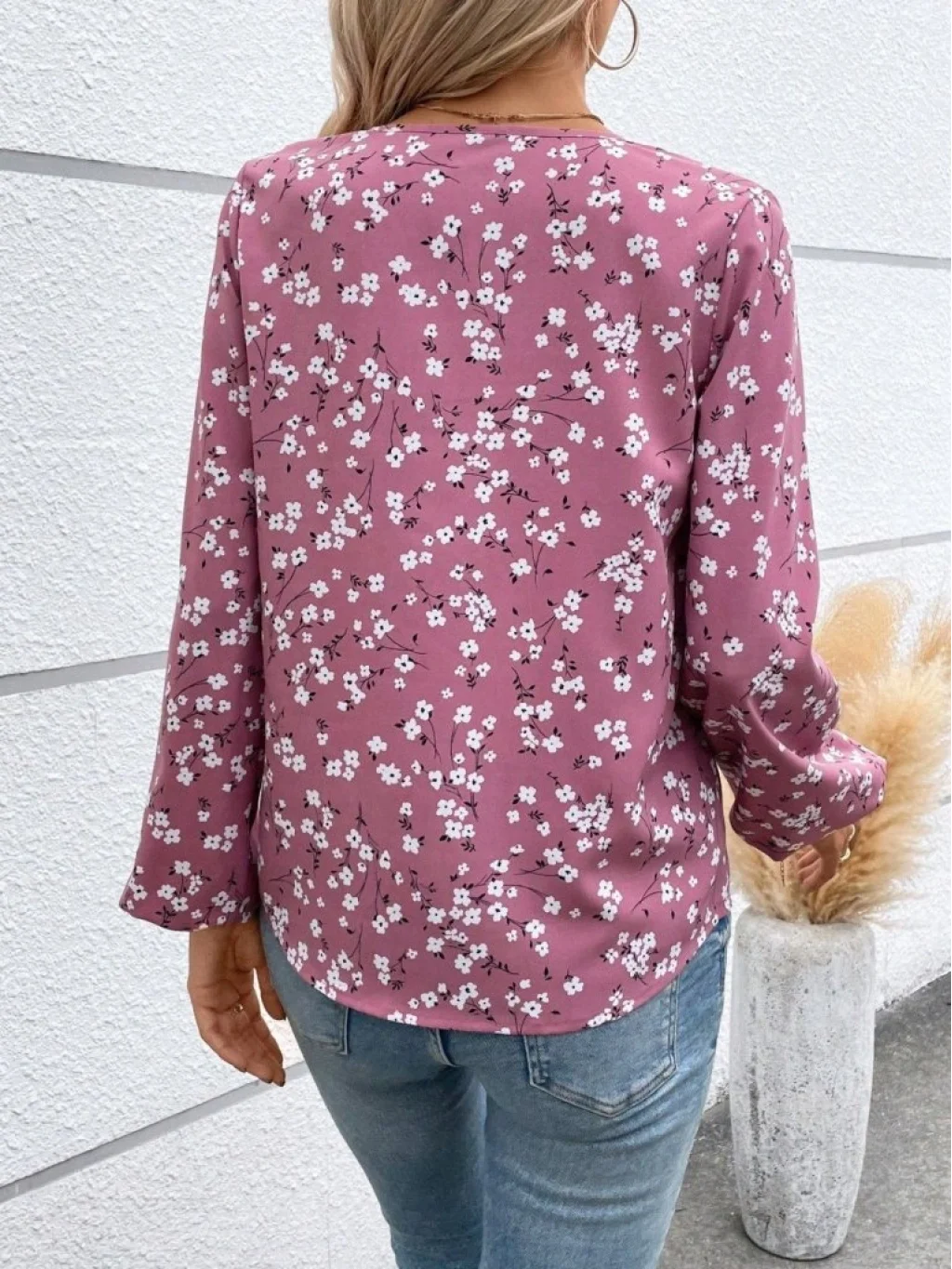 Kadın Uzun Kollu V Yakalı çiçek Desenli Modal Bluz