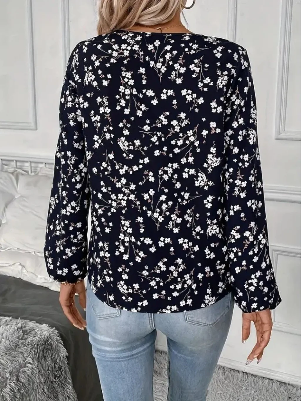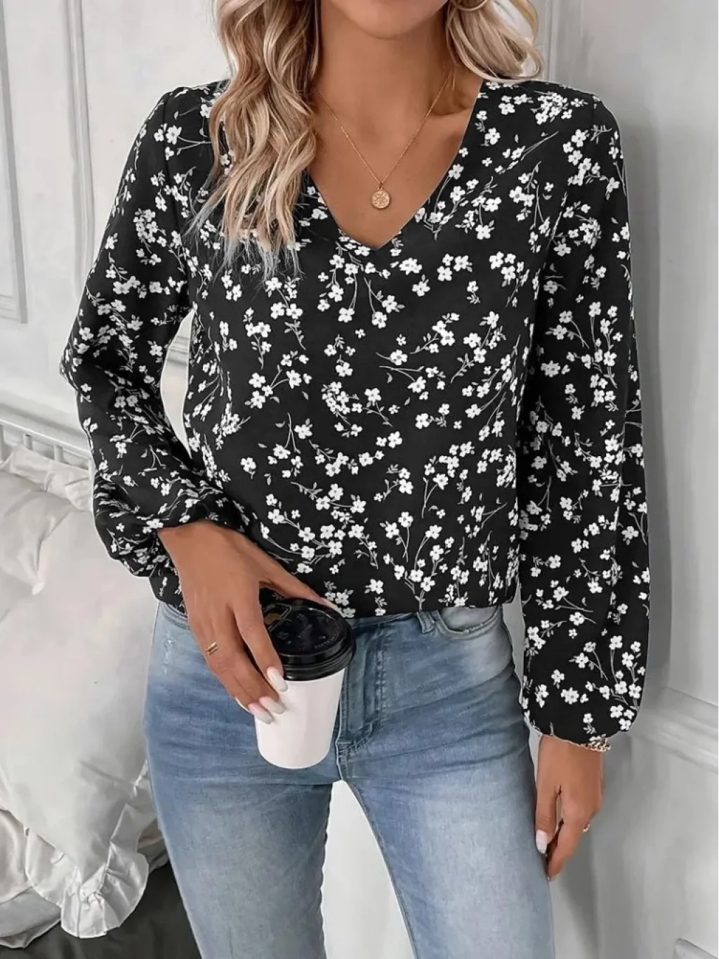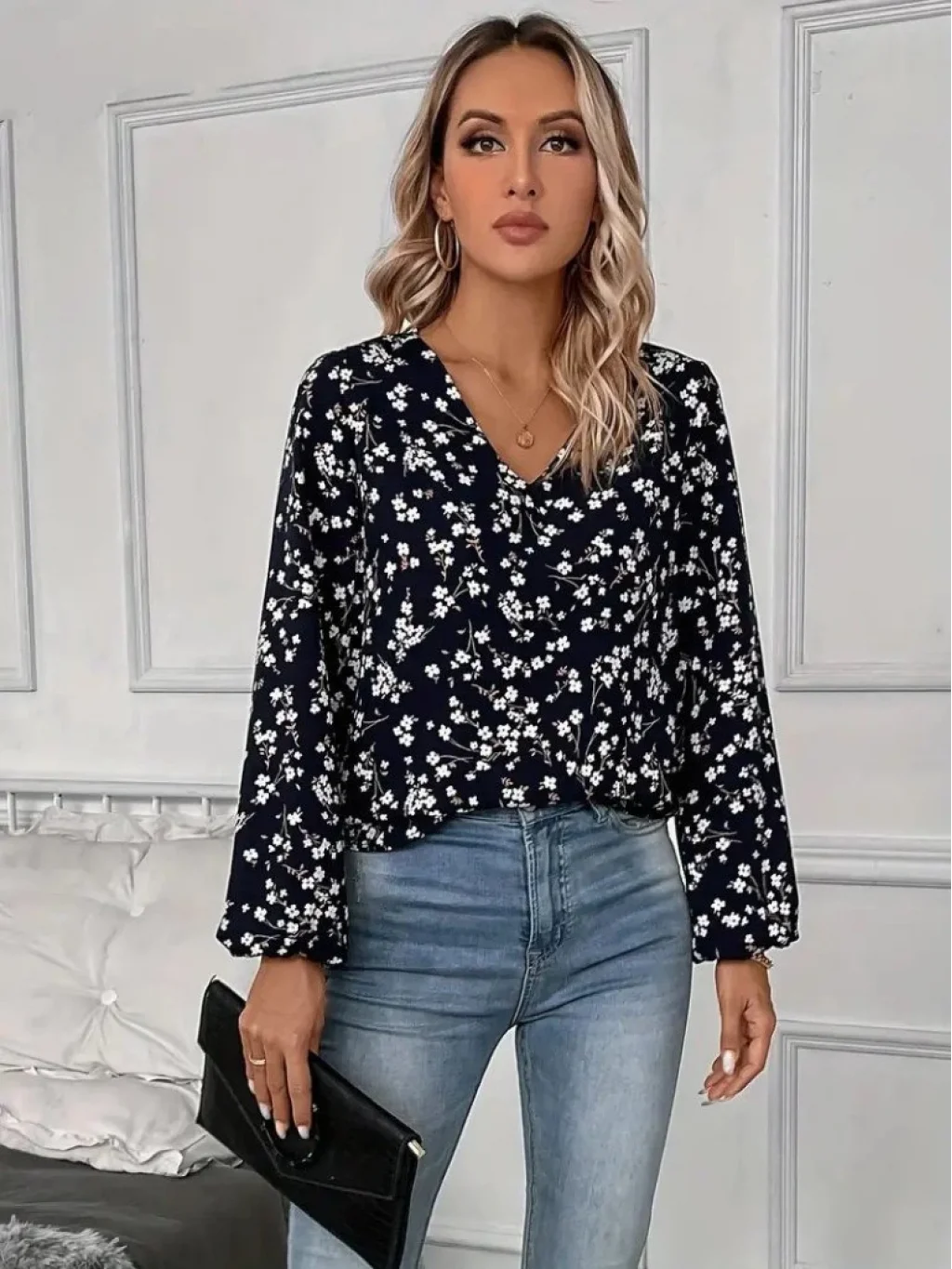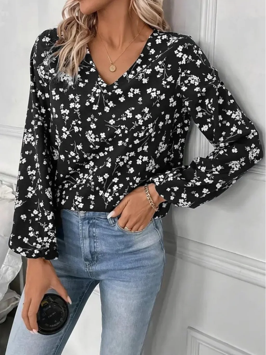 Kadın Uzun Kollu V Yakalı çiçek Desenli Modal Bluz