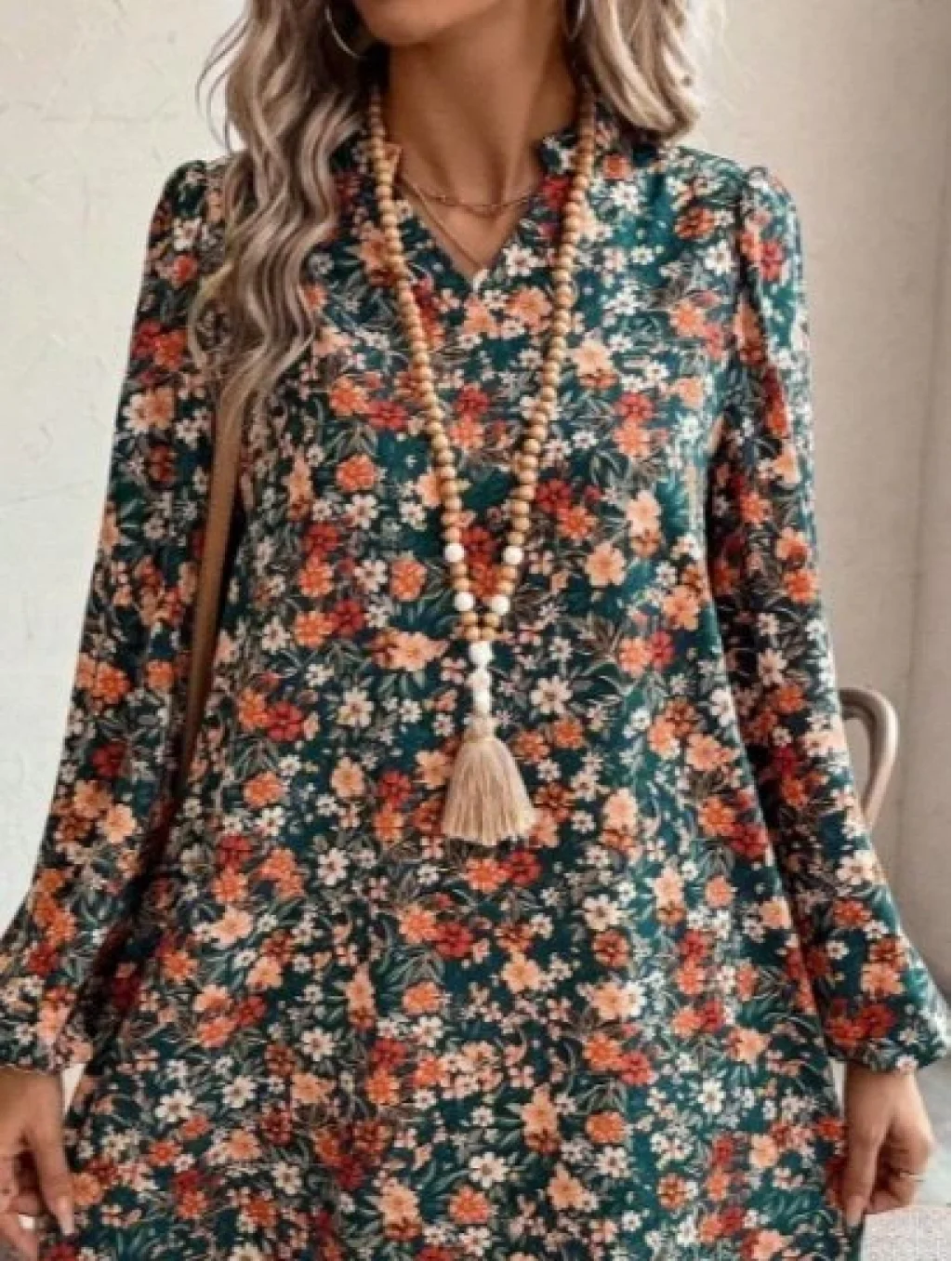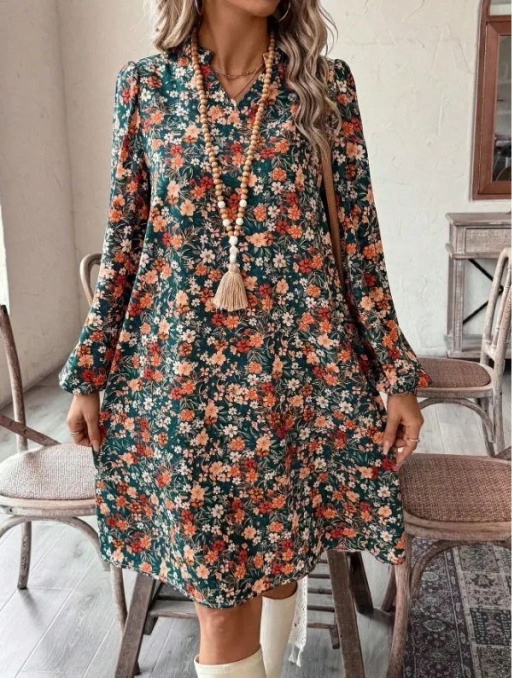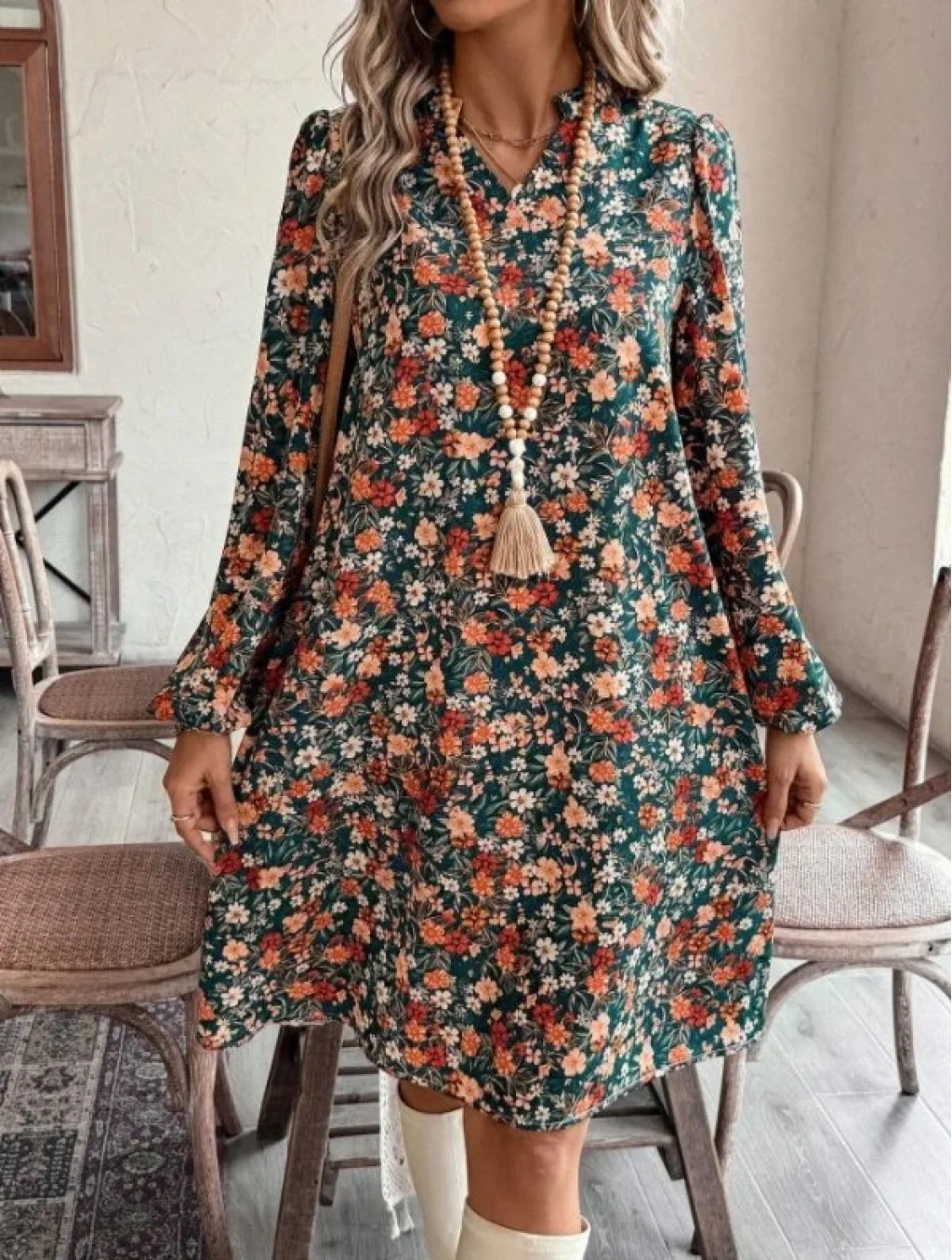 Kadın Uzun Kollu V Yakalı Desenli Modal Mini Elbise