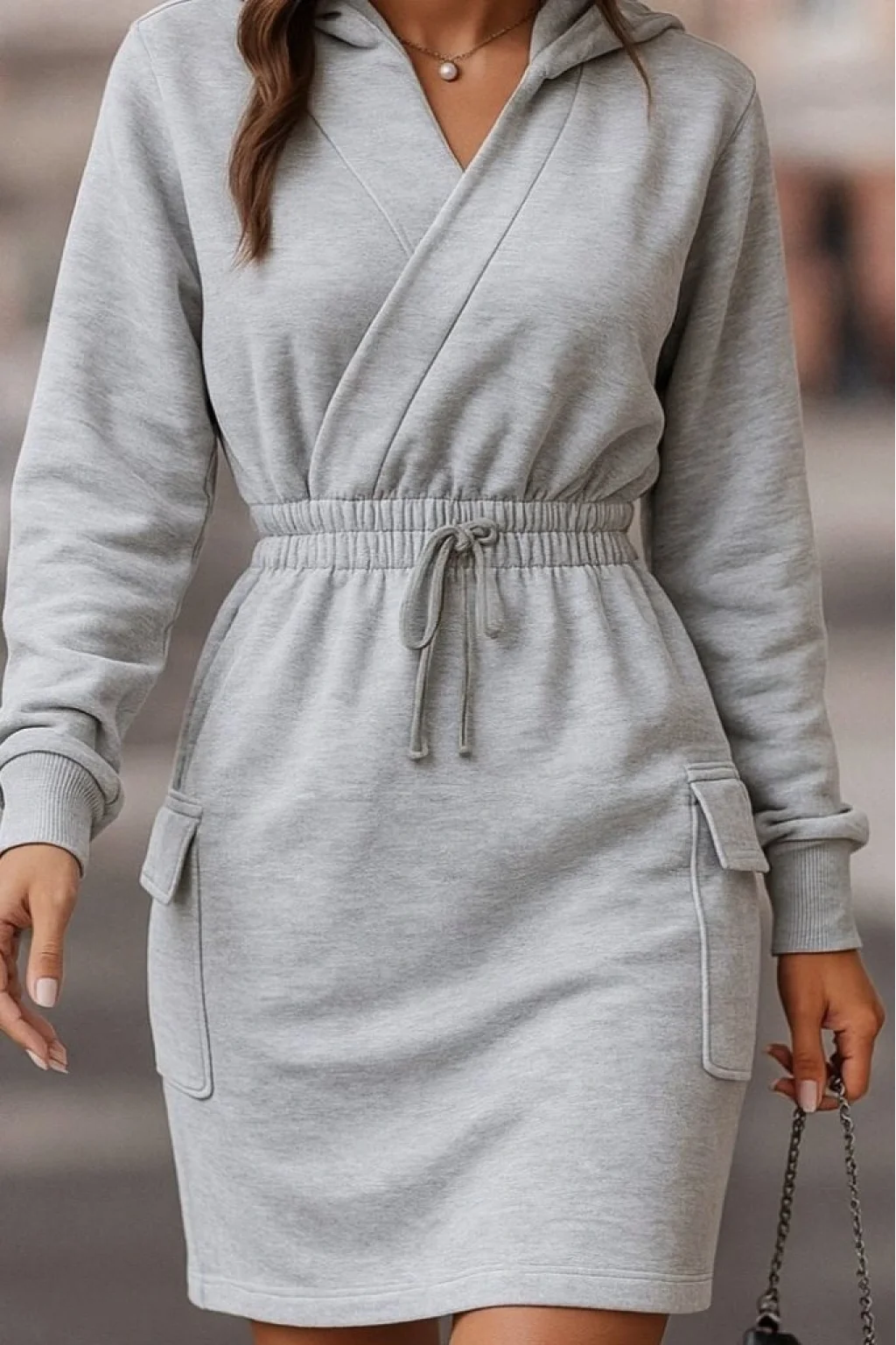 Kadın Uzun Kollu V Yakalı Kapşonlu Cep Detaylı şardonlu Iki Iplik Kısa Elbise