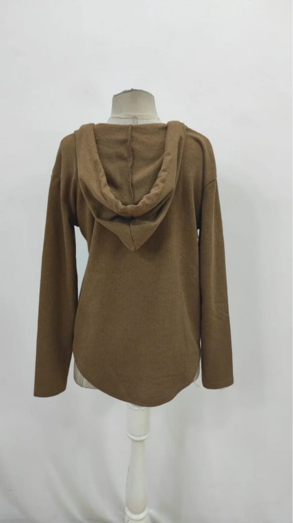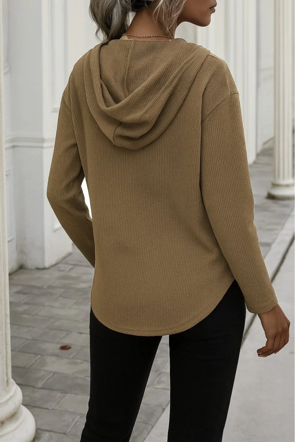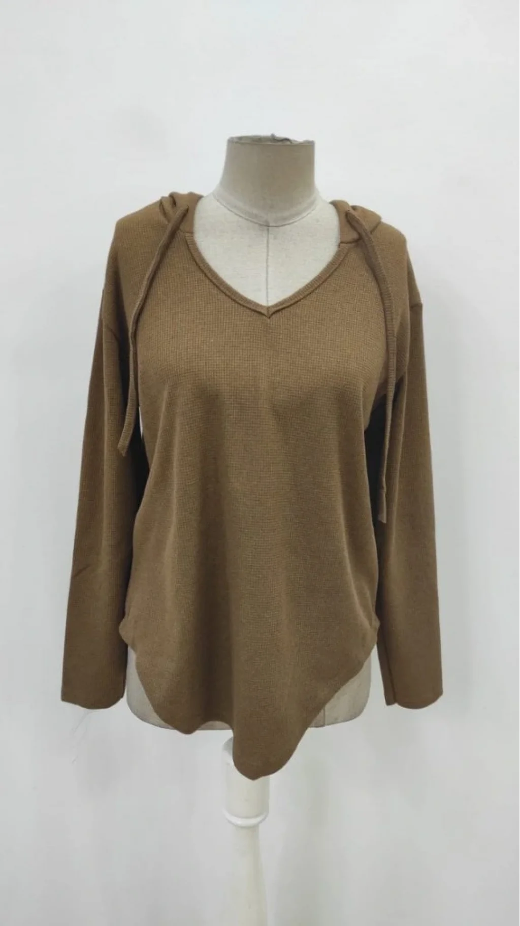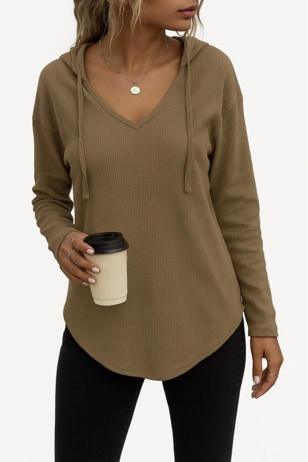 Kadın Uzun Kollu V Yakalı Kapşonlu Waffle Bluz