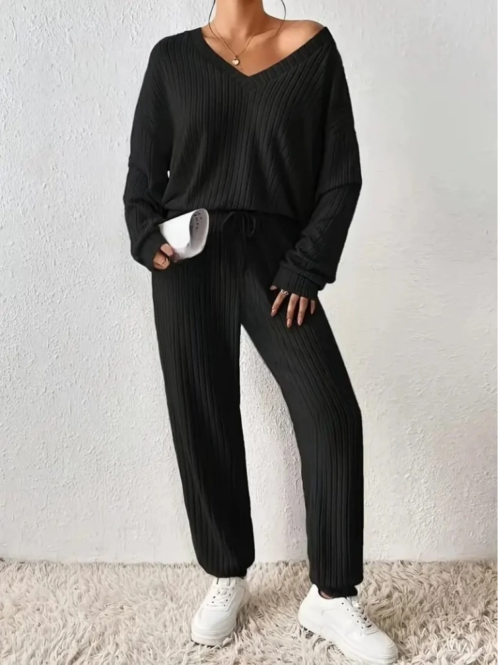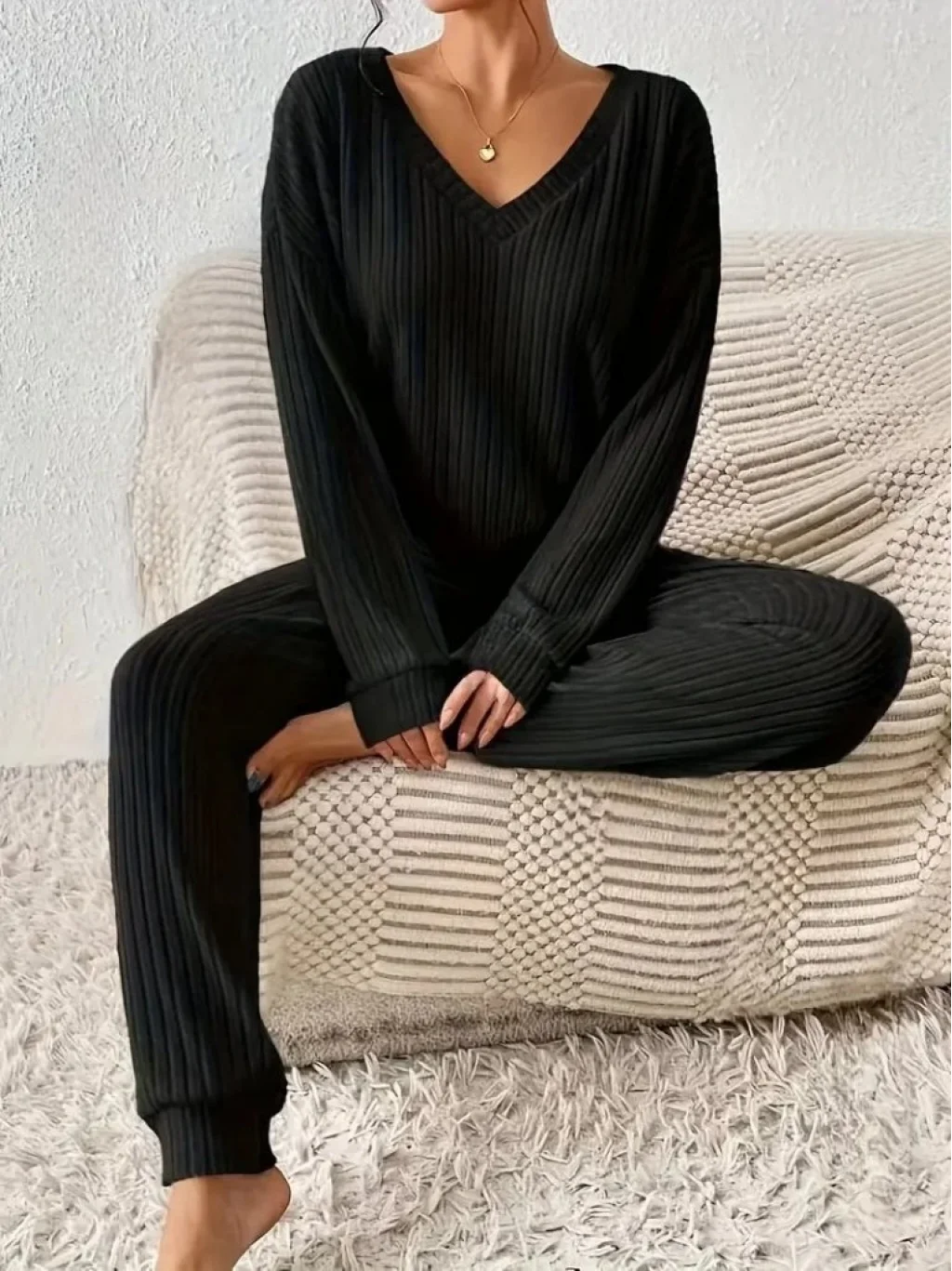 Kadın Uzun Kollu V Yakalı Kaşkorse Bluz Ve Pantolon Ikili Takım