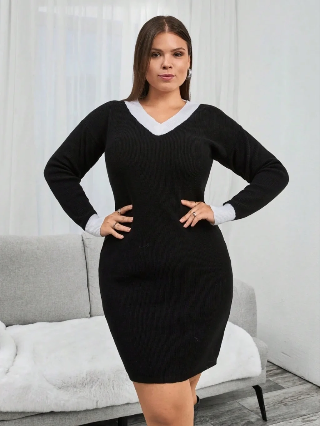 Kadın Uzun Kollu V Yakalı Kısa Triko Elbise