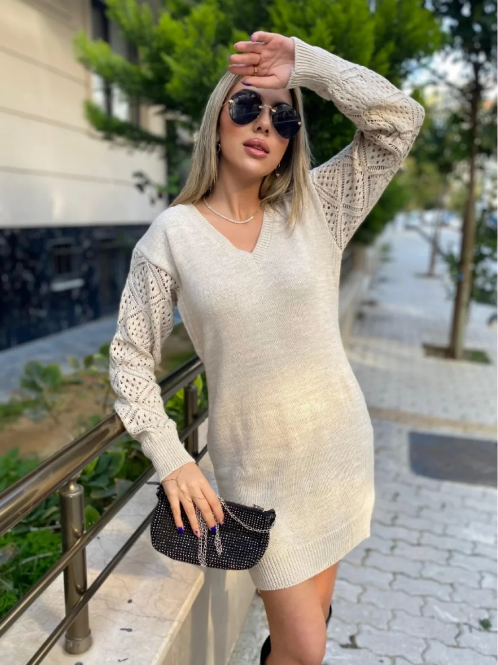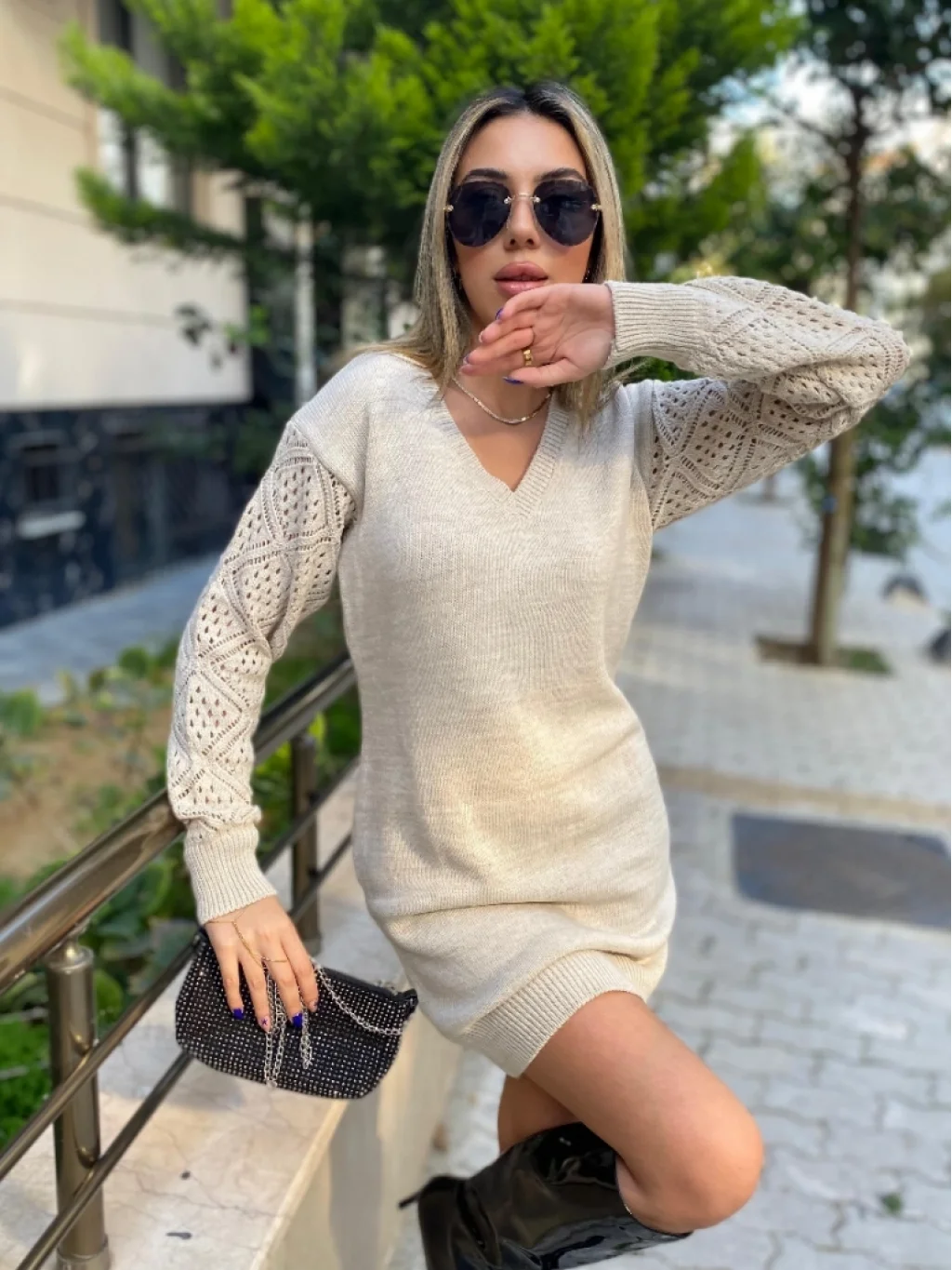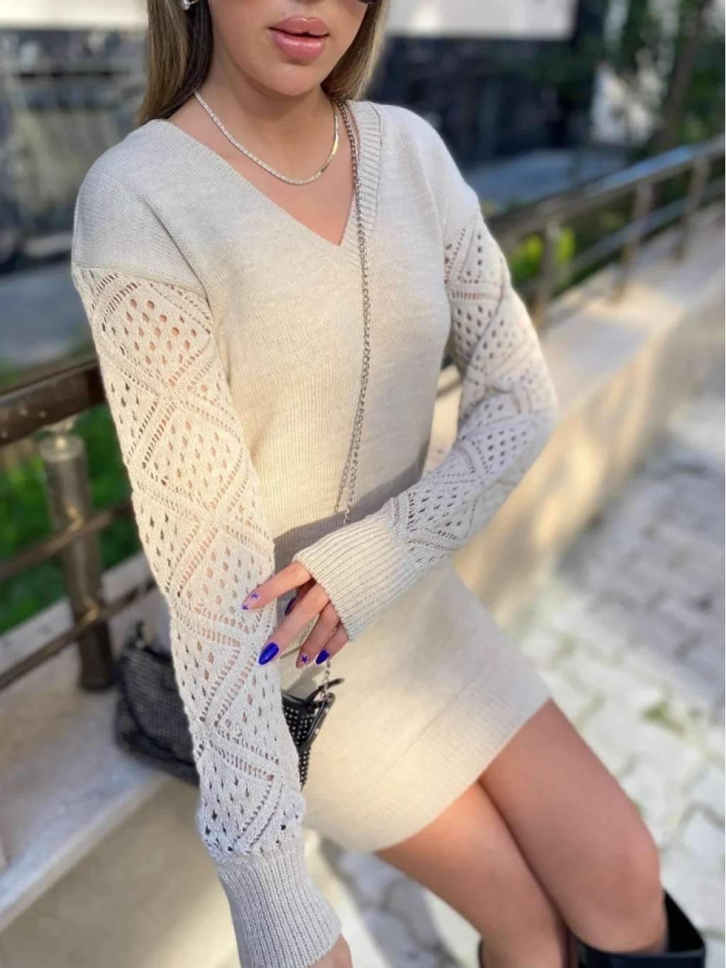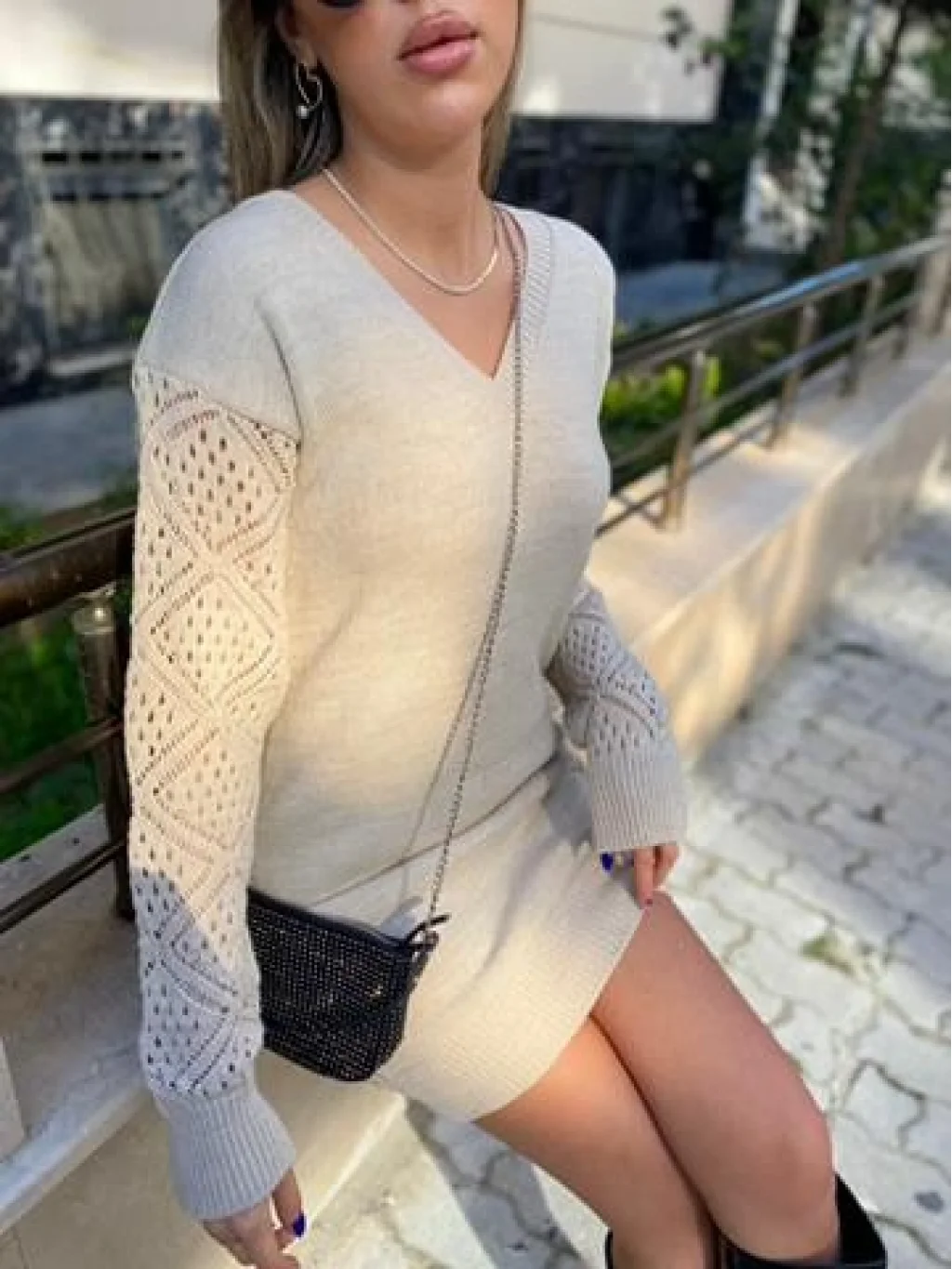 Kadın Uzun Kollu V Yakalı Mini Triko Elbise