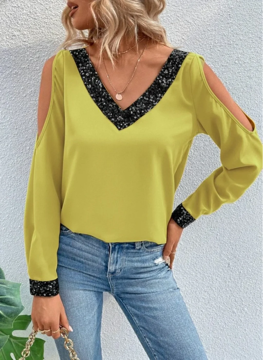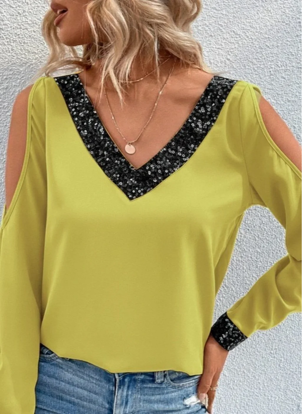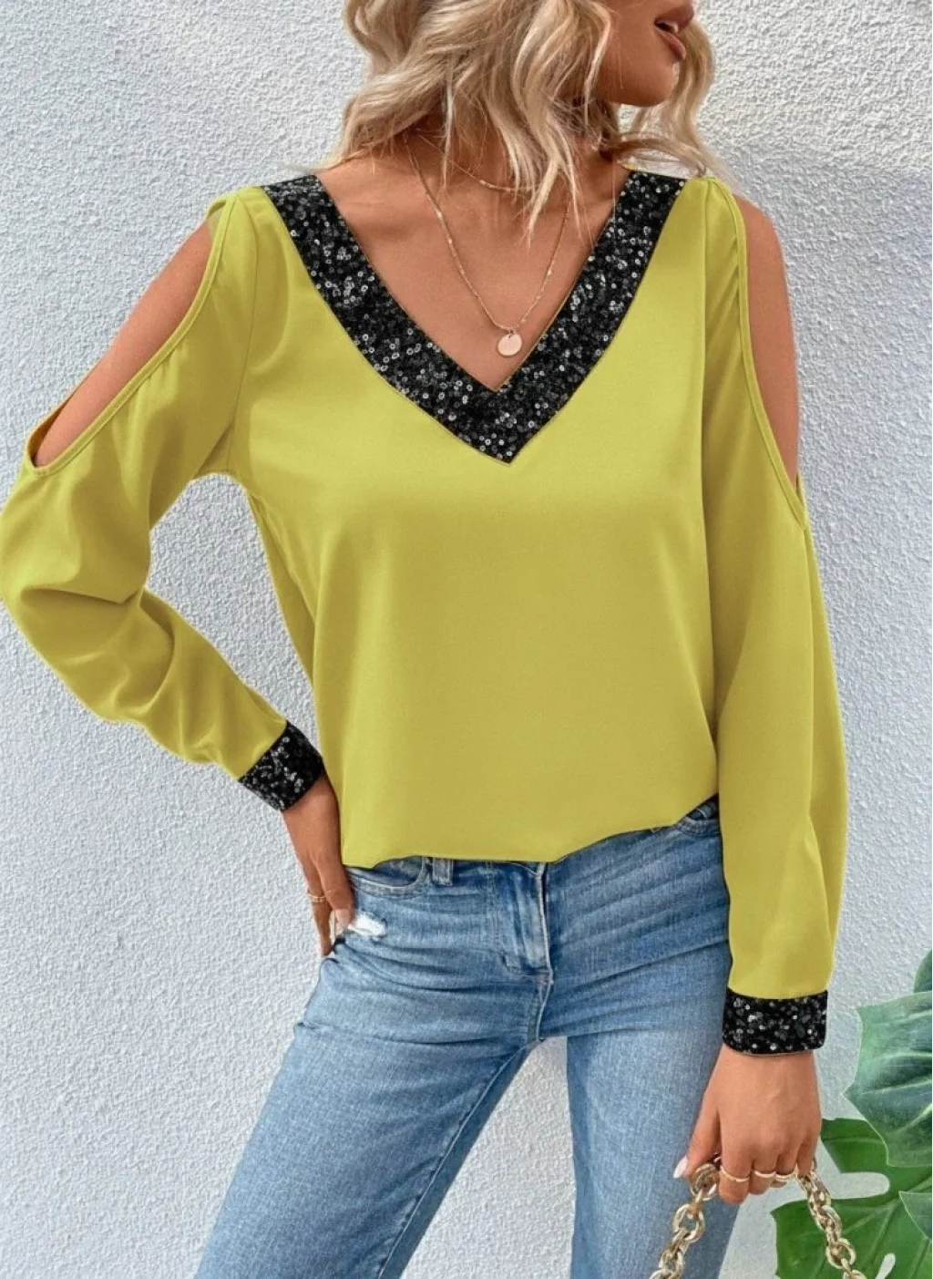 Kadın Uzun Kollu V Yakalı Omuzlardan Açık Sandy Bluz