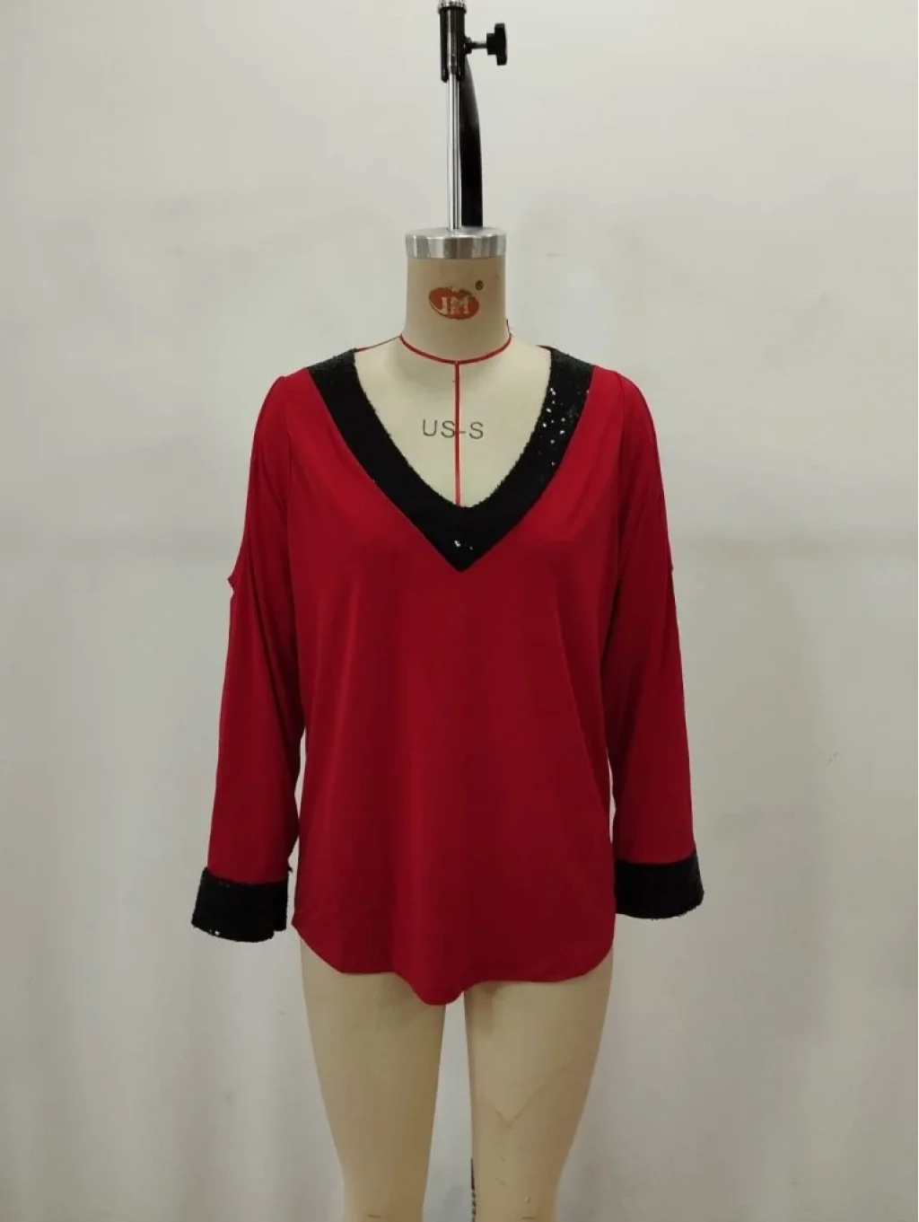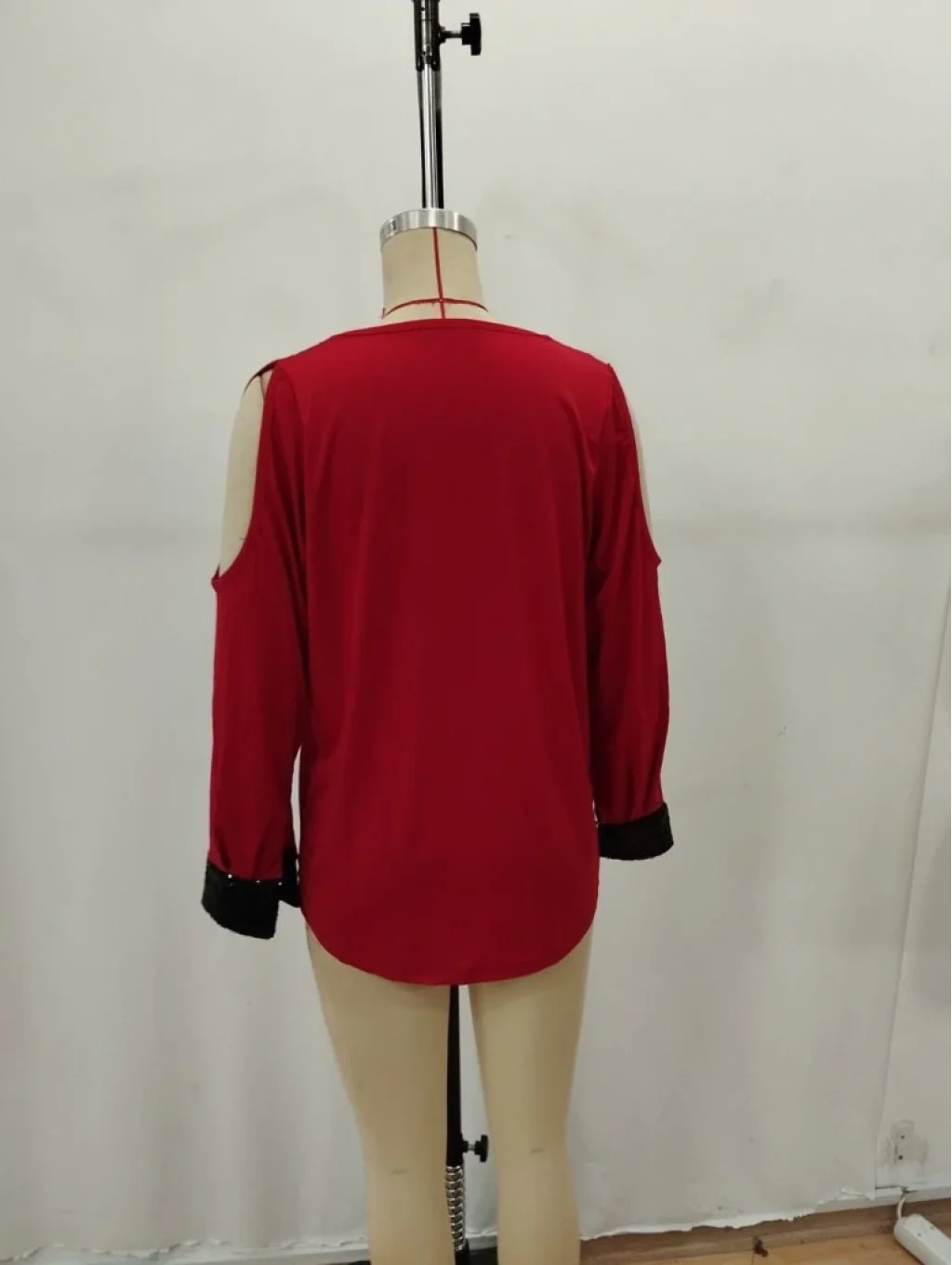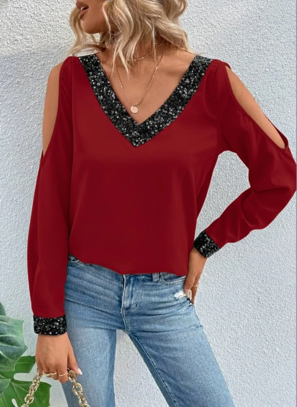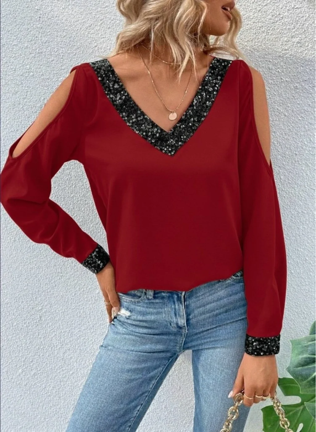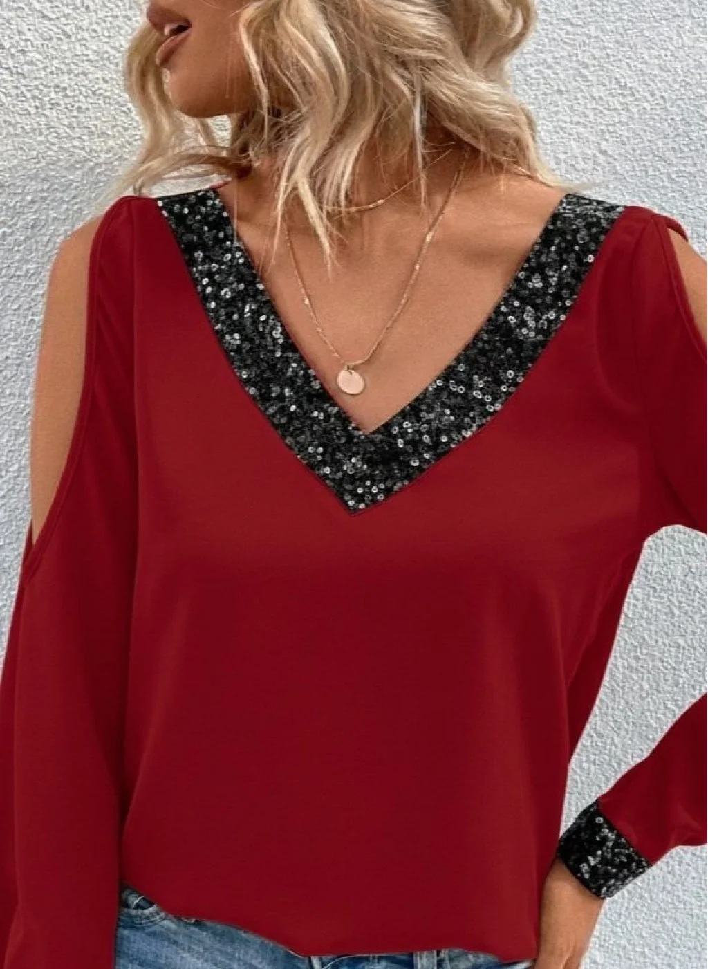 Kadın Uzun Kollu V Yakalı Omuzlardan Açık Sandy Bluz