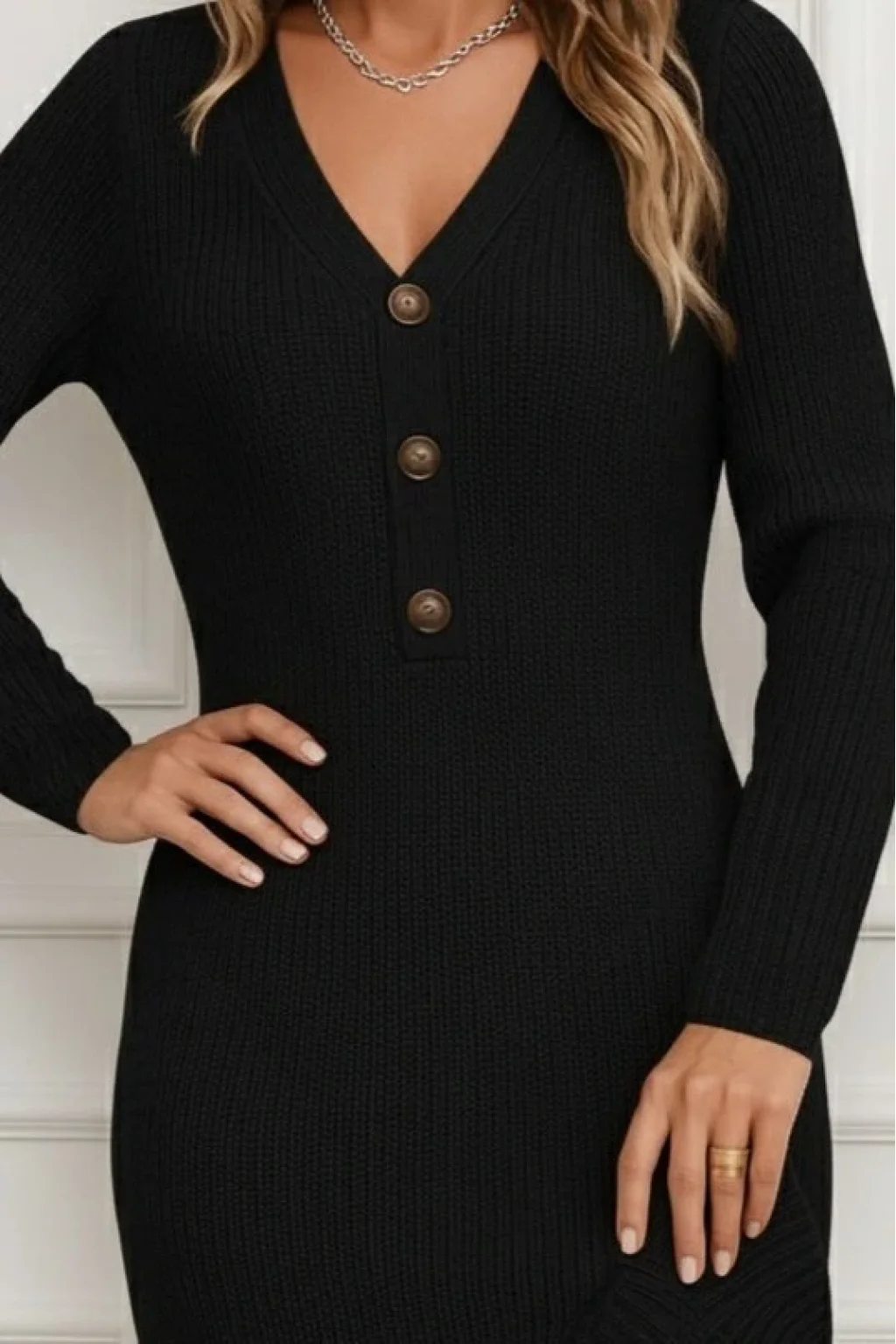 Kadın Uzun Kollu V Yakalı önden Düğmeli Kısa Triko Elbise