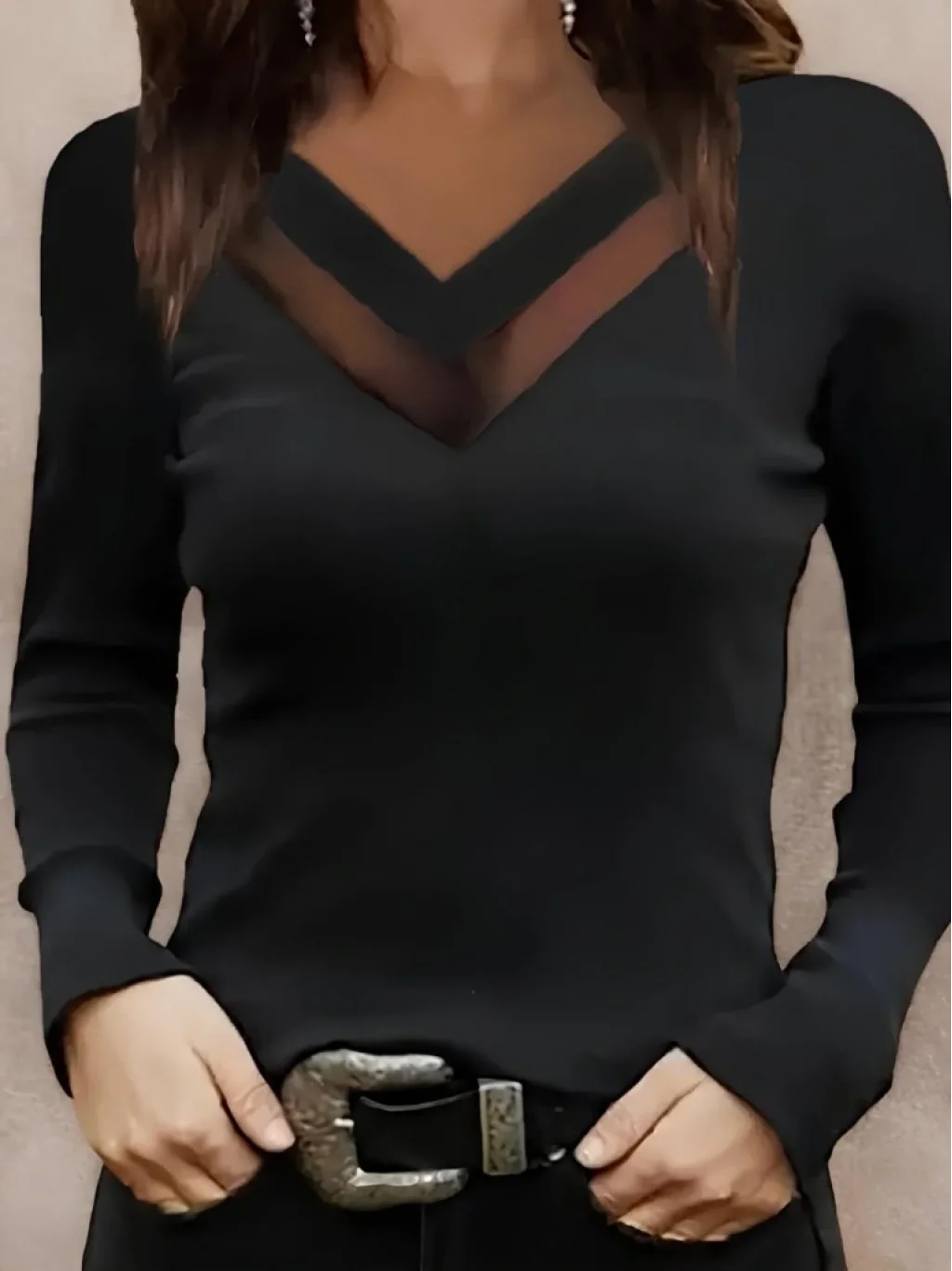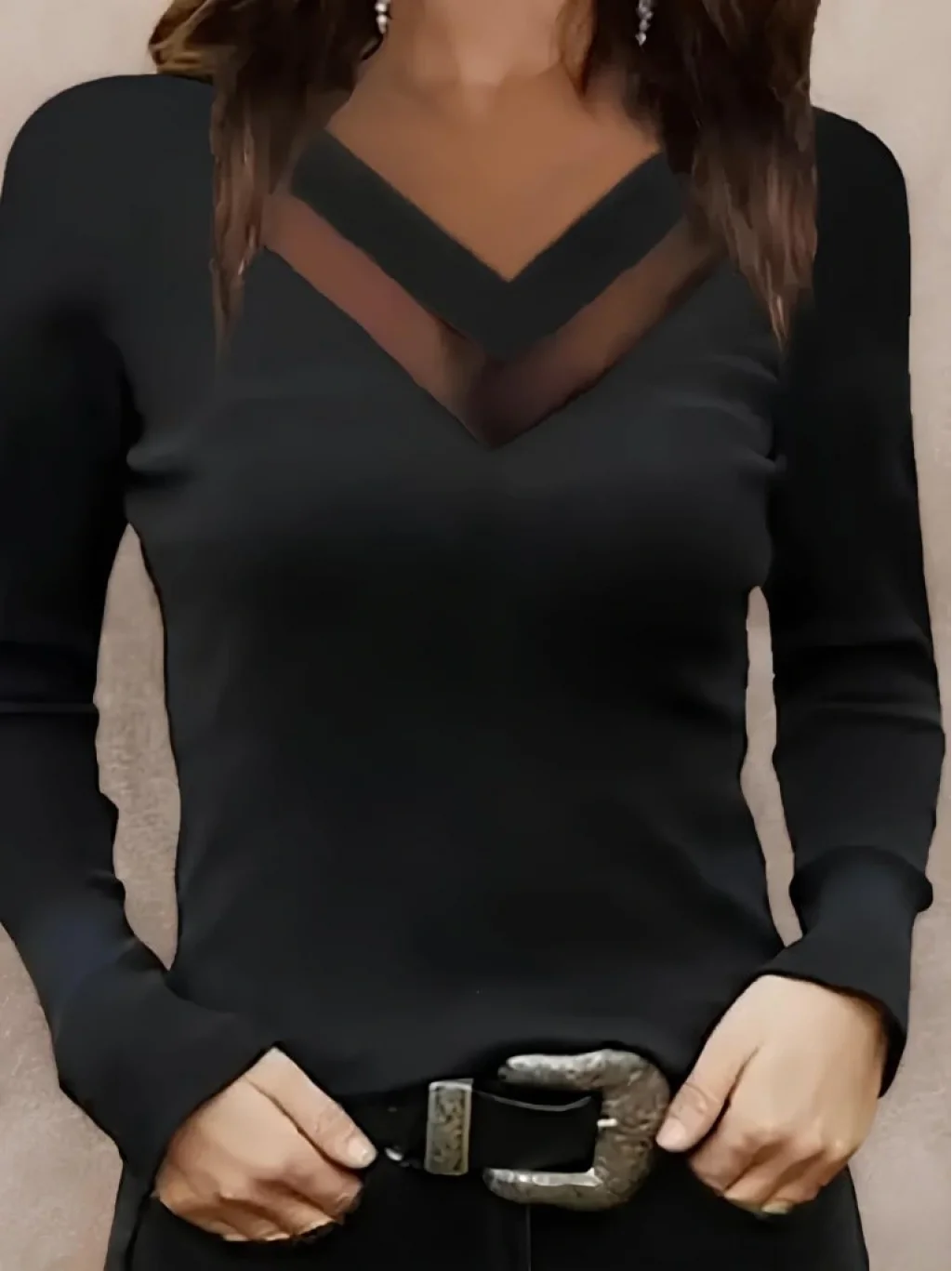 Kadın Uzun Kollu V Yakalı Tül Göğüs Dekolte Detaylı Viskon Bluz