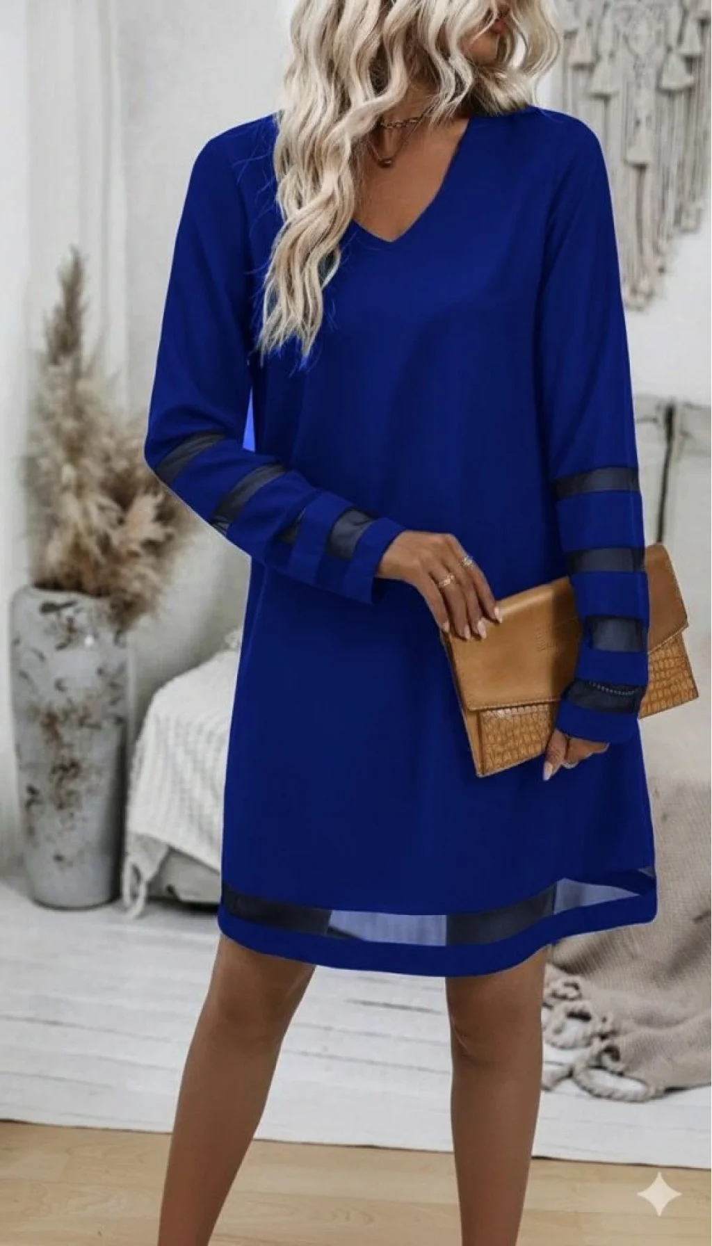 Kadın Uzun Kollu V Yakalı Tül şerit Detaylı Mini Krep Elbise
