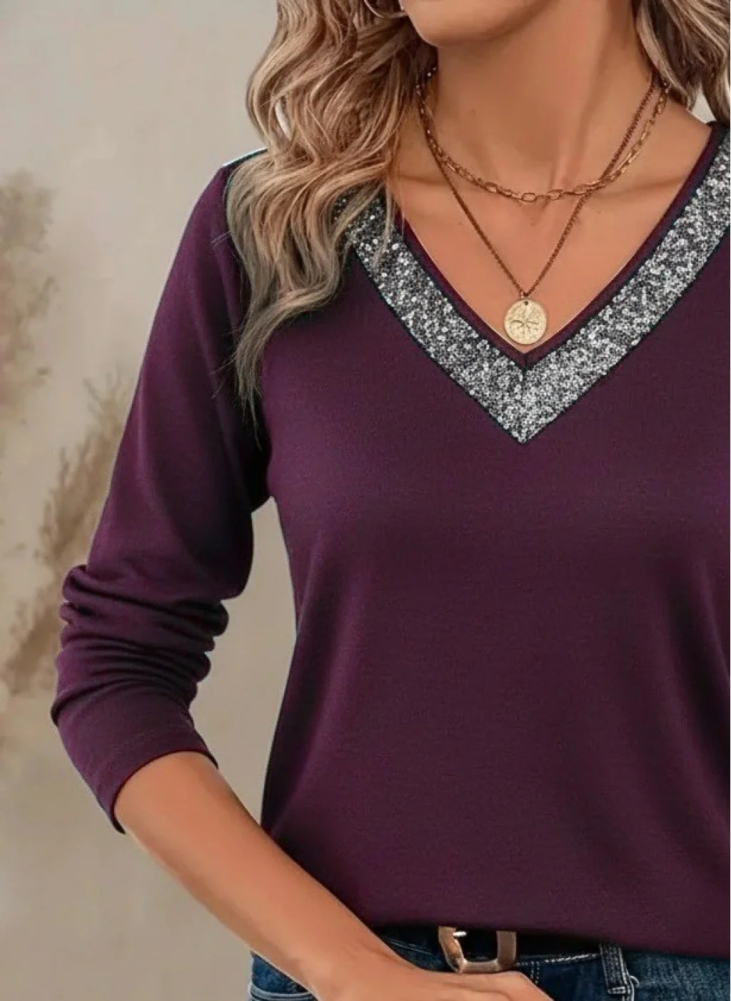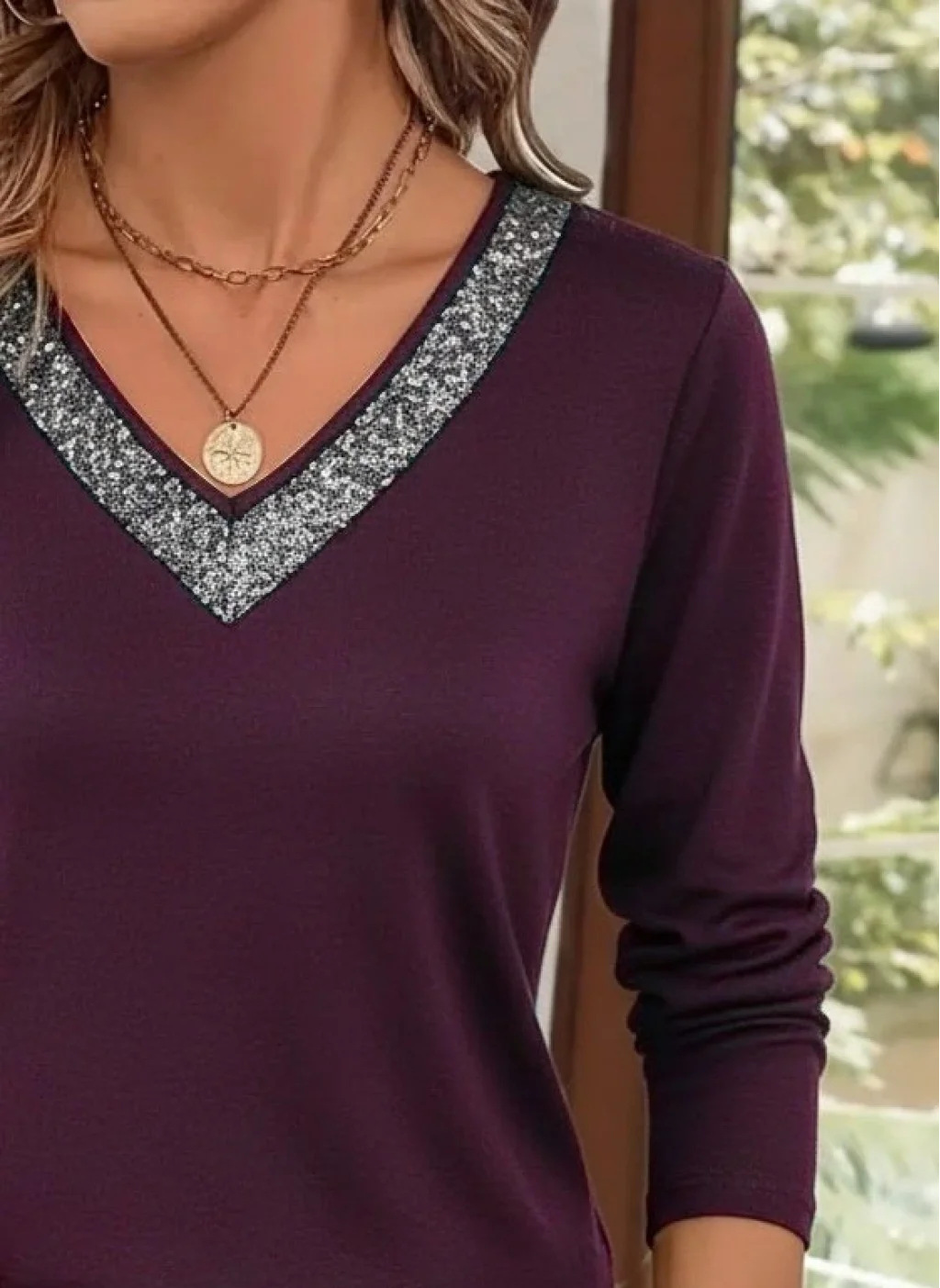 Kadın Uzun Kollu V Yakalı Viskon Mürdüm Bluz