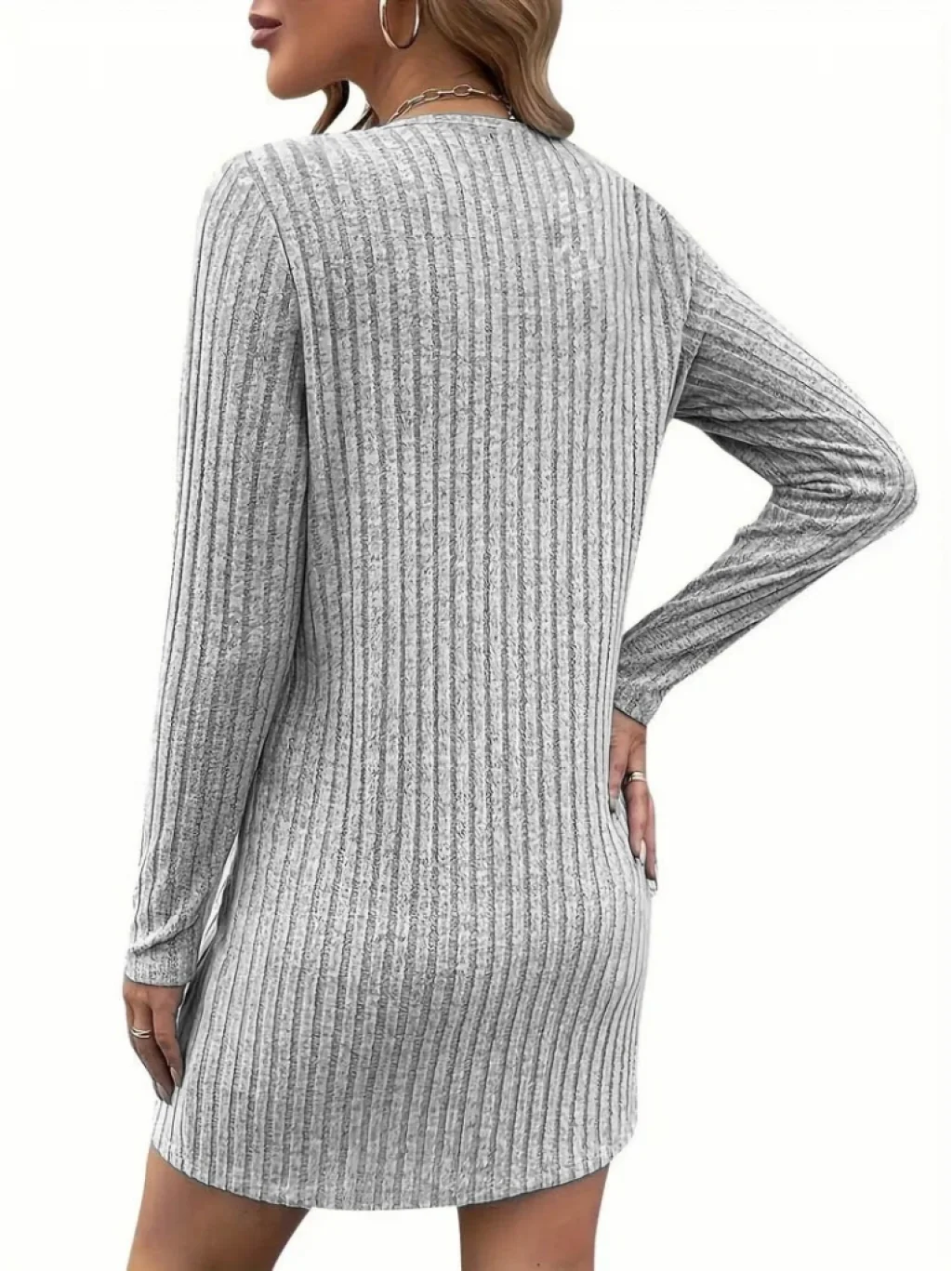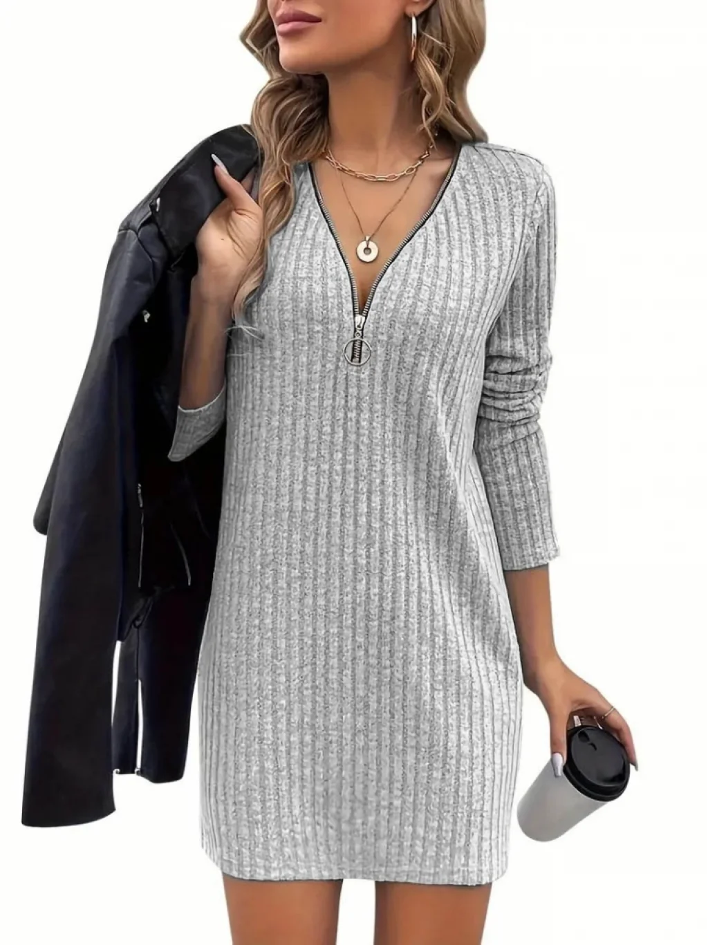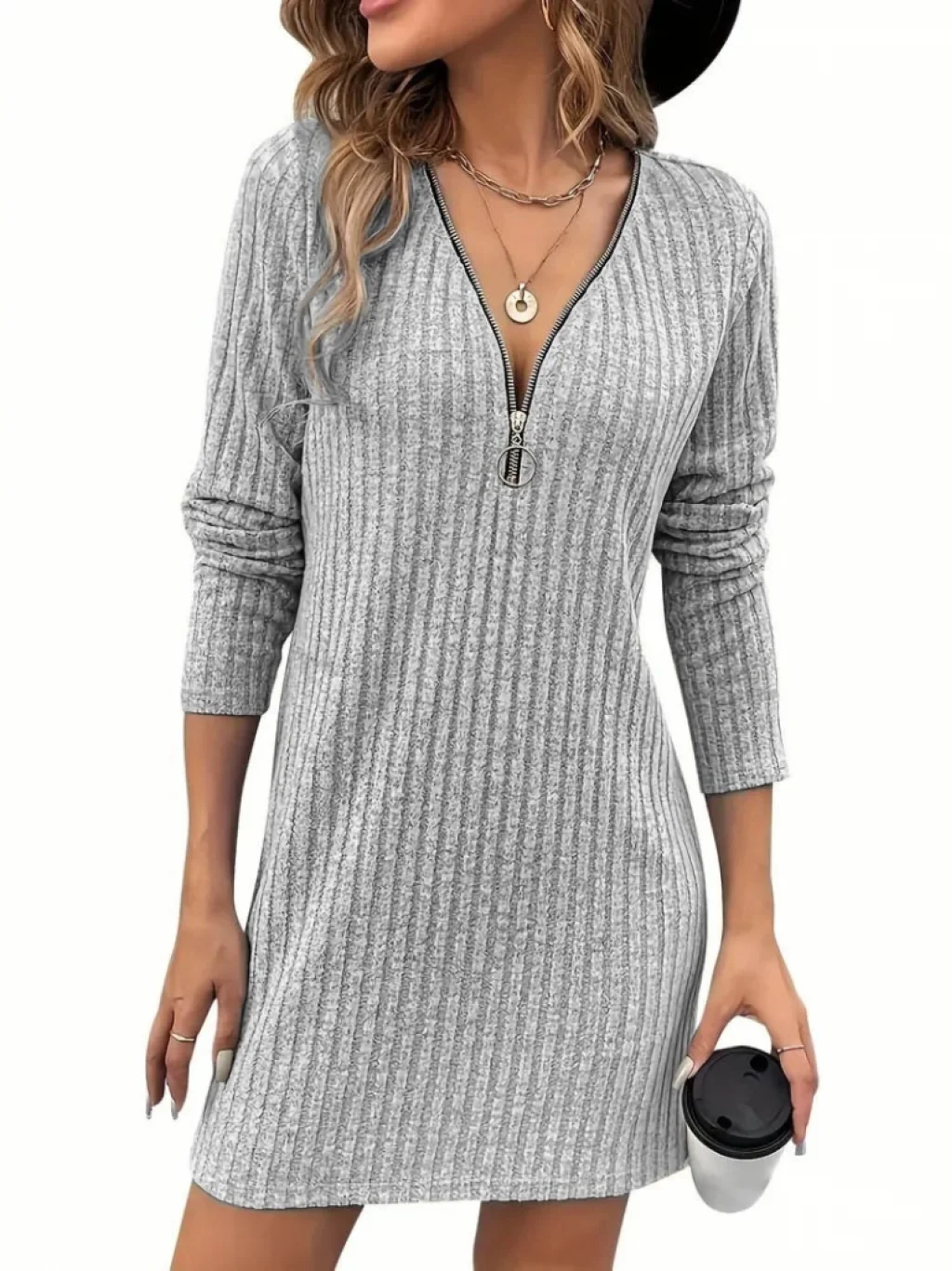 Kadın Uzun Kollu Yakadan Fermuarlı Kısa şardonlu Kaşkorse Elbise