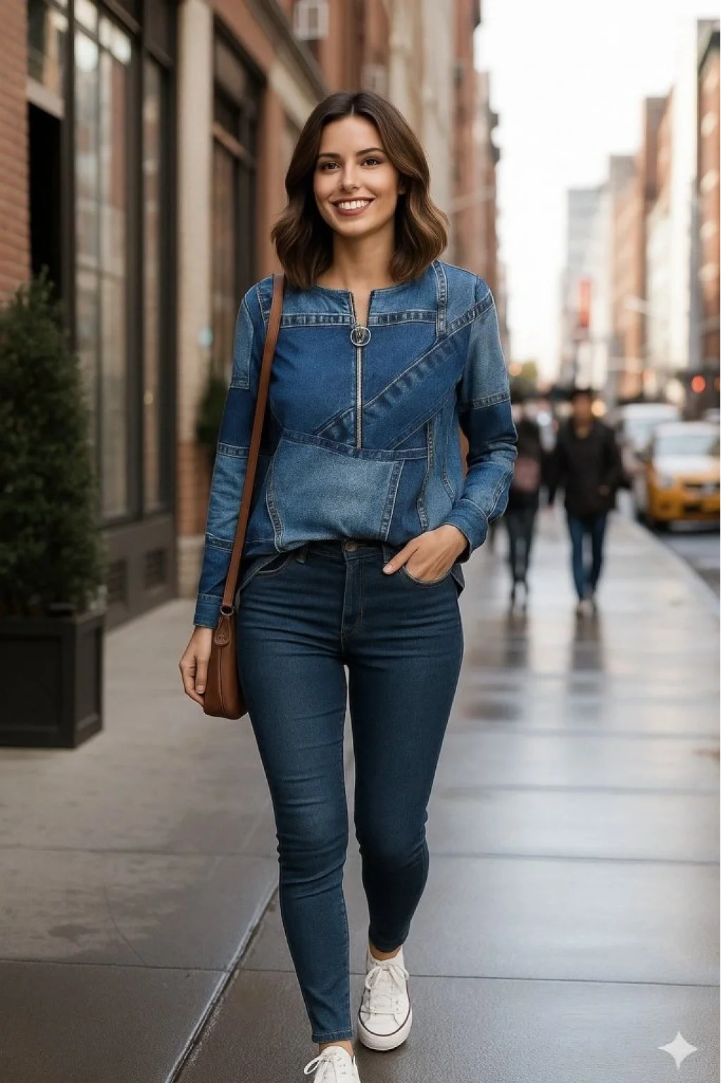Kadın Uzun Kollu Yakadan Fermuarlı Kot Görünüm Desenli Uzun Modal Bluz