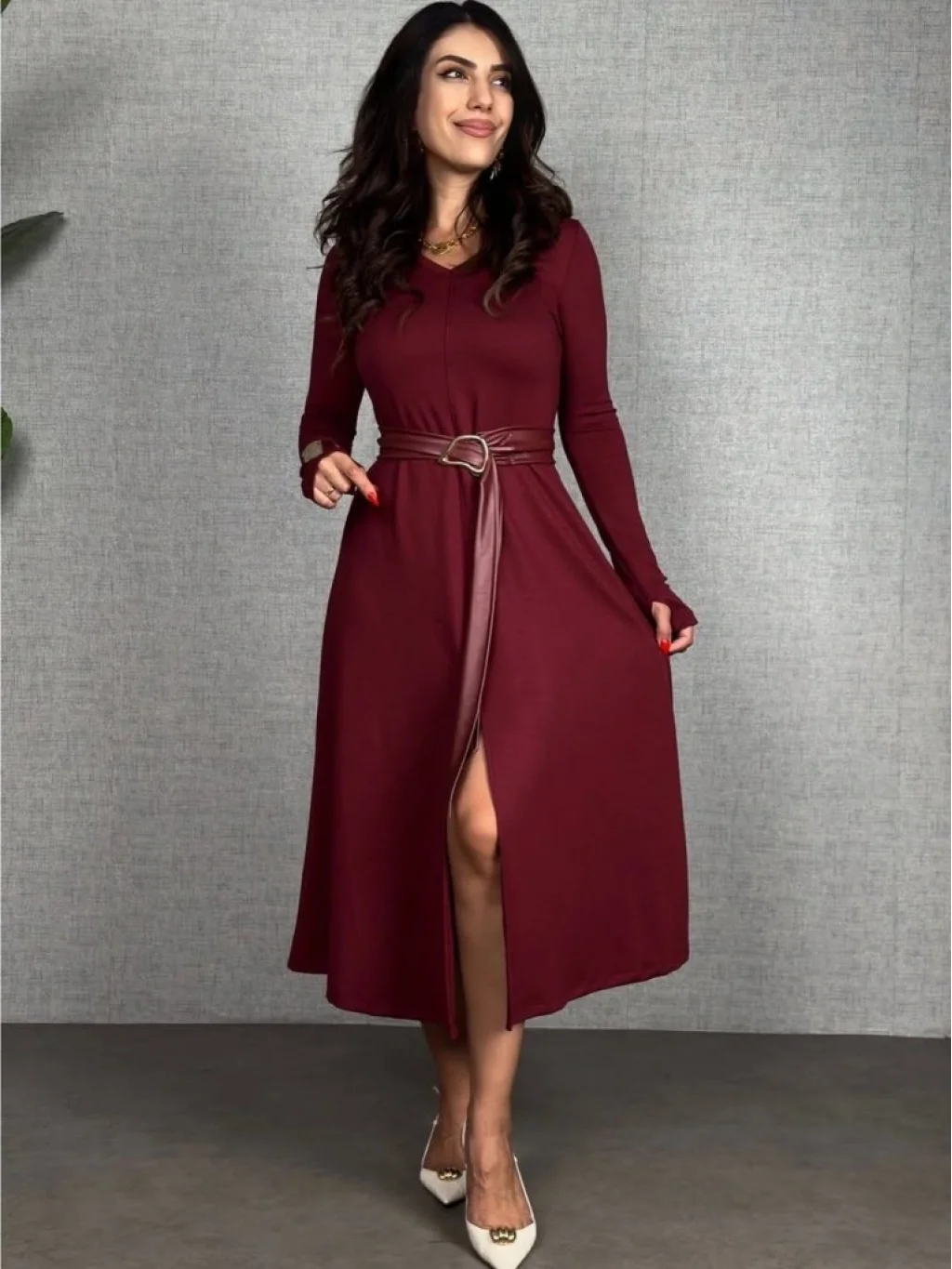 Kadın Uzun Kollu Yakalı Belden Deri Detaylı Kuşaklı Yırtmaçlı Midi Viskon Iki Iplik Elbise