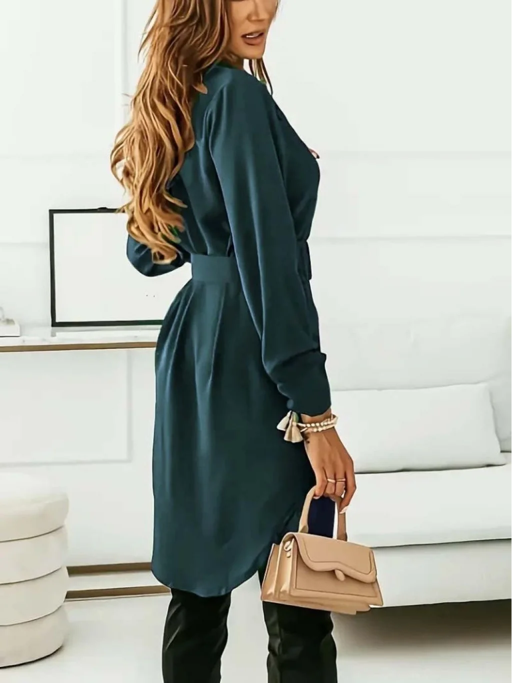 Kadın Uzun Kollu Yakalı Belden Kemerli Kıs Ithal Krep Elbise