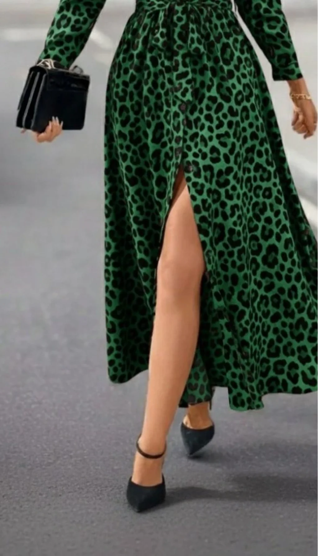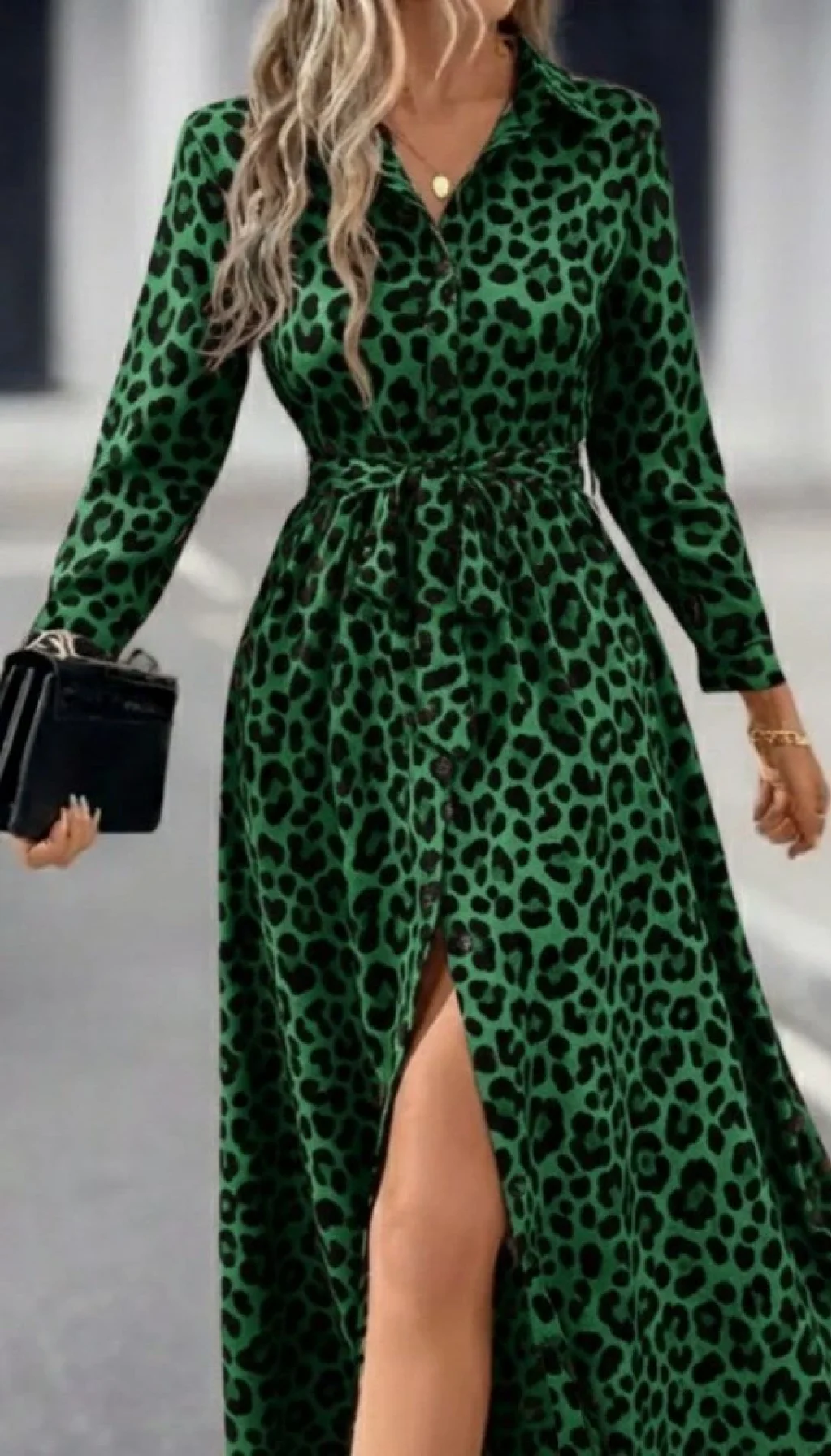 Kadın Uzun Kollu Yakalı Belden Kuşaklı Leopar Desenli Modal Uzun Elbise