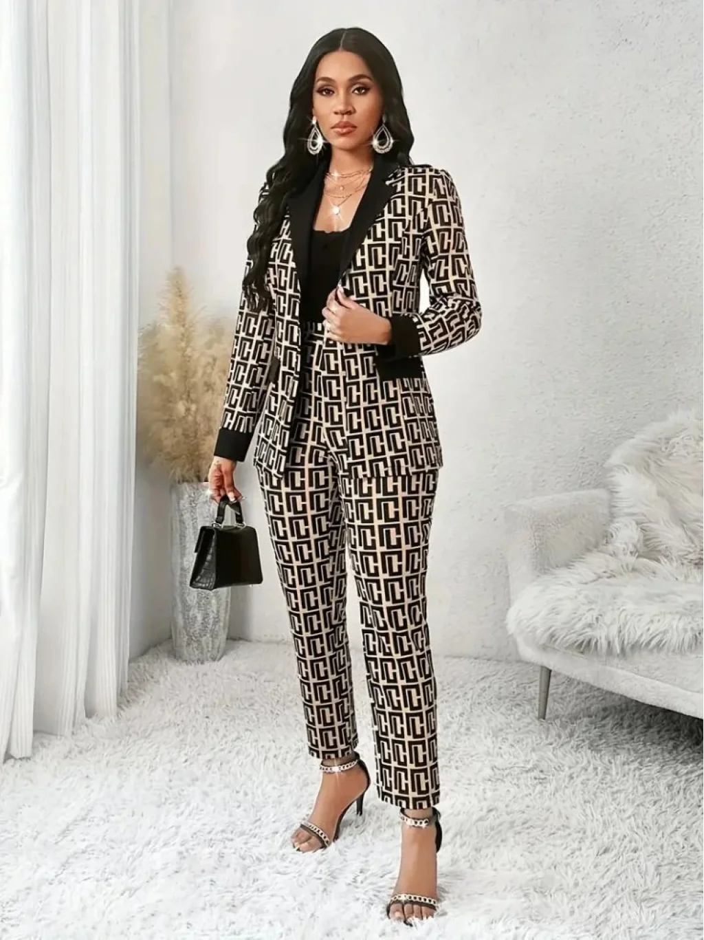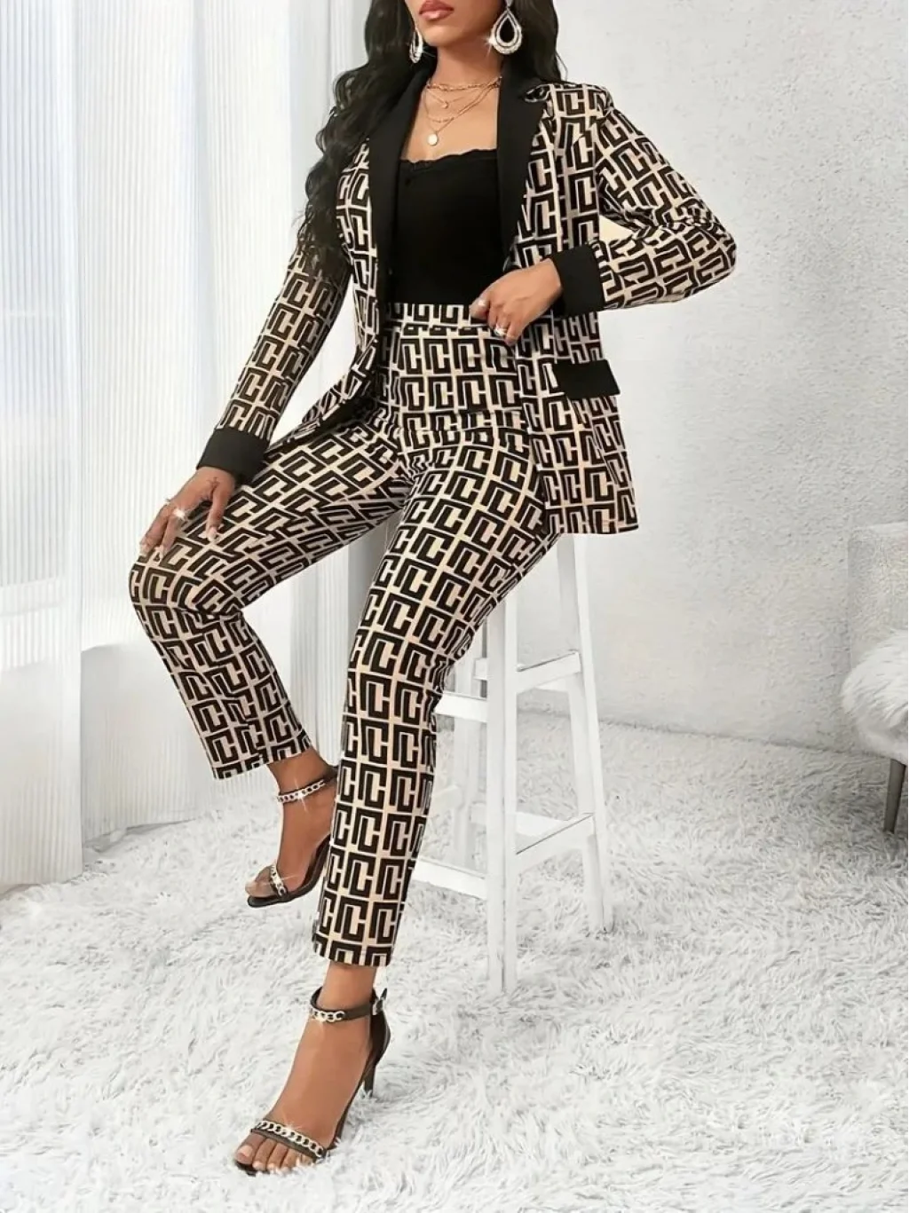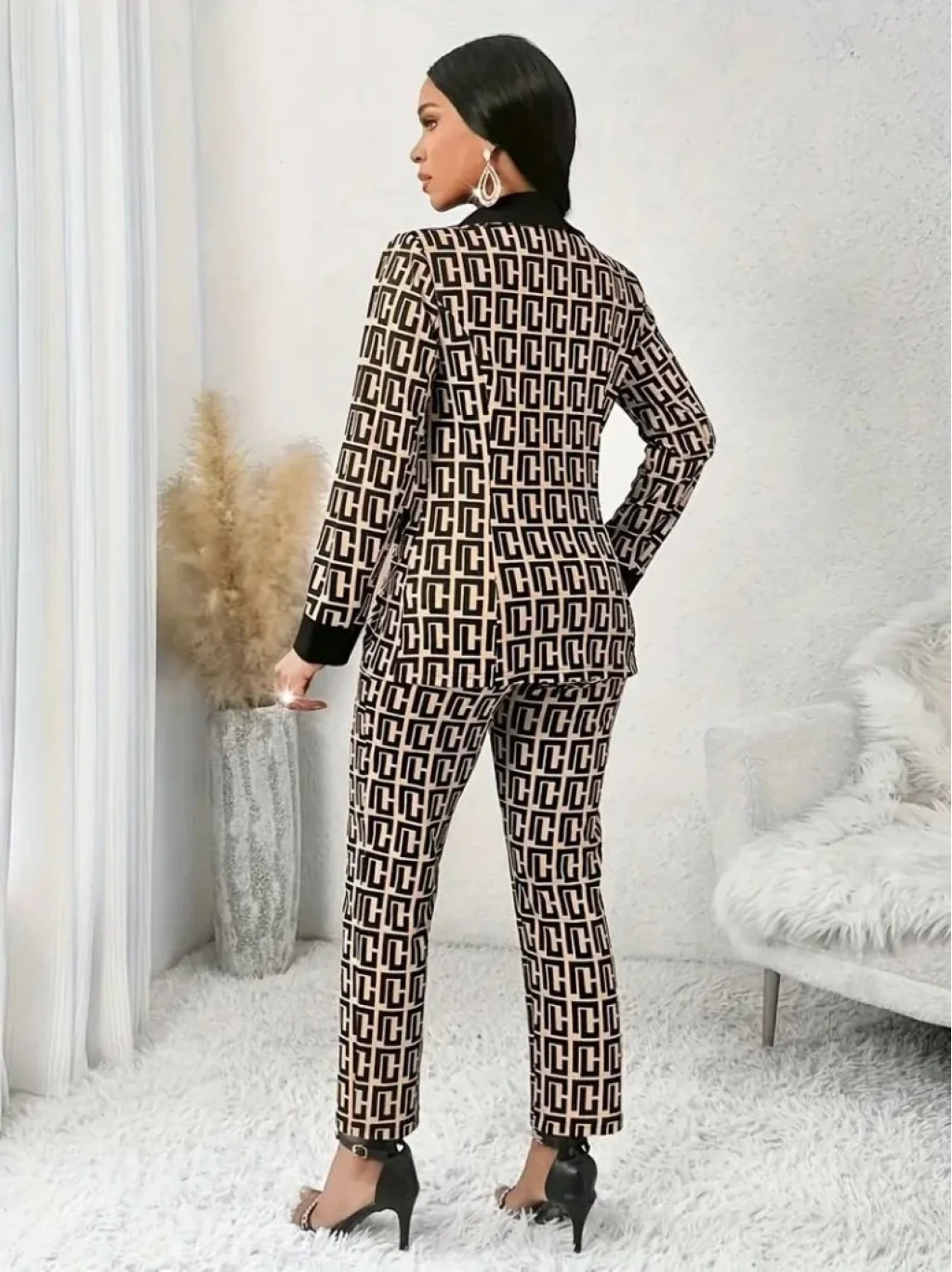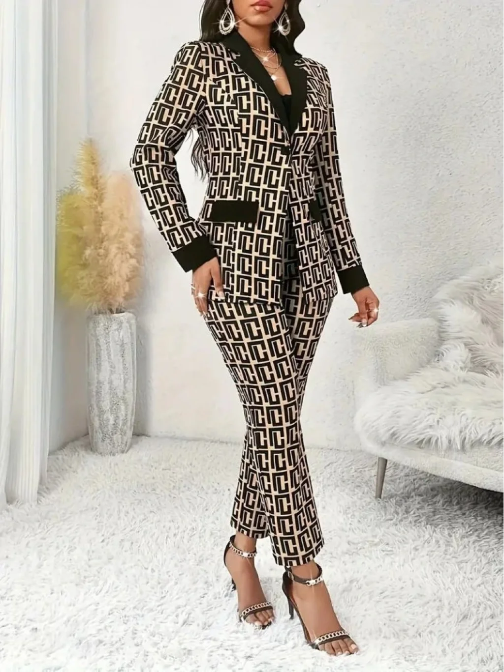 Kadın Uzun Kollu Yakalı Desenli Dalgıç Ceket Bluz Ve Pantolon üçlü Takım