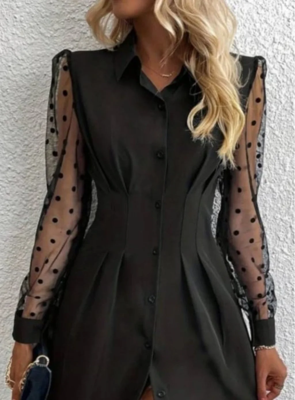 Kadın Uzun Kollu Yakalı Düğmeli Mini Ithal Krep Elbise