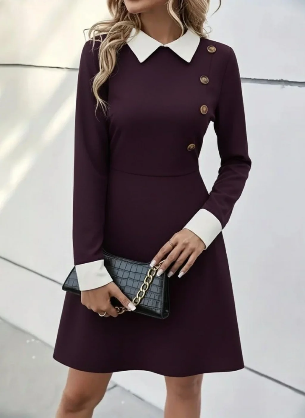 Kadın Uzun Kollu Yakalı Düğmeli Mürdüm Modal Mini Elbise
