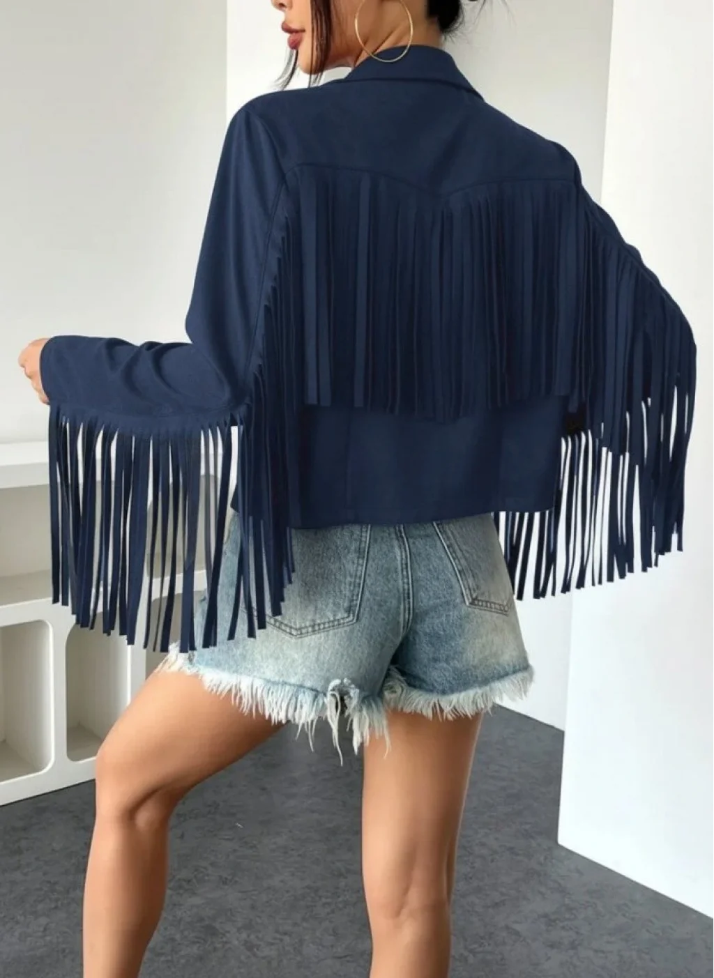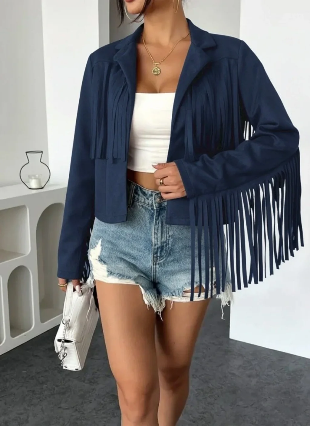 Kadın Uzun Kollu Yakalı Kısa Püsküllü Süet Ceket