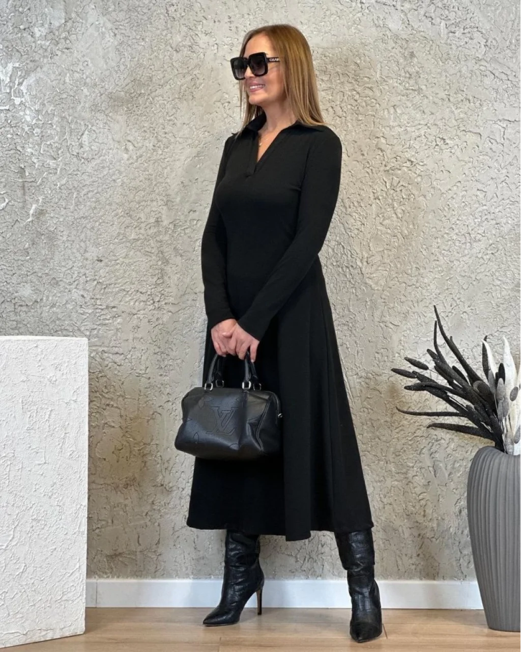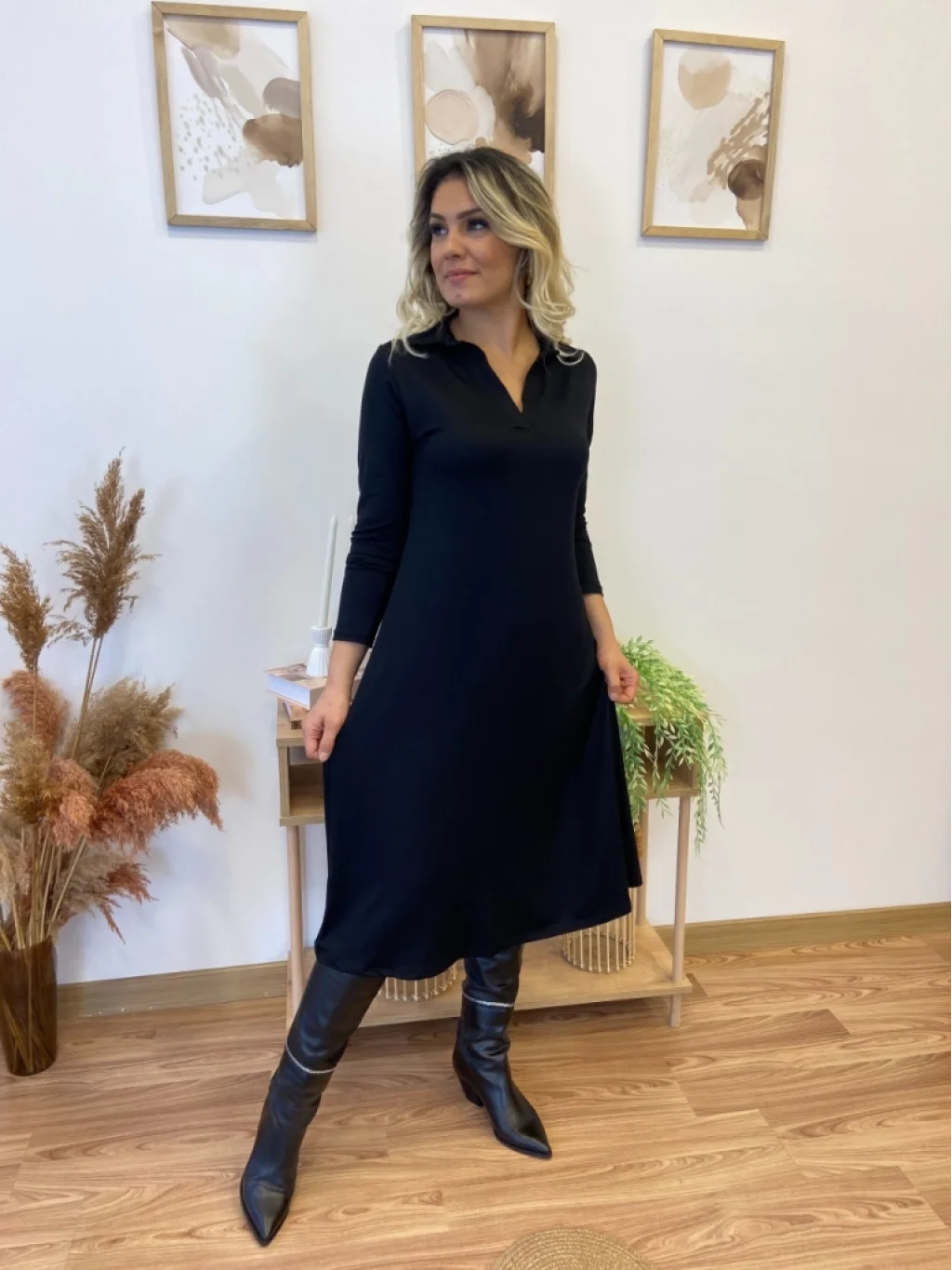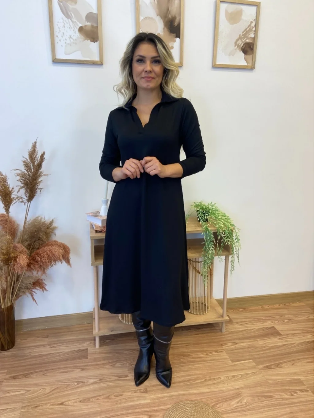Kadın Uzun Kollu Yakalı Midi Viskon Iki Iplik Elbise